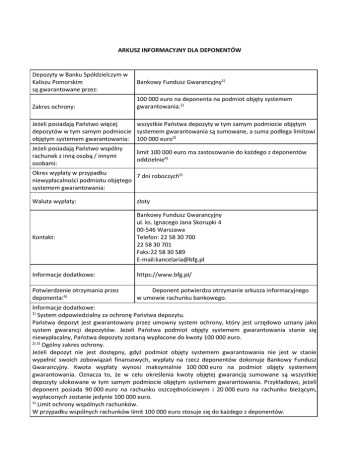ARKUSZ INFORMACYJNY DLA DEPONENTÓW Depozyty w Banku