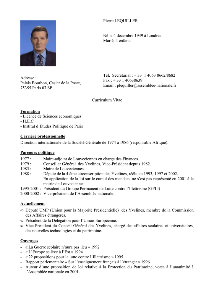 Pierre LEQUILLER Né le 4 décembre 1949 à Londres Marié, 4 enfants Adresse : Palais Bourbon, Casier de la Poste, 75355 Paris 07 SP Tél. Secrétariat : + 33 1 4063 8662/8682 Fax : + 33 1 40638639 Email : [email protected] Curriculum Vitae Formation - Licence de Sciences économiques - H.E.C - Institut d’Etudes Politique de Paris Carrière professionnelle Direction internationale de la Société Générale de 1974 à 1986 (responsable Afrique). Parcours politique 1977 : Maire-adjoint de Louveciennes en charge des Finances. 1979 : Conseiller Général des Yvelines, Vice-Président depuis 1982. 1985 : Maire de Louveciennes. 1988 : Député de la 4 ème circonscription des Yvelines, réélu en 1993, 1997 et 2002. En application de la loi sur le cumul des mandats, ne s’est pas représenté en 2001 à la mairie de Louveciennes 1995-2001 : Président du Groupe Permanent de Lutte contre l’Illettrisme (GPLI) 2000-2002 : Vice-président de l’Assemblée nationale. Actuellement • Député UMP (Union pour la Majorité Présidentielle) des Yvelines, membre de la Commission des Affaires étrangères. • Président de la Délégation pour l’Union Européenne. • Vice-Président du Conseil Général des Yvelines, chargé des affaires scolaires et universitaires, des nouvelles technologies et du patrimoine. Ouvrages - « La Guerre scolaire n’aura pas lieu » 1992 - « L’Europe se lève à l’Est » 1994 - « 22 propositions pour la lutte contre l’Illettrisme » 1995 - Rapport parlementaire « Sur l’enseignement français à l’étranger » 1996 - Auteur d’une proposition de loi relative à la Protection du Patrimoine, votée à l’unanimité à l’Assemblée nationale en 2001.