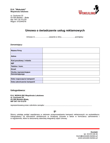 D.H. "Wokulski" Wspólnota lokalowa ul. Cechowa 22 43-300 Bielsko – Biała Nip: 547-19-15-279 Regon: 072344278 Umowa o świadczenie usług reklamowych Umowa nr............................zawarta w dniu...........................pomiędzy: Zamawiający: Nazwa firmy Adres Kod pocztowy i miasto NIP Telefon / kom. Email Osoby reprezentujące Zamawiającego Data rozpoczęcia kampanii Data zakończenia kampanii Usługodawca: D.H. WOKULSKI Wspólnota Lokalowa ul. Cechowa 22 43-300 Bielsko-Biała, NIP 547-19-15-279 reprezentowaną przez członków zarządu: ............................................................................................ §1 Strony ustalają podjąć współpracę w zakresie przeprowadzania kampanii reklamowych na wyświetlaczu Usługodawcy na warunkach określonych w niniejszej Umowie a także w formularzu zamówienia i w regulaminie, które to dokumenty stanowią integralną część Umowy. Kontakt tel. 33 815 08 45 [email protected] www.wokulski.bielsko.pl D.H. "Wokulski" Wspólnota lokalowa ul. Cechowa 22 43-300 Bielsko – Biała Nip: 547-19-15-279 Regon: 072344278 §2 Umowa zawarta jest na czas prowadzenia Kampanii reklamowej i wchodzi w życie z dniem podpisania przez strony. §3 W razie jakichkolwiek rozbieżności między treścią niniejszej Umowy, treścią Regulaminu, a treścią Zamówienia, za wiążące Strony uznają postanowienia Umowy. §4 Wszelkie oświadczenia Stron wymagają formy pisemnej pod rygorem nieważności. Strony są zobowiązane do informowania drugiej strony o zmianie adresu, numerów telefonu oraz e-mail. W przypadku naruszenia tego obowiązku korespondencję wysłaną na ostatni adres uważa się za skutecznie doręczoną. §5 Strony ustalają przeprowadzenie kampanii reklamowej na wyświetlaczu na opisanych poniżej warunkach: – Lokalizacja wyświetlacza: nad wejściem D. H. Wokulski od ul.11-tego Listopada. Czas trwania kampanii reklamowej Liczba kampanii Długość spotu w sekundach Minimalna ilość emisji dziennie Minimalna ilość emisji w kampanii Minimalna częstotliwość wyświetlania spotu / godz. Opłata za wykonanie spotu reklamowego Suma do zapłaty Okres rozliczeniowy Netto: VAT: 23% Brutto : miesięczny jednorazowy Warunki płatności §6 Zamawiający wyraża zgodę na zamieszczanie swoich danych osobowych w bazie Usługodawcy i wykorzystywanie ich w celach marketingowych D.H. Wokulski (zgodnie z ustawą z dn. 29.08.1997r. O ochronie danych osobowych, Dz. U.02.101.926 z pózn. zm.) z możliwością wglądu do swoich danych oraz prawem ich aktualizowania. §7 Zamawiający wyraża zgodę na otrzymywanie od Usługodawcy informacji handlowych w rozumieniu ustawy z dn. 18.07.2002r. O świadczeniu usług drogą elektroniczną (Dz. U. Nr. 144, poz. 1204). W ramach niniejszej umowy spot reklamowy Zamawiającego może zostać umieszczony na stronie Kontakt tel. 33 815 08 45 [email protected] www.wokulski.bielsko.pl D.H. "Wokulski" Wspólnota lokalowa ul. Cechowa 22 43-300 Bielsko – Biała Nip: 547-19-15-279 Regon: 072344278 internetowej Usługodawcy. Zamawiającywyraża zgodę na umieszczenie spotu spotu reklamowego na stronie internetowej Usługodawcy www.wokulski.bielsko.pl §8 Wszelkie spory wynikające z Umowy, Strony poddają pod rozstrzygnięcie sądu właściwego dla siedziby Usługodawcy. §9 Umowa jest sporządzona w dwóch egzemplarzach – po jednym dla każdej ze Stron. Podpisując niniejszą umowę Zamawiający akceptuje Regulamin prowadzenia kampanii reklamowych na wyświetlaczu Usługodawcy i oświadcza, iż treść Regulaminu jest mu znana. USŁUGODAWCA ZAMAWIAJĄCY .......................................................... .......................................................... Kontakt tel. 33 815 08 45 [email protected] www.wokulski.bielsko.pl
