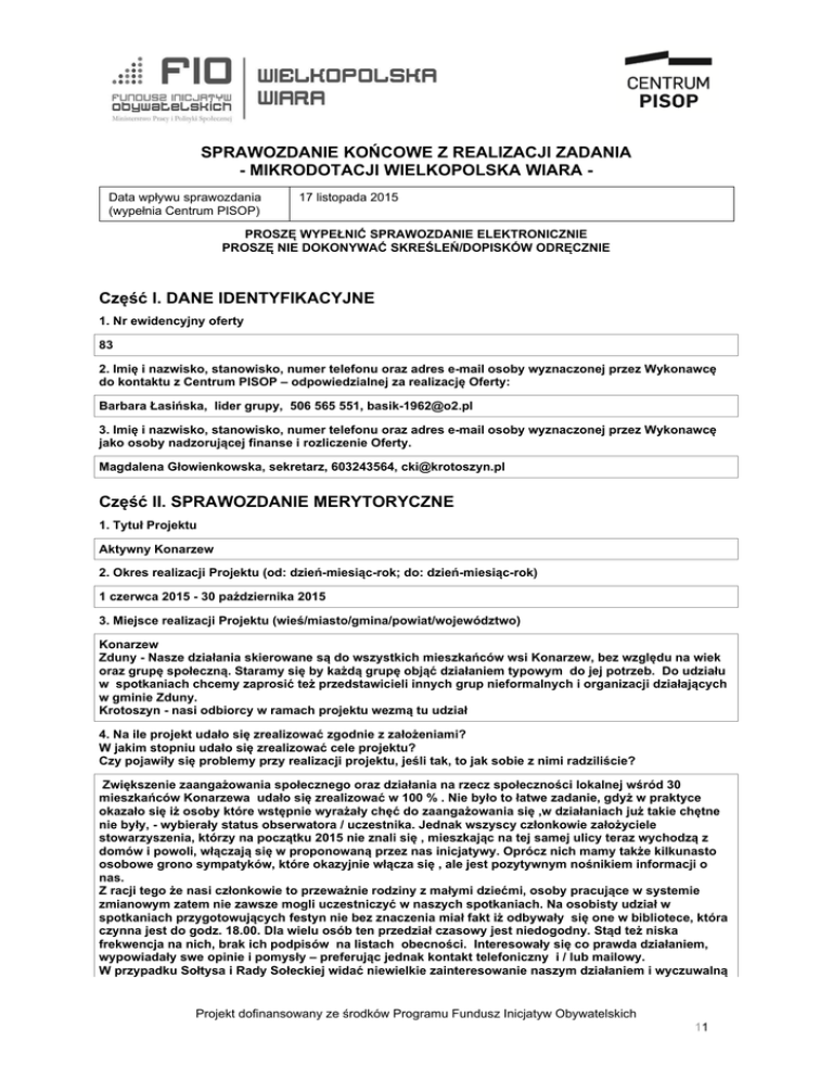SPRAWOZDANIE KOŃCOWE Z REALIZACJI ZADANIA - MIKRODOTACJI WIELKOPOLSKA WIARA Data wpływu sprawozdania (wypełnia Centrum PISOP) 17 listopada 2015 PROSZĘ WYPEŁNIĆ SPRAWOZDANIE ELEKTRONICZNIE PROSZĘ NIE DOKONYWAĆ SKREŚLEŃ/DOPISKÓW ODRĘCZNIE Część I. DANE IDENTYFIKACYJNE 1. Nr ewidencyjny oferty 83 2. Imię i nazwisko, stanowisko, numer telefonu oraz adres e-mail osoby wyznaczonej przez Wykonawcę do kontaktu z Centrum PISOP – odpowiedzialnej za realizację Oferty: Barbara Łasińska, lider grupy, 506 565 551, [email protected] 3. Imię i nazwisko, stanowisko, numer telefonu oraz adres e-mail osoby wyznaczonej przez Wykonawcę jako osoby nadzorującej finanse i rozliczenie Oferty. Magdalena Głowienkowska, sekretarz, 603243564, [email protected] Część II. SPRAWOZDANIE MERYTORYCZNE 1. Tytuł Projektu Aktywny Konarzew 2. Okres realizacji Projektu (od: dzień-miesiąc-rok; do: dzień-miesiąc-rok) 1 czerwca 2015 - 30 października 2015 3. Miejsce realizacji Projektu (wieś/miasto/gmina/powiat/województwo) Konarzew Zduny - Nasze działania skierowane są do wszystkich mieszkańców wsi Konarzew, bez względu na wiek oraz grupę społeczną. Staramy się by każdą grupę objąć działaniem typowym do jej potrzeb. Do udziału w spotkaniach chcemy zaprosić też przedstawicieli innych grup nieformalnych i organizacji działających w gminie Zduny. Krotoszyn - nasi odbiorcy w ramach projektu wezmą tu udział 4. Na ile projekt udało się zrealizować zgodnie z założeniami? W jakim stopniu udało się zrealizować cele projektu? Czy pojawiły się problemy przy realizacji projektu, jeśli tak, to jak sobie z nimi radziliście? Zwiększenie zaangażowania społecznego oraz działania na rzecz społeczności lokalnej wśród 30 mieszkańców Konarzewa udało się zrealizować w 100 % . Nie było to łatwe zadanie, gdyż w praktyce okazało się iż osoby które wstępnie wyrażały chęć do zaangażowania się ,w działaniach już takie chętne nie były, - wybierały status obserwatora / uczestnika. Jednak wszyscy członkowie założyciele stowarzyszenia, którzy na początku 2015 nie znali się , mieszkając na tej samej ulicy teraz wychodzą z domów i powoli, włączają się w proponowaną przez nas inicjatywy. Oprócz nich mamy także kilkunasto osobowe grono sympatyków, które okazyjnie włącza się , ale jest pozytywnym nośnikiem informacji o nas. Z racji tego że nasi członkowie to przeważnie rodziny z małymi dziećmi, osoby pracujące w systemie zmianowym zatem nie zawsze mogli uczestniczyć w naszych spotkaniach. Na osobisty udział w spotkaniach przygotowujących festyn nie bez znaczenia miał fakt iż odbywały się one w bibliotece, która czynna jest do godz. 18.00. Dla wielu osób ten przedział czasowy jest niedogodny. Stąd też niska frekwencja na nich, brak ich podpisów na listach obecności. Interesowały się co prawda działaniem, wypowiadały swe opinie i pomysły – preferując jednak kontakt telefoniczny i / lub mailowy. W przypadku Sołtysa i Rady Sołeckiej widać niewielkie zainteresowanie naszym działaniem i wyczuwalną Projekt dofinansowany ze środków Programu Fundusz Inicjatyw Obywatelskich 11 niechęć do współdziałania. Poproszone o pomoc, wsparcie w organizacji wydarzenia nie odmawiają, ale na promowanie aktywności obywatelskiej z ich strony są niewielkie szanse. 5. Ile osób ostatecznie uczestniczyło w projekcie (na podstawie dokumentacji)? Kim byli odbiorcy projektu? W jaki sposób zostali zachęceni/zrekrutowani do udziału w projekcie? Jakie zastosowano kryterium wyboru grupy? W projekcie brały udział organizacje pozarządowe grupy nieformalne oraz osoby fizyczne – w różnym wieku. - 4 NGO z terenu gminy Zduny uzyskały bezpośredni dostęp do wiedzy z zakresu aktywności obywatelskiej, możliwości aplikowania do wskazanych granto dawców, dowiedziały się o zmianach w Prawie o stowarzyszeniach a także możliwości i korzyściach płynących z tworzenia sieci NGO - 6 grup nieformalnych, z czego 2 wyraziły chęć podjęcia kroków do zarejestrowania się i działania jako stowarzyszenie. Osoby reprezentujące te grupy uzgodniły termin kolejnego spotkania celu orientacji procedury rejestracji, opracowania statutu , rozwiania wątpliwości związanych z funkcjonowanie organizacji. - 30 osób prywatnych – młodzież, dorośli oraz seniorzy działający w ramach naszej organizacji oraz osoby z nami sympatyzujące /które na obecną chwilę nie są jeszcze gotowe na wstąpienie w nasze szeregi /- od 13 lat do 50+ W zależności od realizacji działania włączały się w uczestnictwo bądź realizację. Ponadto ok. 250 osób było odbiorcami festynu / ilość określona na podstawie wydanych imienników-kotylionów / Do współpracy przy projekcie zaprosiliśmy 3 instytucje, które w ramach partnerstwa społecznego zadeklarowały pomoc w działaniu teraz i w przyszłości. Z kolejnymi 3 nawiązaliśmy kontakt w trakcie realizacji zadań. Były one pośrednimi odbiorcami naszych działań. 6. Jakie zadania zostały zrealizowane? Proszę zachować chronologię i nazwy zgodne z Ofertą. Nazwa zadania Spotkanie informacyjne z lokalnym samorządem oraz partnerami społecznymi. Projekt dofinansowany ze środków Programu Fundusz Inicjatyw Obywatelskich 22 Termin realizacji 09.06.2015, Konarzew Przebieg realizacji, co się działo? - w tym celu na spotkanie inauguracyjne zaprosiliśmy przedstawicieli lokalnych NGO i grup nieformalnych, aby poprzez nich dotrzeć do szerszego grona ich członków; zaproponować współpracę w realizacji wspólnych projektów oraz prosić / zaoferować wsparcie w pojedynczych działaniach. W reprezentantach lokalnego samorządu oraz instytucji upatrujemy naszych partnerów społecznych wspierających nasze inicjatywy oraz źródło wiedzy praktycznej, na które działania jest największe zapotrzebowanie społeczne. Lokalne media zaś zostały poproszone o relacjonowanie naszych działań ,