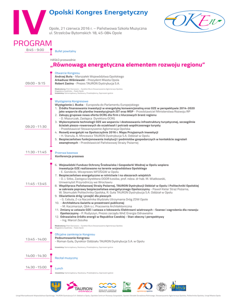 IV Opole, 21 czerwca 2016 r. – Państwowa Szkoła Muzyczna ul. Strzelców Bytomskich 18, 45-084 Opole PROGRAM 8:45 - 9:00 Bufet powitalny HASŁO przewodnie „Równowaga energetyczna elementem rozwoju regionu” 09:00 - 9:15 Otwarcie Kongresu Andrzej Buła - Marszałek Województwa Opolskiego Arkadiusz Wiśniewski - Prezydent Miasta Opola Robert Zasina - Prezes TAURON Dystrybucja S.A. Moderatorzy: Piotr Dancewicz – Dyrektor Biura Stowarzyszenia Aglomeracja Opolska Magdalena Szybińska – Radio Opole Uczestnicy: Samorządowcy, Naukowcy, Przedsiębiorcy, Zaproszeni goście 09:20 -11:30 11:30 -11:45 11:45 -13:45 Wystąpienia Kongresowe Wystąpienie J. Buzka - Europosła do Parlamentu Europejskiego 1. Źródła finansowania inwestycji w energetykę konwencjonalną oraz OZE w perspektywie 2014-2020 jako wsparcie dla planów inwestycyjnych JST oraz MSP - Przedstawiciel Ministerstwa Rozwoju RP 2. Zakupy grupowe nowa oferta OCRG dla firm z kluczowych branż regionu - D. Mazurczak, Zastępca Dyrektora OCRG 3. Wykorzystanie technologii OZE we wsparciu i dostosowaniu infrastruktury turystycznej, szczególnie ścieżek pieszo-rowerowych do oczekiwań i potrzeb współczesnego turysty - Przedstawiciel Stowarzyszenie Aglomeracja Opolska 4. Rozwój energetyki na Opolszczyźnie 2016 r. Mapa Przyjaznych inwestycji - H. Stanula, A. Mincewicz TAURON Dystrybucja S.A. Oddział w Opolu 5. Bezpieczeństwo funkcjonowania instytucji i podmiotów gospodarczych w kontekście zagrożeń zewnętrznych - Przedstawiciel Państwowej Straży Pożarnej Przerwa kawowa Konferencja prasowa 6. Wojewódzki Fundusz Ochrony Środowiska i Gospodarki Wodnej w Opolu wspiera inwestycje OZE realizowane na terenie województwa Opolskiego - E. Gondecki, Wiceprezes WFOŚiGW w Opolu 7. Bezpieczeństwo energetyczne w rolnictwie i na obszarach wiejskich - D. J. Sitko, Zastępca Dyrektora OODR Łosiów, prof. ndzw. dr hab. M. Wiatkowski, Uniwersytet Przyrodniczy we Wrocławiu 8. Współpraca Państwowej Straży Pożarnej, TAURON Dystrybucji Oddział w Opolu i Politechniki Opolskiej w zakresie poprawy bezpieczeństwa energetycznego Opolszczyzny - Paweł Kielar Straż Pożarna, W. Skomudek Politechnika Opolska, R. Guła TAURON Dystrybucja S.A. Oddział w Opolu 9. Oświetlenie dróg i przejść dla pieszych - G. Cebula, Z-ca Naczelnika Wydziału Utrzymania Dróg ZDW Opole 10.- Architektura światła w przestrzeni publicznej - M. Kaczmarzyk, Qbik s.c. Pracownia Architektoniczna 11. Zmiany w ustawie OZE i ustawa o lokowaniu Elektrowni wiatrowych - Szanse i zagrożenia dla rozwoju Opolszczyzny - P. Rudyszyn, Prezes zarządu W4E Energia Odnawialna 12. Odnawialne źródła energii w Republice Czeskiej - Stan obecny i perspektywy - Ing. Marcel Zezulka Moderatorzy: Piotr Dancewicz – Dyrektor Biura Stowarzyszenia Aglomeracja Opolska Magdalena Szybińska – Radio Opole 13:45 -14:00 Oficjalne zamknięcie Kongresu Podsumowanie Kongresu - Roman Guła, Dyrektor Oddziału TAURON Dystrybucja S.A. w Opolu Uczestnicy: Samorządowcy, Naukowcy, Przedsiębiorcy, Zaproszeni goście 14:00 -14:30 14:30 -15:00 Recital muzyczny Lunch Uczestnicy: Samorządowcy, Naukowcy, Przedsiębiorcy, Zaproszeni goście Urząd Marszałkowski Województwa Opolskiego, TAURON Dystrybucja S.A. Oddział w Opolu, Opolskie Centrum Rozwoju Gospodarki, Opolski Ośrodek Doradztwa Rolniczego, Stowarzyszenie Aglomeracja Opolska, Politechnika Opolska, Urząd Miasta Opola