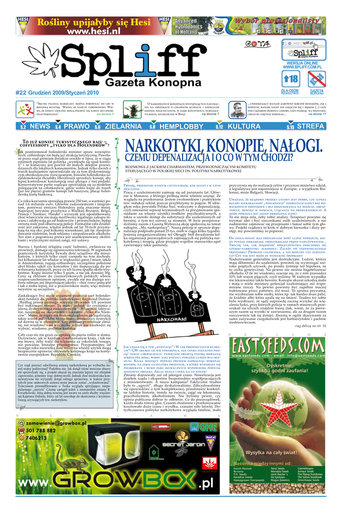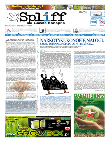 WERSJA ONLINE www.SPLIFF.com.PL #22 Grudzień 2009/Styczeń 2010 Gazeta Konopna “Skutki palenia marijuany można porównać do gry w rosyjską ruletkę. Wiemy, że niszczy chromosomy. Wiemy, że efekty uboczne mogą pojawić się nawet do czwartego pokolenia” na stronie 5 S.2 NEWS S.4 PRAWO S.6 Dla osób pełnoletnich S.8 HEMPLOBBY S.12 Jak poinformował holenderski minister spraw wewnętrznych, coffeeshopy nie będą już atrakcją turystyczną. Powołane przez rząd gremium doradcze orzekło w lipcu, że w ciągu ostatnich piętnastu lat polityka „wymknęła się spod kontroli” i że konieczny jest powrót do małych sklepów przewidzianych dla lokalnych konsumentów. Jednak tylko dwóch z trzech koalicjantów opowiedziało się za tym dyskryminującym obcokrajowców rozwiązaniem, bowiem holenderska socjaldemokracja chciałaby liberalizacji sprzedaży konopi, aby lepiej kontrolować konsumpcję oraz płynące z niej podatki. Konserwatywne partie rządzące opowiadają się za modelem polegającym na członkostwie, gdzie wolno kupić do trzech (już nie pięciu) gramów konopi lub haszyszu, płacąc holenderską kartą bankową. Proszę, przedstaw naszym czytelnikom, kim jesteś i w czym pracujesz... Pracą z uzależnionymi zajmuję się od parunastu lat. Głównie w Monarze, z którego próbują mnie właśnie usunąć. Ze względu na przekonania. Jestem zwolennikiem i praktykiem tzw. redukcji szkód, jeszcze przybliżymy to pojęcie. W ubiegłym roku powstała Polska Sieć, walczymy o depenalizację, czyli zniesienie represji kryminalnych za przyjmowanie (posiadanie na własny użytek) środków psychoaktywnych, a także o szeroki dostęp do substytucji dla uzależnionych od heroiny, o tym też szerzej za moment. W lecie przeprowadziliśmy razem z Gazetą Wyborczą akcję społeczną na temat nałogów, „My, narkopolacy”. Naszą petycję w sprawie depenalizacji podpisało ponad 25 tys. osób w ciągu kilku tygodni. Jesienią zorganizowaliśmy też Okrągły Stół dwudziestu kilku organizacji pozarządowych zajmujących się polityką narkotykową i terapią, gdzie przyjęto wspólne stanowisko-apel zawierający takie postulaty. Starsza i bardziej religijna część ludności, zwłaszcza na prowincji, domaga się ograniczenia tolerancji. W regionach granicznych turystyka bywała dość uciążliwa dla mieszkańców, z których tylko część czerpała na tym dochody. Już kilkanaście lat władze w większości gmin i miast, także w Amsterdamie, rugują coffeeshopy, szczególnie położone zbyt blisko szkół czy kościołów i nie dopuszczają do powstawania kolejnych, przez co ich liczna spadła około trzykrotnie. Kupić można tylko 5 gram, a nie jak dawniej 30g. Ceny są zbliżone do czarnorynkowych polskich; wbrew rozpowszechnionym opiniom, zwykle nie ma dużego wyboru odmian ani imponującej jakości – choć rzecz jasna jest i tak o nieba lepiej, niż u pracowników mafii, więc miliony turystów są szczęśliwe. Zaskakujący być może argument podniósł szef holenderskiej fundacji ds. polityki narkotykowej Raymond Dufour: „Według prawa unijnego wszyscy obywatele UE powinni być traktowani równo. Tu mamy jednak do czynienia z jawną dyskryminacją cudzoziemców”. Właściwie faktycznie, nasuwają się skojarzenia z lokalami „tylko dla Niemców”. Mimo, że nigdy nie brakowało głosów za legalizacją, także wśród polityków, to nie Stany; zwolennicy restrykcji od dawna są w ofensywie. Czy premier przeforsuje zmianę, nie wiadomo – na wycieczkę jednak nie zaszkodzi się wybrać, wiadomo, podróże kształcą. Cały czas nic nie grozi za uprawę do pięciu roślin w domu. Oczywiście, jak w każdym cywilizowanym kraju, i tak nie ma mowy, żeby trafić do więzienia za cokolwiek innego, niż poważne, brutalne przestępstwo. Przypomnijmy, od nowego roku niewielką ilość roślin na własny użytek mogą bezpiecznie uprawiać obywatele kolejnego kraju na kontynencie europejskim: Republiki Czeskiej. STREFA przyczynia się do realizacji celów i przynosi mnóstwo szkód, a legislatywa jest najostrzejsza w Europie, z wyjątkiem Białorusi, może Bułgarii, Słowacji. Uważasz, że rządowy projekt ustawy jest dobry, czy lepsza byłaby niekaralność „posiadania” osobistych ilości bez dodatkowych obostrzeń i bez obszukiwania na mieście, aresztowań, rewizji w domach, ciągania po prokuratorach? A może powinna być jasno określona ilość? To nie moja rola, żeby robić analizy. Terapeuci powinni się trzymać idei i być rzecznikami osób uzależnionych, a nie nadmiernie zajmować się przepisami i łamać sobie tym głowy. Projekt rządowy to krok w dobrym kierunku i duży postęp, my powinniśmy to popierać. Do zioła ponoć raz przejawiasz dość luźne podejście, kiedy indziej odradzasz, przestrzegasz przed nadużywaniem... Trochę tak, jak większość społeczeństwa podchodzi do używki-narkotyku alkoholu. Zależy od indywidualnego przypadku? Problem człowieka, a nie rośliny czy substancji? Czy tak jest może ze wszelkimi środkami? Nadużywanie generalnie jest destrukcyjne. Ludzie, którzy mają skłonności do uzależnień, powinni się wystrzegać szeroko pojętych używek, po prostu (istnieje też hipoteza, że to cecha genetyczna). Na pewno nie można bagatelizować alkoholu. O ile mi wiadomo, szacuje się, że z nim przesadza 10% lub więcej pijących, czyli miliony. W żadnym wypadku nie lekceważmy także heroiny. Konopie akurat szkodzą mało i mają o wiele mniejszy potencjał uzależniający niż wspomniane rzeczy. Na pewno powinny być zupełnie inaczej traktowane przez państwo, niż teraz. To sprawa prywatna, nie wyobrażam sobie osoby, która np. tak bardzo musi palić, że kradnie albo która upala się na śmierć. Trudno też sobie było wyobrazić, że sądy naprawdę zaczną wysyłać do więzienia ludzi, przy których policja w ramach masowych przeszukań na ulicach znajdzie trawę (tak, wiem, że za pierwszy