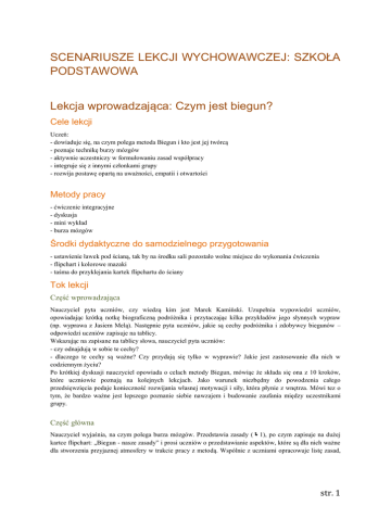 SCENARIUSZE LEKCJI WYCHOWAWCZEJ: SZKOŁA PODSTAWOWA Lekcja wprowadzająca: Czym jest biegun? Cele lekcji Uczeń: - dowiaduje się, na czym polega metoda Biegun i kto jest jej twórcą - poznaje technikę burzy mózgów - aktywnie uczestniczy w formułowaniu zasad współpracy - integruje się z innymi członkami grupy - rozwija postawę opartą na uważności, empatii i otwartości Metody pracy - ćwiczenie integracyjne - dyskusja - mini wykład - burza mózgów Środki dydaktyczne do samodzielnego przygotowania - ustawienie ławek pod ścianą, tak by na środku sali pozostało wolne miejsce do wykonania ćwiczenia - flipchart i kolorowe mazaki - taśma do przyklejania kartek flipchartu do ściany Tok lekcji Część wprowadzająca Nauczyciel pyta uczniów, czy wiedzą kim jest Marek Kamiński. Uzupełnia wypowiedzi uczniów, opowiadając krótką notkę biograficzną podróżnika i przytaczając kilka przykładów jego słynnych wypraw (np. wyprawa z Jasiem Melą). Następnie pyta uczniów, jakie są cechy podróżnika i zdobywcy biegunów – odpowiedzi uczniów zapisuje na tablicy. Wskazując na zapisane na tablicy słowa, nauczyciel pyta uczniów: - czy odnajdują w sobie te cechy? - dlaczego te cechy są ważne? Czy przydają się tylko w wyprawie? Jakie jest zastosowanie dla nich w codziennym życiu? Po krótkiej dyskusji nauczyciel opowiada o celach metody Biegun, mówiąc że składa się ona z 10 kroków, które uczniowie poznają na kolejnych lekcjach. Jako warunek niezbędny do powodzenia całego przedsięwzięcia podaje konieczność rozwijania własnej motywacji i siły, która płynie z wnętrza. Mówi tez o tym, że bardzo ważne jest lepszego poznanie siebie nawzajem i budowanie zaufania między uczestnikami grupy. Część główna Nauczyciel wyjaśnia, na czym polega burza mózgów. Przedstawia zasady (1), po czym zapisuje na dużej kartce flipchart: „Biegun - nasze zasady” i prosi uczniów o przedstawianie aspektów, które są dla nich ważne dla stworzenia przyjaznej atmosfery w trakcie pracy z metodą. Wspólnie z uczniami opracowuje listę zasad, str. 1 które są spisywane na dużej kartce flipchart, a następnie – powieszone w widocznym miejscu. Zadaniem nauczyciela jest inspirowanie uczniów i zachęcanie do wyrażania potrzeb. Nauczyciel prosi uczniów o wstanie z miejsc i zamknięcie oczu. Następnie przedstawia reguły ćwiczenia: „Teraz, chodząc powoli, znajdźcie kogoś i bardzo delikatnie złapcie go za rękę. Uważajcie na każdy krok, bądźcie uważni i skupieni, nie otwierajcie oczu ani nie wydawajcie dźwięków. Postarajcie się wspólnie stworzyć krąg, tak, by wszystkie osoby były połączone”. Część podsumowująca Uczniowie dzielą się wnioskami i odczuciami płynącymi z ćwiczenia. Nauczyciel podsumowuje informacje przedstawione na lekcji, zwracając uwagę na znaczenie jakie ma kontakt, siła grupy, zaufanie do siebie nawzajem i dbanie o bezpieczeństwo swoje oraz pozostałych uczestników. Zadanie domowe Każdy z uczniów ma zadanie założenie oddzielnego zeszytu do pracy z metodą Biegun. Załącznik 1. Jak zorganizować burzę mózgów? (Załącznik nr 2 z Kursu dla nauczycieli) Krok 1: Odkryj swój biegun Cele lekcji Uczeń: - poznaje różne znaczenia słowa „biegun” - dowiaduje się, co słowo biegun oznacza w kontekście metody - określa, jakie znaczenie w życiu człowieka mają cele, marzenia, wyzwania - definiuje swój cel, Biegun i zapisuje go w dzienniku Metody pracy - ćwiczenie relaksacyjne - burza mózgów - praca w parach - praca indywidualna, poprzedzona relaksacją Środki dydaktyczne do samodzielnego przygotowania - flipchart - kolorowe flamastry - kartki - długopisy lub ołówki dla każdego Tok lekcji Część wprowadzająca Nauczyciel prowadzi krótkie ćwiczenie oddechowe. Mówi: „Usiądź wygodnie, tak by obie stopy znajdowały się na podłodze. Zamknij oczy. Zwróć uwagę na dźwięki, które są wokół. Co słyszysz? Teraz zwróć uwagę na siebie. Jak oddychasz? Szybko czy wolno? Nic nie rób ze swoim oddechem, nie zmieniaj go – po prostu obserwuj. Zwróć uwagę na to, w jaki sposób wdychasz i wydychasz powietrze. Czy powietrze jest takie samo str. 2 przy wdechu jak przy wydechu? Jest ciepłe czy zimne? Teraz weź głęboki wdech i poczuj, jak powietrze cię wypełnia. Dokąd wędruje? Jak się z tym czujesz? Pobądź chwilę ze swoim oddechem a kiedy będziesz gotowy – otwórz oczy.” Część główna Nauczyciel staje przy flipcharcie, zapisuje na nim „biegun” i pyta uczniów, z czym kojarzy im się to słowo. Wszystkie odpowiedzi są zapisywane, tworząc mapę skojarzeń. Nauczyciel wiesza mapę na ścianie i opowiada o tym, czym jest biegun wg metody. Uczniowie dobierają się w pary, w których poszukują odpowiedzi na pytanie: „Co mogłoby być moim biegunem? Co jest dla mnie ważne? Do czego chcę dążyć? O czym marzę?”. Następnie każdy z uczniów w ciszy zapisuje refleksje w swoim dzienniku. Nauczyciel notuje na tablicy pytania pomocnicze: Co jest Twoim Biegunem? Do czego dążysz? Czego pragniesz? Co jest Twoim największym marzeniem? Co chciałbyś osiągnąć? Kim być? Nazwij swój Biegun. Część podsumowująca Nauczyciel pyta uczniów o odczucia związane z pracą w parach. Zadaje im pytania: Co was zaskoczyło w tym ćwiczeniu? Co było dla was nowe? Co jest ciekawe? Czy mieliście z czymś kłopot? Chętne osoby mogą podzielić się refleksją zapisaną w dzienniku. Rolą nauczyciela jest zadbanie o komfort uczniów, tak by uczyli się otwartości, wyrażania potrzeb i dzielenia tym, co jest dla nich ważne. Istotne jest pilnowanie przestrzegania przez grupę zasad, które zostały sformułowane podczas lekcji wprowadzającej do pracy z metodą. Zadanie domowe Na flipcharcie nauczyciel rysuje wzór – „obszary naszych marzeń” (2). Objaśnia obszary. Podaje instrukcję: “Waszym zadaniem jest stworzenie w domu osobistej mapy marzeń, przy wykor
