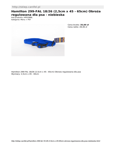 http://sklep.canifel.pl Hamilton 299-FAL 18/26 (2,5cm x 45 - 65cm) Obroża regulowana dla psa - niebieska kod produktu: HP0196BL kategoria: Menu > PSY Cena brutto: 35,00 zł Cena netto: 28,46 zł Hamilton 299-FAL 18/26 (2,5cm x 45 - 65cm) Obroża regulowana dla psa Wymiary: 2,5cm x 45 - 65cm http://sklep.canifel.pl/hamilton-299-fal-18-26-2-5cm-x-45-65cm-obroza-regulowana-dla-psa-niebieska.html