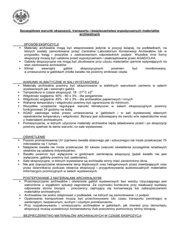 Szczegółowe warunki ekspozycji, transportu i bezpieczeństwa wypożyczanych materiałów archiwalnych SPOSÓB EKSPOZYCJI Materiały archiwalne mogą być eksponowane jedynie w pozycji leżącej, na podkładkach, na których zostały zamontowane przez Centralne Laboratorium Konserwacji Archiwaliów lub w przypadku ksiąg i poszytów z zastosowaniem odpowiednich podpór. Wszelkie inne formy ekspozycji muszą być ustalone przed wypożyczeniem i zaakceptowane przez AGAD/CLKA. Gabloty ekspozycyjne nie mogą być zbudowane przy użyciu materiałów ujemnie wpływających na stan zachowania archiwaliów. Klimat wewnątrz gablot ekspozycyjnych powinien być monitorowany, a umieszczone w gablotach źródła światła nie powinny emitować ciepła. WARUNKI KLIMATYCZNE W SALI WYSTAWOWEJ Materiały archiwalne powinny być eksponowane w stabilnych warunkach zarówno w salach wystawowych jak i wewnątrz gablot. Temperatura w czasie ekspozycji: 18 - 210 C ±20 Wilgotność względna: 50% - 60 ± 3% - dla pergaminów Wilgotność względna: 45% - 50 ± 3% - dla archiwaliów papierowych i innych Wahania temperatury i wilgotności powinny być ograniczone do minimum. Wszystkie urządzenie regulujące warunki klimatyczne w salach ekspozycyjnych powinny funkcjonować 24 godziny na dobę. AGAD zastrzega sobie prawo umieszczenia w gablotach i w sali wystawowej własnych rejestratorów temperatury i wilgotności. Biorący jest zobowiązany do zwrotu w/w rejestratorów wraz z materiałami archiwalnymi. Pomieszczenia, w których użyczone materiały archiwalne będą składowane przed i po ekspozycji powinny spełniać te same warunki, co sale wystawowe. OŚWIETLENIE Poziom promieniowania UV (zarówno światła dziennego jak i sztucznego) nie może przekraczać 75 mikrowatów na 1 lumen. Natężenie światła nie może przekraczać 50 luksów (warunki oświetlenia szczególnie wrażliwych obiektów są ustalane indywidualnie). Światło powinno być wyłączone w godzinach zamknięcia ekspozycji (jeżeli światło nie jest wyłączane, gabloty powinny być zasłaniane). Sale ekspozycyjne, w których wystawiane są archiwalia winny mieć zaciemnione okna. Nie jest dopuszczalne stosowanie lamp błyskowych oraz halogenowych przez zwiedzających oraz przez dziennikarzy podczas otwarcia ekspozycji i przygotowywania audiowizualnych materiałów informacyjno promocyjnych w salach wystawowych. POSTEPOWANIE Z MATERIAŁAMI ARCHIWALNYMI Przemieszczanie archiwaliów i otwieranie gablot wystawowych bez wiedzy Użyczającego jest zabronione z wyjątkiem sytuacji zagrożenia. Za czynności konieczne przy ewakuacji wystawy odpowiada strona biorąca - pracownicy zajmujący się konserwacją lub zabezpieczaniem materiałów archiwalnych. Archiwaliów nie wolno zdejmować z podkładek, na których są zamontowane i z podpór. Opakowania transportowe muszą być przechowywane (do czasu transportu zwrotnego) w zamkniętym, bezpiecznym, suchym i czystym pomieszczeniu. Przy rozpakowywaniu i umieszczaniu archiwaliów w gablotach, jak również przy demontażu ekspozycji muszą uczestniczyć konserwatorzy i/lub pracownicy pomocniczy strony biorącej. BEZPIECZEŃSTWO MATERIAŁÓW ARCHIWALNYCH W CZASIE EKSPOZYCJI Stan archiwaliów jest porównywany z opisami konserwatorskimi, co najmniej dwukrotnie, a w przypadku transportu przez firmę przewozową, czterokrotnie (przed transportem, po transporcie, po ekspozycji i po transporcie zwrotnym). Protokół stanu zachowania archiwaliów podpisywany jest przez upoważnionych konserwatorów obu stron. W szczególnych wypadkach dopuszcza się podpisanie protokołu stanu zachowania przez inne upoważnione osoby. Strona biorąca powinna poinformować AGAD o warunkach ekspozycji (miejsce ekspozycji, zabezpieczenia antywłamaniowe, gabloty, oświetlenie, warunki klimatyczne etc.) – poprzez wypełnienie kwestionariusza dotyczącego warunków wystawienniczych i konserwatorskich w planowanym miejscu ekspozycji. Obiekty zwracane są przez biorącego wraz z kompletnym opakowaniem. Archiwalia winny być eksponowane w zamykanych gablotach (wskazane przez AGAD szczególnie wartościowe materiały powinny być eksponowane w gablotach z wewnętrznym systemem alarmowym) w pomieszczeniach monitorowanych/chronionych przez strażnika 24 h na dobę. Gabloty wystawowe można otwierać wyłącznie przy użyciu przeznaczonych do tego narzędzi. Pomieszczenia wystawowe muszą być chronione w ciągu dnia i w nocy oraz muszą być wyposażone w alarm przeciw pożarowy i system przeciw włamaniowy. BEZPIECZEŃSTWO MATERIAŁÓW ARCHIWALNYCH PODCZAS TRANSPORTU Materiały archiwalne powinny być transportowane przez wyspecjalizowanego przewoźnika. W szczególnych przypadkach dopuszcza się transport własny, o ile spełnia on warunki bezpieczeństwa. Przygotowanie (opakowanie) archiwaliów do transportu wykonuje Centralne Laboratorium Konserwacji Archiwaliów lub wyspecjalizowany przewoźnik. Materiały przewożone są drogą lądową w samochodzie w opakowaniu transportowym zapewniającym ochronę przed uszkodzeniami mechanicznymi, wibracjami oraz zmianami temperatury i wilgotności. Materiały archiwalne szczególnie wartościowe i wrażliwe na zmiany warunków zewnętrznych (np. dokumenty pergaminowe) powinny mieć zapewniony transport w specjalnej skrzyni klimatycznej, aklimatyzowanej przed i po transporcie, oraz w skrzyni niepalnej. Szczegółowe wymagania dotyczące zabezpieczeń i izolacji termicznej na czas transportu są określane każdorazowo przez pracowników CLKA w zależności od formy, stanu zachowania oraz rodzaju materiału wypożyczanych archiwaliów. Samochód do przewozu wypożyczanych materiałów powinien być wyposażony w niezbędne do unieruchomienia skrzyni pasy i zaczepy w kabinie transportowej oraz w klimatyzację (zwłaszcza kiedy obiekty pergaminowe i oprawne w skórę przewożone są bez specjalistycznej skrzyni klimatycznej). W przypadku transportu lotniczego dopuszcza się przelot archi