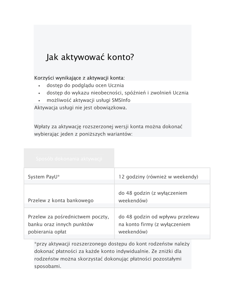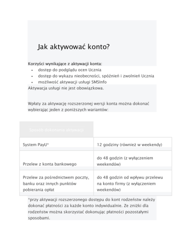 Jak aktywować konto? Korzyści wynikające z aktywacji konta: • dostęp do podglądu ocen Ucznia • dostęp do wykazu nieobecności, spóźnień i zwolnień Ucznia • możliwość aktywacji usługi SMSInfo Aktywacja usługi nie jest obowiązkowa. Wpłaty za aktywację rozszerzonej wersji konta można dokonać wybierając jeden z poniższych wariantów: Sposób dokonania aktywacji System PayU* Maksymalny czas uruchomienia aktywacji 12 godziny (również w weekendy) do 48 godzin (z wyłączeniem Przelew z konta bankowego weekendów) Przelew za pośrednictwem poczty, do 48 godzin od wpływu przelewu banku oraz innych punktów na konto firmy (z wyłączeniem pobierania opłat weekendów) *przy aktywacji rozszerzonego dostępu do kont rodzeństw należy dokonać płatności za każde konto indywidualnie. Ze zniżki dla rodzeństw można skorzystać dokonując płatności pozostałymi sposobami. Należy również pamiętać, że rodzeństwo powinno uczęszczać do tej samej placówki korzystającej z e-Dziennika. Sposób aktywacji konta: 1. Po zalogowaniu się do e-Dziennika kliknij przycisk AKTYWUJ lub PRZEDŁUŻAM 2. Następnie wybierz odpowiedni sposób dokonania płatności. a) wpłacając poprzez serwis PayU należy postępować według wskazówek podanych przez system b) dane do wpłaty dokonanej bezpośrednio na konto firmy Librus Aktywacja konta: Dane do przelewu: Bank Millennium Numer konta: 88 1160 2202 0000 0000 9523 4014 LIBRUS LIBRUS 4040-153 Katowice, al. Korfantego 193 Opis przelewu musi zawierać NUMER WYGENEROWANEJ TRANSAKCJI, IMIĘ i NAZWISKO UCZNIA oraz KLASĘ Przykład prawidłowego tytułu przelewu w przypadku opłaty dla jednego Ucznia: 1001/13/145/26 Jan Nowak 2c, gdzie: 1001/13/145/26 1001/13/145/26 – numer transakcji, Jan Nowak – imię i nazwisko ucznia, 2c – klasa do której uczęszcza Przykład prawidłowego tytułu przelewu w przypadku opłaty dla rodzeństw: 1001/13/145/27 Jan Nowak 2c, Patrycja Nowak 4a Zapłaciłem za aktywację konta. Jak długo mam czekać na jego aktywowanie? Opłata za aktywacje konta może od Państwa zostać pobrana na kilka różnych sposobów. W zależności od metody płatności preferowanych w poszczególnych placówkach szkolnych, czas potrzebny do aktywacji Państwa konta jest różny. Aby konto zostało aktywowane muszą zostać spełnione następujące warunki: • dokonali Państwo opłaty; • opłata ta zostanie zaksięgowana na naszym koncie; • pracownik firmy lub sam system dokona aktywacji Państwa konta. Poniżej przedstawione zostały wszystkie możliwości. Czas transferu pieniędzy liczony jest od chwili dokonania przez Państwa opłaty do momentu zaksięgowania wpłaty na naszym koncie. Czas do aktywacji konta liczony jest od momentu zaksięgowania wpłaty na naszym koncie do chwili, w której konto zostanie zaktywowane. 1. Płatność elektroniczna za pośrednictwem płatności.pl (przelew elektroniczny, karta kredytowa, itp.) Czas transferu pieniędzy: natychmiast* natychmiast Czas do aktywacja konta: natychmiast* natychmiast 2. Płatność przelewem z wykorzystanie konta elektronicznego Czas transferu pieniędzy: do 24 godzin Czas aktywacji konta: do 48 godzin z wyłączeniem weekendów 3. Płatność przelewem za pośrednictwem poczty, banku oraz innych punktów pobierania opłat z wykorzystaniem druczku wpłaty Czas transferu pieniędzy: od 24 nawet do kilku dni** dni Czas aktywacji konta: do 48 godzin z wyłączeniem weekendów 4. Płatność gotówką w szkole (np. przez Radę Rodziców) Czas transferu pieniędzy: nieokreślony, zależy od Dyrektora placówki i/lub Rady Rodziców *** Czas aktywacji konta: do 48 godzin z wyłączeniem wyłączeniem weekendów * W tym przypadku aktywacja czasami może potrwać od kilku sekund do nawet kilku godzin. Związane jest to nierzadko z obciążeniem systemów bankowych oraz łączy internetowych. ** Czas ten często uzależniony jest od pracy samych urzędów pocztowych, banków oraz innych instytucji pośredniczących w pobieraniu opłat oraz od procedur w nich obowiązujących. *** Zazwyczaj jest to klika dni. Więcej informacji można uzyskać w placówce szkolnej. Powrót ⇑⇑ Listy aktywacyjne Dodaj listę Od 15 sierpnia do 31 października 2014 roku obowiązuje promocja (22 zł zamiast 25 zł – wpłata indywidualna, 35 zł zamiast 38 zł za rodzeństwo) na aktywację dostępu rozszerzonego do kont w e-Dzienniku Librus. Promocja obejmuje wyłącznie aktywacje dokonane z wykorzystaniem mechanizmu LIST AKTYWACYJNYCH wypełnianych oraz przesyłanych przez szkołę drogą elektroniczną. Poniższy widok umożliwia tworzenie zbiorczych list elektronicznych z wpłatami za aktywację kont Rodzica/Ucznia. Listy można wypełniać za pomocą myszki lub posiłkować się czytnikiem kodów kreskowych. Jeżeli nie posiadacie Państwo kodów kreskowych w szkole, wówczas prosimy o kontakt z naszym biurem umożliwimy Państwu wypożyczenie czytnika na czas wprowadzania list do Systemu. Niezależnie od metody wprowadzania wpłat Rodziców, na jednej liście należy umieścić dane wszystkich Uczniów/Rodziców, dla których chcemy dokonać jednorazowej płatności. Tak przygotowaną listę należy przesłać elektronicznie za pośrednictwem systemu do firmy Librus. POMOCNE INSTRUKCJE • Instrukcja wypełniania oraz wysyłania list aktywacyjnych bez wykorzystania czytnika znajduje się tutaj • Instrukcja wypełniania oraz wysyłania list aktywacyjnych z wykorzystaniem czytnika znajduje się tutaj Regulamin "Promocyjna lista aktywacyjna" do pobrania znajduje się tutaj