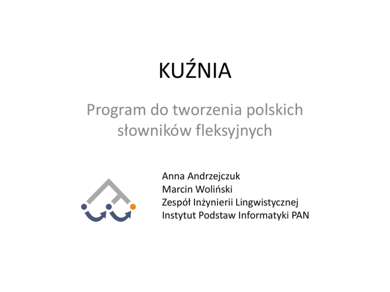 KUŹNIA Program do tworzenia polskich słowników fleksyjnych Anna Andrzejczuk Marcin Woliński Zespół Inżynierii Lingwistycznej Instytut Podstaw Informatyki PAN Podstawowe informacje ADRES: http://kuznia.ipipan.clarin-pl.eu/ Jan Szejko Cesar, Clarin Słownika gramatycznego języka polskiego Z. Saloniego, W. Gruszczyńskiego, M. Wolińskiego, R. Wołosza Analizatory morfologiczne – Morfeusz, Morfologik Hasło • hasła rzeczownikowe pisane z dywizem, tse-tse, herod-baba • hasła rzeczownikowe pisane z dywizem, w których odmienia się więcej niż jeden wyraz rozbija się na dwa oddzielne hasła, np. Skarżysko, Kamienna • zestawień leksemów przymiotnikowych typu polsko-angielski nie należy wpisywać do bazy, ponieważ pierwszy człon typu polsko+, jest notowany w paradygmatach odmiany przymiotników, które mogą wystąpić w takich złożeniach, a drugi człon typu angielski jest normalnie odmieniającym się przymiotnikiem • w przypadku czasowników zwrotnych w rubryce hasło pomijamy się. Samo się wybieramy z rozwijalnej listy dopiero w rubryce o nazwie zwrotność. Część mowy (1/2) • RZECZOWNIK (subst) • PRZYMIOTNIK (adj) – ładny Przymiotniki w stopniu wyższym (adjcom) – ładniejszy Przysłówek odprzymiotnikowy w stopniu równym (adv) – ładnie Przysłówek odprzymiotnikowy w stopniu wyższym (advcom) – ładniej Rzeczownik odprzymiotnikowy (osc) – ładność Części mowy (1/2) CZASOWNIK (v) – czytać • Gerundium (ger) – czytanie • Imiesłów przymiotnikowy bierny (ppas) – czytany • Imiesłów przymiotnikowy czynny (pact) – czytający • Quasi-imiesłów przymiotnikowy bierny (appas) – roześmiany ATRYBUTY PRZYMIOTNIKOWE FORMA ZŁOŻONA • Obecna – Dany leksem może występować w złożeniach, np. aborcyjny – aborcyjno+ (aborcyjnoantykoncepcyjna filantropia) • Nieobecna – Dany leksem nie występuje w złożeniach, np. blond, cacy FORMA POPRZYIMKOWA • Obecna – Dla konkretnego przymiotnika istnieje specjalną formę występująca po przyimku po kończąca się na -u, np. niemiecki - niemiecku, zbójecki - zbójecku • Nieobecna – Dla danego przymiotnika nie istnieje wspomnianej wyżej forma, np. drewniany - --- ATRYBUTY CZASOWNIKOWE WŁAŚCIWY – czasownik właściwy, np. pytać Q – czasownik niewłaściwy, np. mdlić (Q) – czasownik (nie)właściwy, np. zdawać PRZECHODNIOŚĆ T – czasownik przechodni, np. myć iT – czasownik nieprzechodni, np. spać qT – czasownik quasiprzechodni, uśmiechnąć się ZWROTNOŚĆ --– czasownik nigdy nie występujące w stronie zwrotnej, np. dogorywać się – czasownik zwrotny zawsze występujący z się, np. uśmiechnąć się (się) – czasownik, który może wystąpić z lub bez się, np. całować (się), upić (się), się/sobie – czasownik, który może wystąpić zarówno z się lub sobie, np. napytać się/sobie biedy, sobie – czasownik, który zawsze występuje z sobie, np. wyobrazić sobie, (sobie) – czasownik, który może wystąpić z lub bez sobie, np. uprzytomnić sobie ASPEKT • dk – czasownik dokonany, np. zapytać • dk/ndk – czasownik dokonany i niedokonany, np. mianować • dk/(ndk) – zwykle czasownik dokonany, rzadsze wystąpienia form czasownika niedokonanego, np. ofiarować (czas teraźniejszy i przyszły: ofiarują, czas przyszły złożony: będą ofiarować) • ndk – czasownik niedokonany, np. pytać • ndk/dk – czasownik, np. adoptować • ndk/(dk) – zwykle czasownik niedokonany, rzadziej czasownik dokonany, np. delegować Generowanie słownika Adres, na której znajduje się kompilator: http://sgjp.pl/morfeusz/dopobrania.html