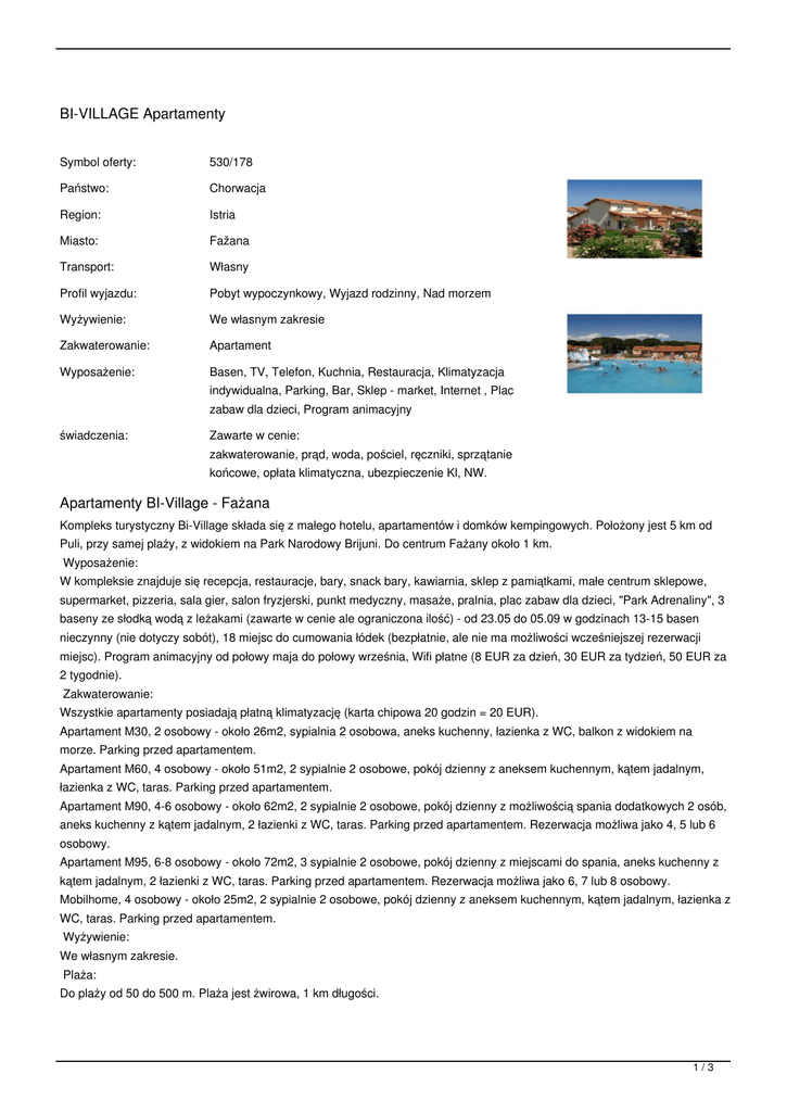 BI-VILLAGE Apartamenty Symbol oferty: 530/178 Państwo: Chorwacja Region: Istria Miasto: Fažana Transport: Własny Profil wyjazdu: Pobyt wypoczynkowy, Wyjazd rodzinny, Nad morzem Wyżywienie: We własnym zakresie Zakwaterowanie: Apartament Wyposażenie: Basen, TV, Telefon, Kuchnia, Restauracja, Klimatyzacja indywidualna, Parking, Bar, Sklep - market, Internet , Plac zabaw dla dzieci, Program animacyjny świadczenia: Zawarte w cenie: zakwaterowanie, prąd, woda, pościel, ręczniki, sprzątanie końcowe, opłata klimatyczna, ubezpieczenie Kl, NW. Apartamenty BI-Village - Fażana Kompleks turystyczny Bi-Village składa się z małego hotelu, apartamentów i domków kempingowych. Położony jest 5 km od Puli, przy samej plaży, z widokiem na Park Narodowy Brijuni. Do centrum Fażany około 1 km. Wyposażenie: W kompleksie znajduje się recepcja, restauracje, bary, snack bary, kawiarnia, sklep z pamiątkami, małe centrum sklepowe, supermarket, pizzeria, sala gier, salon fryzjerski, punkt medyczny, masaże, pralnia, plac zabaw dla dzieci, "Park Adrenaliny", 3 baseny ze słodką wodą z leżakami (zawarte w cenie ale ograniczona ilość) - od 23.05 do 05.09 w godzinach 13-15 basen nieczynny (nie dotyczy sobót), 18 miejsc do cumowania łódek (bezpłatnie, ale nie ma możliwości wcześniejszej rezerwacji miejsc). Program animacyjny od połowy maja do połowy września, Wifi płatne (8 EUR za dzień, 30 EUR za tydzień, 50 EUR za 2 tygodnie). Zakwaterowanie: Wszystkie apartamenty posiadają płatną klimatyzację (karta chipowa 20 godzin = 20 EUR). Apartament M30, 2 osobowy - około 26m2, sypialnia 2 osobowa, aneks kuchenny, łazienka z WC, balkon z widokiem na morze. Parking przed apartamentem. Apartament M60, 4 osobowy - około 51m2, 2 sypialnie 2 osobowe, pokój dzienny z aneksem kuchennym, kątem jadalnym, łazienka z WC, taras. Parking przed apartamentem. Apartament M90, 4-6 osobowy - około 62m2, 2 sypialnie 2 osobowe, pokój dzienny z możliwością spania dodatkowych 2 osób, aneks kuchenny z kątem jadalnym, 2 łazienki z WC, taras. Parking przed apartamentem. Rezerwacja możliwa jako 4, 5 lub 6 osobowy. Apartament M95, 6-8 osobowy - około 72m2, 3 sypialnie 2 osobowe, pokój dzienny z miejscami do spania, aneks kuchenny z kątem jadalnym, 2 łazienki z WC, taras. Parking przed apartamentem. Rezerwacja możliwa jako 6, 7 lub 8 osobowy. Mobilhome, 4 osobowy - około 25m2, 2 sypialnie 2 osobowe, pokój dzienny z aneksem kuchennym, kątem jadalnym, łazienka z WC, taras. Parking przed apartamentem. Wyżywienie: We własnym zakresie. Plaża: Do plaży od 50 do 500 m. Plaża jest żwirowa, 1 km długości. 1/3 Sport: Siatkówka, piłka nożna, badminton, trampoliny, aquaerobic, wypożyczalnia rowerów, sporty wodne. Zawarte w cenie: Zakwaterowanie, prąd, woda, pościel, ręczniki, sprzątanie końcowe, opłata klimatyczna, parking, ubezpieczenie KL, NW. TERMINY: od: 2017-04-22 do: 2017-04-29 (8 dni), miejsca: zamów cena od: 495 PLN = 119 EUR od: 2017-04-29 do: 2017-05-06 (8 dni), miejsca: zamów cena od: 495 PLN = 119 EUR od: 2017-05-06 do: 2017-05-13 (8 dni), miejsca: zamów cena od: 495 PLN = 119 EUR od: 2017-05-13 do: 2017-05-20 (8 dni), miejsca: zamów cena od: 872 PLN = 210 EUR od: 2017-05-20 do: 2017-05-27 (8 dni), miejsca: zamów cena od: 872 PLN = 210 EUR od: 2017-05-27 do: 2017-06-03 (8 dni), miejsca: zamów cena od: 872 PLN = 210 EUR od: 2017-06-03 do: 2017-06-10 (8 dni), miejsca: zamów cena od: 887 PLN = 214 EUR od: 2017-06-10 do: 2017-06-17 (8 dni), miejsca: zamów cena od: 887 PLN = 214 EUR od: 2017-06-17 do: 2017-06-24 (8 dni), miejsca: zamów cena od: 887 PLN = 214 EUR od: 2017-06-24 do: 2017-07-01 (8 dni), miejsca: zamów cena od: 887 PLN = 214 EUR od: 2017-07-01 do: 2017-07-08 (8 dni), miejsca: zamów cena od: 887 PLN = 214 EUR od: 2017-07-08 do: 2017-07-15 (8 dni), miejsca: zamów cena od: 887 PLN = 214 EUR od: 2017-07-15 do: 2017-07-22 (8 dni), miejsca: zamów cena od: 1409 PLN = 340 EUR od: 2017-07-22 do: 2017-07-29 (8 dni), miejsca: zamów cena od: 1409 PLN = 340 EUR od: 2017-07-29 do: 2017-08-05 (8 dni), miejsca: zamów cena od: 1409 PLN = 340 EUR od: 2017-08-05 do: 2017-08-12 (8 dni), miejsca: zamów cena od: 1431 PLN = 345 EUR od: 2017-08-12 do: 2017-08-19 (8 dni), miejsca: zamów cena od: 1431 PLN = 345 EUR od: 2017-08-19 do: 2017-08-26 (8 dni), miejsca: zamów cena od: 1351 PLN = 326 EUR od: 2017-08-26 do: 2017-09-02 (8 dni), miejsca: zamów cena od: 1351 PLN = 326 EUR od: 2017-09-02 do: 2017-09-09 (8 dni), miejsca: zamów cena od: 1351 PLN = 326 EUR od: 2017-09-09 do: 2017-09-16 (8 dni), miejsca: zamów cena od: 495 PLN = 119 EUR od: 2017-09-16 do: 2017-09-23 (8 dni), miejsca: zamów cena od: 495 PLN = 119 EUR od: 2017-09-23 do: 2017-09-30 (8 dni), miejsca: zamów cena od: 495 PLN = 119 EUR CENNIK: Długość pobytu: 8 dni 8 dni 8 dni 8 dni 8 dni 8 dni Grupa cenowa: F A D C E B 11 11 11 11 11 (-) (-) (-) (-) (-) 1883 1316 1925 1295 1316 812 1337 798 1736 1211 1764 1190 1386 945 1428 910 1533 1050 1589 1015 2030 1421 2086 1400 1680 1155 1750 1120 Ubezpieczenie (obligatoryjne) (*) Ubezpieczenie KL, NW, SKI 11 (*) Turystyczny Fundusz Gwarancyjny (-) Pobyt w obiekcie (do wyboru) Apartament 7 pers. M-95 standardowo dla osób: 7 minimalnie: 1 1792 721 (*) Apartament 4 pers. M-60 standardowo dla osób: 4 minimalnie: 1 1260 434 Apartament 6 pers. M-95 standardowo dla osób: 6 minimalnie: 1 1652 637 Apartament 4 pers. M-90 standardowo dla osób: 4 minimalnie: 1 1323 497 Apartament 5 pers. M-90 standardowo dla osób: 5 minimalnie: 1 1463 581 Apartament 8 pers. M-95 standardowo dla osób: 8 minimalnie: 1 1932 805 Apartament 6 pers. M-90 standardowo dla osób: 6 minimalnie: 1 1603 665 2/3 Rodzaj osoby (do wyboru) (*) Uczestnik (-) (-) (-) (-) (-) (-) Waluta: EUR Aktualne ceny z systemu S.A.R.T. (-) - cena usługi, podatku kalkulowana przy osobie lub gratis (*) - kwota wliczona w cenę standardową 3/3