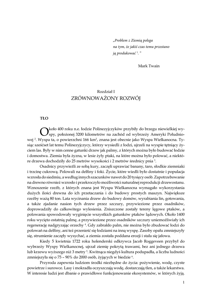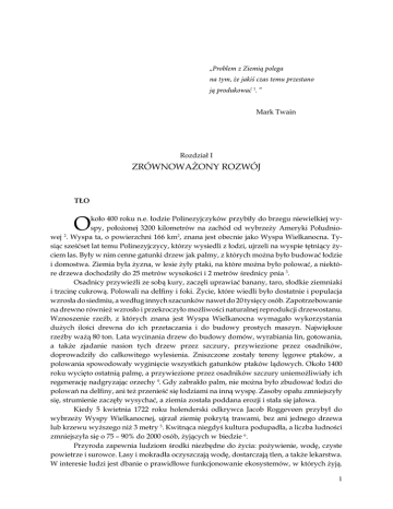 „Problem z Ziemią polega na tym, że jakiś czas temu przestano ją produkować 1. ” Mark Twain Rozdział I ZRÓWNOWAŻONY ROZWÓJ TŁO O koło 400 roku n.e. łodzie Polinezyjczyków przybiły do brzegu niewielkiej wyspy, położonej 3200 kilometrów na zachód od wybrzeży Ameryki Południowej 2. Wyspa ta, o powierzchni 166 km2, znana jest obecnie jako Wyspa Wielkanocna. Tysiąc sześćset lat temu Polinezyjczycy, którzy wysiedli z łodzi, ujrzeli na wyspie tętniący życiem las. Były w nim cenne gatunki drzew jak palmy, z których można było budować łodzie i domostwa. Ziemia była żyzna, w lesie żyły ptaki, na które można było polować, a niektóre drzewa dochodziły do 25 metrów wysokości i 2 metrów średnicy pnia 3. Osadnicy przywieźli ze sobą kury, zaczęli uprawiać banany, taro, słodkie ziemniaki i trzcinę cukrową. Polowali na delfiny i foki. Życie, które wiedli było dostatnie i populacja wzrosła do siedmiu, a według innych szacunków nawet do 20 tysięcy osób. Zapotrzebowanie na drewno również wzrosło i przekroczyło możliwości naturalnej reprodukcji drzewostanu. Wznoszenie rzeźb, z których znana jest Wyspa Wielkanocna wymagało wykorzystania dużych ilości drewna do ich przetaczania i do budowy prostych maszyn. Największe rzeźby ważą 80 ton. Lata wycinania drzew do budowy domów, wyrabiania lin, gotowania, a także zjadanie nasion tych drzew przez szczury, przywiezione przez osadników, doprowadziły do całkowitego wylesienia. Zniszczone zostały tereny lęgowe ptaków, a polowania spowodowały wyginięcie wszystkich gatunków ptaków lądowych. Około 1400 roku wycięto ostatnią palmę, a przywiezione przez osadników szczury uniemożliwiały ich regenerację nadgryzając orzechy 4. Gdy zabrakło palm, nie można było zbudować łodzi do polowań na delfiny, ani też przenieść się łodziami na inną wyspę. Zasoby opału zmniejszyły się, strumienie zaczęły wysychać, a ziemia została poddana erozji i stała się jałowa. Kiedy 5 kwietnia 1722 roku holenderski odkrywca Jacob Roggeveen przybył do wybrzeży Wyspy Wielkanocnej, ujrzał ziemię pokrytą trawami, bez ani jednego drzewa lub krzewu wyższego niż 3 metry 5. Kwitnąca niegdyś kultura podupadła, a liczba ludności zmniejszyła się o 75 – 90% do 2000 osób, żyjących w biedzie 6. Przyroda zapewnia ludziom środki niezbędne do życia: pożywienie, wodę, czyste powietrze i surowce. Lasy i mokradła oczyszczają wodę, dostarczają tlen, a także lekarstwa. W interesie ludzi jest dbanie o prawidłowe funkcjonowanie ekosystemów, w których żyją. 1 Wyspa Wielkanocna. Zdjęcie: omas Rivinius. Bez „usług” i dóbr, które zapewniają ekosystemy przyrodnicze na Ziemi, życie ludzi nie byłoby możliwe. W dziejach ludzkości zdarzało się jednak, że cywilizacje lub lokalne społeczności przekraczały granicę odnawiania się zasobów naturalnych i nadmiernie bądź niewłaściwie wykorzystywały ekosystemy. Miało to miejsce w przypadku cywilizacji Sumerów, Majów czy właśnie mieszkańców Wyspy Wielkanocnej i doprowadziło do upadku tych cywilizacji 7. Pomimo tych lekcji z historii, ludzkość zużywa dziś o 1/3 więcej surowców naturalnych niż przyroda potrafi uzupełnić 8. Sytuacja na świecie zaczyna obecnie coraz bardziej przypominać dzieje Wyspy Wielkanocnej. Skala zagrożeń dotyczy jednak nie tylko małej wyspy na Oceanie Spokojnym, lecz całej planety. Powierzchnia lasów na Ziemi zmniejszyła się o ponad 50% i jedynie 40% tego, co zostało to duże, naturalne systemy leśne. Każdego roku wycinanych jest ponad 9 milionów hektarów lasu (obszar wielkości Portugalii), aby uzyskać nowe ziemie uprawne, drewno na opał i różne produkty takie jak papier 9. Około połowa papieru produkowanego na świecie zużywana jest do produkcji opakowań. Lasy zatrzymują wodę deszczową, przeciwdziałając powodziom. W dolinie rzeki Yangtze w Chinach zostało wyciętych 85% drzew, powódź, jaka miała tam miejsce w 1998 roku, dotknęła 120 milionów osób 10. 2 Zmniejszanie się powierzchni Lasu Atlantyckiego w Brazylii na przestrzeni lat 1500 – 2000. Dziś pozostało jedynie 8% jego pierwotnej powierzchni 13. Źródło: Agroforestry and Biodiversity Conservation in Tropical Landscapes 14. Lasy tropikalne na świecie (powierzchnia w milionach hektarów). Źródło: CIDA Forestry Advisors Network 11. 3 Las tropikalny w Amazonii zamieniony na pastwisko. Źródło: Earth Observatory – NASA 12. Pustynnienie obejmuje około 6 milionów hektarów rocznie w 60 krajach świata 15. Nigeria każdego roku traci 351 tysięcy hektarów gleby na skutek pustynnienia, co stanowi poważne zagrożenie dla gospodarki tego kraju 16. W Brazylii pustynnienie dotknęło około 58 milionów hektarów ziem. Straty gospodarcze związane z pustynnieniem szacuje się tam na 300 milionów USD rocznie 17. W Indiach rokrocznie susza i wylesianie zamieniają 2,5 miliona hektarów ziemi w nieużytki, a w Meksyku aż 70% ziemi jest zagrożone pustynnieniem 18. 700 tysięcy – 900 tysięcy Meksykanów każdego roku na skutek pustynnienia opuszcza swoje domy, by szukać pracy w USA 19. Szacuje się, że liczba uchodźców z terenów dotkniętych pustynnieniem w Afryce subsaharyjskiej może sięgnąć 20 milionów na przestrzeni następnych 20 lat 20. W kwietniu 2001 roku potężna burza piaskowa w Ameryce Północnej przykryła pyłem obszar od Kanady do Arizony. Obłok pyłu był na tyle gęsty, że ludzie mieszkający u podnóży Gór Skalistych nie widzieli nawet gór. Burza ta nie powstała jednak na terytorium USA. Przywędrowała z Chin, gdzie ziemia pustynnieje na skutek zbyt intensywnego rolnictwa i nadmiernego wypasu bydła 21. Na zdjęciu tumany piasku przekraczają wybrzeże Chin w kwietniu 2001 roku. Źródło: NOAA 22. 4 Około 36% wszystkich ziem uprawnych na Ziemi ucierpiało na skutek erozji. W Afryce, na skutek erozji gleby roczne zbiory zmniejszyły się o 1,9 m