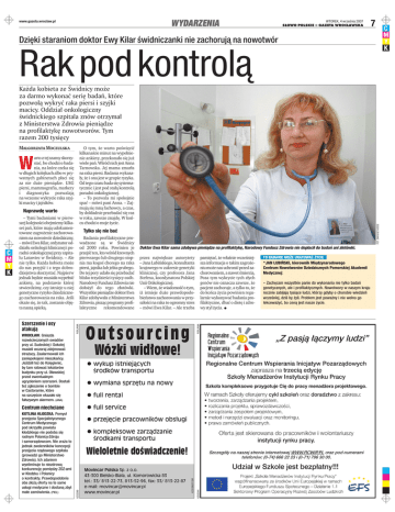 WYDARZENIA www.gazeta.wroclaw.pl WTOREK, 4 września 2007 SŁOWO POLSKIE M GAZETA WROCŁAWSKA 7 Dzięki staraniom doktor Ewy Kilar świdniczanki nie zachorują na nowotwór Rak pod kontrolą Ka˝da kobieta ze Âwidnicy mo˝e za darmo wykonaç seri´ badaƒ, które pozwolà wykryç raka piersi i szyjki macicy. Oddzia∏ onkologiczny Êwidnickiego szpitala znów otrzyma∏ z Ministerstwa Zdrowia pieniàdze na profilaktyk´ nowotworów. Tym razem 200 tysi´cy W arto z tej szansy skorzystać, bo chodzi o badania, na które czeka się w długich kolejkach albo w prywatnych gabinetach płaci się za nie duże pieniądze. USG piersi, mammografia, markery i diagnostyka pozwalają na wczesne wykrycie raka szyjki macicy i jajników. Naprawdę warto – Tymi badaniami w pierwszej kolejności obejmiemy kilkaset pań, które mają udokumentowane zagrożenie zachorowaniem na nowotwór dziedziczny, – mówi Ewa Kilar, ordynator oddziału onkologii klinicznej i poradni onkologicznej przy szpitalu Latawiec w Świdnicy. – Ale nie tylko. Każda kobieta może do nas przyjść i z tego dobrodziejstwa skorzystać. Najpierw jednak będzie musiała wypełnić ankietę, na podstawie której stwierdzimy, czy istnieje u niej genetyczne ryzyko dziedzicznego zachorowania na raka. Jeśli okaże się, że tak, zostanie objęta naszą opieką. Tylko się nie bać WROCŁAW. Gniazda rozwścieczonych owadów przy ul. Sudeckiej i Sokolej musieli wczoraj zdejmować strażacy. Zaalarmowali ich zaniepokojeni mieszkańcy. Jeździli też do Księgienic, by tam ratować lokatorów budynku przy ul. Oławskiej przed ewentualnym ugryzieniem szerszeni. Dostali też zgłoszenie o bombie w Castoramie, które na szczęście okazało się fałszywym alarmem. (ANA) pamiętać, że właśnie wcześniejsza informacja o takim zagrożeniu może nas uchronić przed zachorowaniem, a nawet śmiercią. Poza tym wykrycie tych złych genów nie oznacza zawsze, że pacjent zachoruje, a tylko to, że do końca życia powinien regularnie wykonywać badania profilaktyczne, dbać o dietę i zdrowy styl życia. • przez największe autorytety – Jana Lubińskiego, konsultanta krajowego w zakresie genetyki klinicznej, czy profesora Jana Stefena, koordynatora Polskiej Unii Onkologicznej. – Wiem, że wiadomość o tym, iż istnieje duże prawdopodobieństwo zachorowania w przyszłości na raka to ogromny stres – mówi Ewa Kilar. – Ale trzeba Outsourcing Wózki widłowe! wykup istniejących środków transportu wymiana sprzętu na nowy full rental full service Centrum niechciane przejęcie pracowników obsługi kompleksowe zarządzanie środkami transportu A233390/07/QM Movincar Polska Sp. z o.o. 43-300 Bielsko-Biała, ul. Komorowicka 83 tel.: 33/ 813-22-73, 813-52-96, fax: 33/ 813-22-87 e-mail: [email protected] www.movincar.pl A250544 Wieloletnie doświadczenie! A233390 KOTLINA KŁODZKA. Pomysł przejęcia Specjalistycznego Centrum Medycznego pod skrzydła powiatu kłodzkiego nie podoba się radnym Polanicy-Zdroju i samorządowcom. Nie zraża to jednak zwolenników koncepcji przejęcia rządowego szpitala (prowadzi go Ministerstwo Zdrowia). Ich zdaniem wyeliminuje to niezdrową konkurencję pomiędzy ZOZ-ami w Kłodzku i Polanicy o kontrakty. Prawdopodobnie oba złożą oferty na te same usługi medyczne i dostaną zbyt małe zamówienia. (PIEL) Doktor Ewa Kilar sama zdobywa pieniądze na profilaktykę, Narodowy Fundusz Zdrowia nie dopłacił do badań ani złotówki. REKLAMA Badania profilaktyczne prowadzone są w Świdnicy od 2000 roku. Powinien je przejść ten, kto wśród krewnych pierwszego lub drugiego stopnia ma kogoś chorego na raka piersi, jajnika lub jelita grubego. Do tej pory udało się przebadać blisko trzydzieści tysięcy osób. Narodowy Fundusz Zdrowia nie dołożył do tego złotówki. Wszystkie pieniądze doktor Ewa Kilar zdobywała z Ministerstwa Zdrowia, pisząc programy profilaktyczne rekomendowane REKLAMA Szerszenie i osy atakują FOT. DARIUSZ GDESZ O tym, że warto poświęcić kilkanaście minut na wypełnienie ankiety, przekonało się już wiele pań. Wśród nich jest Anna Tarnowska. Jej mama zmarła na raka piersi. Badania wykazały, że i ona jest w grupie ryzyka. Od tego czasu bada się systematycznie i jest pod stałą kontrolą poradni onkologicznej. – To pozwala mi spokojnie spać – mówi pani Anna. – Zajmują się mną fachowcy, a czas, by dokładnie przebadać się raz w roku, zawsze znajdę. W końcu chodzi o moje życie. Małgorzata Moczulska TO BADANIE MOŻE URATOWAĆ ŻYCIE *JAN LUBIŃSKI, kierownik Międzynarodowego Centrum Nowotworów Dziedzicznych Pomorskiej Akademii Medycznej: – Zachęcam wszystkie panie do wykonania nie tylko badań genetycznych, ale i profilaktycznych. Nowotwory w naszym kraju rocznie zabijają tysiące ludzi, którzy gdyby o chorobie wiedzieli wcześniej, dziś by żyli. Problem jest poważny i nie wolno go lekceważyć, bo ceną jest nasze życie.