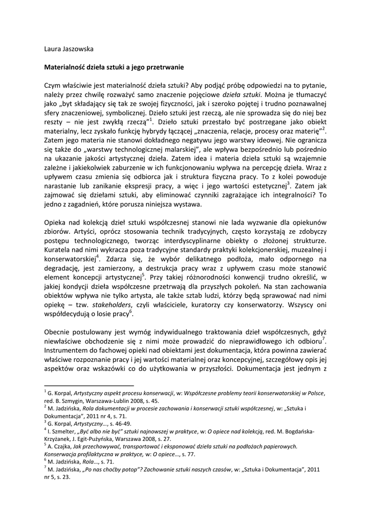 Laura Jaszowska Materialność dzieła sztuki a jego przetrwanie Czym właściwie jest materialność dzieła sztuki? Aby podjąć próbę odpowiedzi na to pytanie, należy przez chwilę rozważyć samo znaczenie pojęciowe dzieła sztuki. Można je tłumaczyć jako „byt składający się tak ze swojej fizyczności, jak i szeroko pojętej i trudno poznawalnej sfery znaczeniowej, symbolicznej. Dzieło sztuki jest rzeczą, ale nie sprowadza się do niej bez reszty – nie jest zwykłą rzeczą”1. Dzieło sztuki przestało być postrzegane jako obiekt materialny, lecz zyskało funkcję hybrydy łączącej „znaczenia, relacje, procesy oraz materię”2. Zatem jego materia nie stanowi dokładnego negatywu jego warstwy ideowej. Nie ogranicza się także do „warstwy technologicznej malarskiej”, ale wpływa bezpośrednio lub pośrednio na ukazanie jakości artystycznej dzieła. Zatem idea i materia dzieła sztuki są wzajemnie zależne i jakiekolwiek zaburzenie w ich funkcjonowaniu wpływa na percepcję dzieła. Wraz z upływem czasu zmienia się odbiorca jak i struktura fizyczna pracy. To z kolei powoduje narastanie lub zanikanie ekspresji pracy, a więc i jego wartości estetycznej3. Zatem jak zajmować się dziełami sztuki, aby eliminować czynniki zagrażające ich integralności? To jedno z zagadnień, które porusza niniejsza wystawa. Opieka nad kolekcją dzieł sztuki współczesnej stanowi nie lada wyzwanie dla opiekunów zbiorów. Artyści, oprócz stosowania technik tradycyjnych, często korzystają ze zdobyczy postępu technologicznego, tworząc interdyscyplinarne obiekty o złożonej strukturze. Kuratela nad nimi wykracza poza tradycyjne standardy praktyki kolekcjonerskiej, muzealnej i konserwatorskiej4. Zdarza się, że wybór delikatnego podłoża, mało odpornego na degradację, jest zamierzony, a destrukcja pracy wraz z upływem czasu może stanowić element koncepcji artystycznej5. Przy takiej różnorodności konwencji trudno określić, w jakiej kondycji dzieła współczesne przetrwają dla przyszłych pokoleń. Na stan zachowania obiektów wpływa nie tylko artysta, ale także sztab ludzi, którzy będą sprawować nad nimi opiekę – tzw. stakeholders, czyli właściciele, kuratorzy czy konserwatorzy. Wszyscy oni współdecydują o losie pracy6. Obecnie postulowany jest wymóg indywidualnego traktowania dzieł współczesnych, gdyż niewłaściwe obchodzenie się z nimi może prowadzić do nieprawidłowego ich odbioru 7. Instrumentem do fachowej opieki nad obiektami jest dokumentacja, która powinna zawierać właściwe rozpoznanie pracy i jej wartości materialnej oraz koncepcyjnej, szczegółowy opis jej aspektów oraz wskazówki co do użytkowania w przyszłości. Dokumentacja jest jednym z 1 G. Korpal, Artystyczny aspekt procesu konserwacji, w: Współczesne problemy teorii konserwatorskiej w Polsce, red. B. Szmygin, Warszawa-Lublin 2008, s. 45. 2 M. Jadzińska, Rola dokumentacji w procesie zachowania i konserwacji sztuki współczesnej, w: „Sztuka i Dokumentacja”, 2011 nr 4, s. 71. 3 G. Korpal, Artystyczny…, s. 46-49. 4 I. Szmelter, „Być albo nie być” sztuki najnowszej w praktyce, w: O opiece nad kolekcją, red. M. BogdańskaKrzyżanek, J. Egit-Pużyńska, Warszawa 2008, s. 27. 5 A. Czajka, Jak przechowywać, transportować i eksponować dzieła sztuki na podłożach papierowych. Konserwacja profilaktyczna w praktyce, w: O opiece…, s. 77. 6 M. Jadzińska, Rola…, s. 71. 7 M. Jadzińska, „Po nas choćby potop”? Zachowanie sztuki naszych czasów, w: „Sztuka i Dokumentacja”, 2011 nr 5, s. 23. filarów systemu pozwalającego na przetrwanie obiektu. Należy do niej włączyć również instrukcje autora dotyczące integralności pracy, wytyczne co do zachowania jej elementów wedle specyfiki materiału, techniki oraz koncepcji dzieła, a także zalecenia konserwatorskie. Bez dokumentacji trudno mówić o prawidłowej ekspozycji, przechowywaniu i transportowaniu dzieła. Zdarza się, że jest jedynym śladem jego egzystencji8. Stanowi nie tylko materiał do pracy muzealno-edukacyjno-pedagogicznej, lecz również rodzaj „certyfikatu autorskiego”, wyrażający intencje autora. Pozwala to na uniknięcie niezrozumienia i zniekształcenia idei artysty9. O znaczeniu dokumentacji świadczyć mogą badania nad twórczością Aliny Szapocznikow, dzięki którym rozpoznano niezgodne z ideą artystki interpretacje jej prac. Zniszczenia dzieł wykonanych z żywic sztucznych odczytywano jako zamierzoną autodestrukcję, wynikającą z biografii artystki. Iwona Szmelter uważa, że nie było to zamierzeniem Szapocznikow, a uszkodzenia wynikały z wad materiału konstrukcyjnego oraz nieprawidłowego przechowywania. Stwierdza nawet, że „ekspozycja prac w stanie zniszczenia, niejako arbitralnie przesądzona przez jej opiekunów, jest poniekąd naruszeniem praw autorskich” 10. W takiej sytuacji wydaje się zasadne, aby w trakcie dokumentowania dzieła podjąć szeroko pojętą współpracę z twórcą. Bezcenna jest znajomość procesu powstawania dzieła, jak też sugestie autora co do sposobu eksponowania obiektu. Specjalistyczny wywiad powinno przeprowadzić się nie tylko z artystą, ale także z rodziną, współpracownikami, poprzednimi kuratorami wystaw, konserwatorami, technikami i tak dalej11. W wypadku kolekcji prezentowanej na wystawie Materialność i wartość dzieła sztuki zadanie to jest znacznie utrudnione. Wielu artystów, których prace wchodzą w jej skład, już nie żyje. Jak wyżej wspomniano, istotnym elementem opieki nad zbiorem jest kompletna i rzetelna dokumentacja każdego dzieła. W Galerii Arsenał prowadzona jest księga inwentarzowa kolekcji (oficjalnie: „Księga inwentarzowa muzealiów artystycznych”), która została włączona do ekspozycji. W toku prac nad wystawą okazało się, że treść księgi nie zawsze odpowiada rzeczywistemu stanowi rzeczy. Głównym problemem jest niekonsekwencja opisów technik wyko