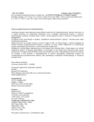 "ZP. 271.5.2015 Uniejów, dnia 17.04.2015 r. Dot. przetargu nieograniczonego na zadanie pn.: „E-USŁUGI Publiczne w Gminie Uniejów” Działając zgodnie z art. 38 ust. 1a i 2 ustawy z dnia 29 stycznia 2004 r. Prawo zamówień publicznych (t. j.: Dz. U. z 2013 r., poz. 907 z późn. zm.) Zamawiający odpowiada na pytania:" Dotyczy punktu Zestaw do wideokonferencji. Analizując zmiany wprowadzone do specyfikacji zestawów do wideokonferencji, chcemy zauważyć, że w opisie pojawiły się nieścisłości dotyczące m.in. wymagań dotyczących kamery z zestawu. Zamawiający w punkcie „Funkcje audio i wideo" wyraził zgodę na zestaw z „Kamera o rozdzielczości 2 Megapikseli" W dalszej części specyfikacji w punkcie „Dodatkowe funkcjonalności" opisuje " Wykonywanie zdjęć 5M pikselową kamerą„ Mając powyższe na uwadze chcemy zwrócić uwagę na fakt, że Zamawiający w opisie posługuje się dwoma różnymi rozdzielczościami kamery z zestawu, co może rodzić wątpliwość, że zaoferowany zestaw ma posiadać dwie kamery, co jest technicznie wykluczone. Dodatkowo zatwierdzając zaproponowane rozwiązanie jako akceptowalne, Zamawiający nie zmienił niektórych zapisów w bieżącej specyfikacji, co powoduje, że nie można przy obecnym stanie rzeczy zaoferować w postępowaniu produktu, który jest dostępny na rynku. Taki produkt po prostu nie istnieje. W związku z tym prosimy o zaakceptowanie w całości specyfikacji technicznej zestawu do wideokonferencji przedstawionej poniżej, jako spełniającej wymagania Zamawiającego w bieżącym postępowaniu: Specyfikacja produktu 4-stronny mostek MCU - FullHD Zawartość opakowania Jednostka centralna (kodek) Kamera PTZ Mikrofon Pilot zdalnego sterowania (IR) wraz z bateriami Zasilacz Kable podłączeniowe Komunikacja H.323 i standard SIP 64Kbps ~4Mbps RJ45 sieć LAN (10/100/1000) Ręczne ustawienia transferu Kamera Kamera PTZ Matryca CMOS 2-megapiksele 16-krotny zoom optyczny ±100° obrót; ±25° pochył 67° pole widzenia Wspierane rozdzielczości video FullHD 1080p (1920 x 1080) HD 720p (1280 x 720) 480p (848 x 480) QVGA (320 x 240) CIF (352 x 288) Wszystkie rozdzielczości w 30 klatkach/s (fps) Rozdzielczość współdzielonych materiałów Port VGA WSXGA+ (1680 x 1050) WXGA (1280 x 768) SXGA (1280 x 1024) XGA (1024 x 768) SVGA (800 x 600) VGA (640 x 480) Port DVI (cyfrowy) 1080p (1920 x 1080) 720p (1280 x 720) D1 (720x480) SXGA (1280 x 1024) XGA (1024 x 768) SVGA (800 x 600) VGA (640 x 480) Rozdzielczości wyświetlania Do FullHD 1080p (1920 x 1080) w 30 klatkach/s (fps) Standardy Video H.264, H.263+, H.263 Podwójny strumień wideo H.239 Wejścia Video Kamera PTZ VGA DVI Wyjścia Video HDMI VGA Standardy Audio G. 711, G.722, G.722.1, G.728, G.722.1C Funkcje Audio Automatyczna kontrola wzmocnienia (AGC) Zaawansowana redukcja szumów Redukcja echa akustycznego (AEC) Wejścia Audio Mikrofon Wejście liniowe (3.5 mm) Wyjścia Audio Cyfrowe audio przez HDMI Wyjście liniowe (3.5 mm) Pozostałe wspierane standardy H. 224, H.225, H.245, H.281, H.323 Annex Q, H.460 Interfejs użytkownika Wiele ustawień widoków Intuicyjne menu OSD Edycja i wyświetlanie nazwy łączącego się urządzenia Sieć 10/100/1000Mbps NAT / firewall traversal (H.460) Wykrywanie zagubionych pakietów Wsparcie API via Telnet Funkcja Wake-on-LAN (WOL) Wsparcie IPv4 oraz IPv6 Spełnia Quality of service (QoS) Bezpieczeństwo Szyfrowanie 128-bitów AES (Advanced Encryption Standard) Ochrona ustawień systemowych hasłem Ochrona hasłem zdalnej kontroli urządzenia Narzędzie obsługi przez Internet Zdalna kontrola przez sieć Web Monitoring na żywo przez sieć Web Aktualizacja firmware przez Ethernet / Internet Obsługa książki telefonicznej (ściąganie, wgrywanie, edycja) Przywracanie ustawień systemu Test sieci Dodatkowe funkcje Nagrywanie spotkań • Nagrywanie spotkań on-line oraz prezentacji off-line • Zapis do pamięci USB • Możliwa zmiana ustawień widoku w czasie odtwarzania • Odtwarzanie i eksport plików w dedykowanym programie (format .mov) Obsługa dwóch monitorów Szybkie wybieranie przez definiowane klawisze (10 numerów) Predefiniowane ustawienia kamery (10 pozycji) Aktualizacja firmware przez Ethernet lub USB Wygaszacz ekranu oraz funkcja automatycznego wyłączania Dwa porty USB 2.0 na przednim panelu Protokół komunikacyjny Network Time Protocol (NTP) Gwarancja 3 lata gwarancji ODPOWIEDŹ Zamawiający jak słusznie zauważono dopuścił kamerę o rozdzielczości 2 megapikseli. Wpis, który dostrzegł Wykonawca w części dodatkowe funkcjonalności należy traktować jako pomyłkę pisarską. Parametr będzie traktowany jak dla kamery o rozdzielczości 2 megapikseli.