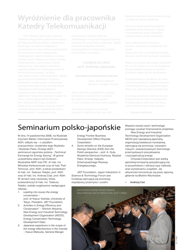 Wyróżnienie dla pracownika Katedry Telekomuanikacji piosenkami z tekstami Michała Zabłockiego i muzyką Grzegorza Turnaua, wykonanymi przez tego ostatniego. Teksty piosenek opisywały badania poszczególnych naukowców, będące przedmiotem nominacji. Laudacja na cześć prof. Andrzeja Jajszczyka Jako zaletę należy pojmować szczelin czasowych dostępność dla słowa. Słowo być musi w szczelinę wsunięte, po czym wychodzi za drugim zakrętem. Ważne, by wyszło jak weszło dokładnie tak, że ze środka mu nic nie wypadnie. Słowa potrafią się gubić w centrali, że byście nawet się nie spodziewali. Komutatory przestrzenno-czasowe Tekst: Michał Zabłocki Muzyka: Grzegorz Turnau Jakiś czas temu zapadły mi w głowę komutatory przestrzenno-czasowe. Bo tylko one się wiążą czasami w coś, co potocznie nazwiemy węzłami. Komutatory wiązane w centrale będą już mogły rozrastać się stale. Seminarium polsko-japońskie W dniu 14 października 2008, na Wydziale Inżynierii Metali i Informatyki Przemysłowej AGH, odbyło się – z udziałem pracowników i studentów tego Wydziału i Wydziału Paliw i Energii AGH – seminarium japońsko-polskie: „Technical Exchange for Energy Saving”. W gronie uczestników obecni byli Dziekani Wydziałów IMiIP oraz PiE: dr hab. inż. Mirosław Karbowniczek oraz dr hab. Piotr Tomczyk, prof. AGH, a także prodziekani: dr hab. inż. Tadeusz Telejko, prof. AGH oraz dr hab. inż. Andrzej Ciaś, prof. AGH. W ramach sesji naukowej, której przewodniczył dr hab. inż. Tadeusz Telejko, zostały wygłoszone następujące referaty: 1. Leading into issues the energy conservation – prof. dr Kazuo Yoshida, University of Tokyo, President, JIST Foundation; 2. Activities in Energy Efficiency and Conservation” – Shinichi Akiyama, New Energy and Industrial Technology Development Organization (NEDO), Energy Conservation Technology Development Dept.; 3. Japanese experience in the scope of the energy effectiveness in the industry – Kazuo Matsuda, General Manger, Poza tym kabel optyczny dołączę, zabezpieczenia świecąco-wyjące i konsekwencje awarii złagodzę, powód usunę i skutki uszkodzeń. 4. Energy Frontier Business Development Office Chiyoda Corporation; Some remarks on the European Savings Directive (ESD) from the Polish perspective – prof. A. Guła, Akademia Górniczo-Hutnicza, Wydział Paliw i Energii, Katedra Zrównoważonego Rozwoju Energetycznego. JIST Foundation, Japan Interaction in Science & Technology Forum jest fundacją zajmującą się promocją współpracy przemysłu i uczelni. Przepakowane w szczelinie na nowo, można przemieścić i zyskać czasowo. A przestrajanie to już znaczna strata. Wiem, bo zajmuję się tym długie lata. Czy mają wyższość, oceńcie to sami, przepakowania nad przestrojeniami. Przepakowanie potencjał ma duży, milion komórek bez trudu obsłuży. Krystyna Stefanek Wspiera rozwój nauki i technologii, pomaga uzyskać finansowanie projektów. New Energy and Industrial Technology Development Organization NEDO jest największą japońską organizacją badawczo-rozwojową, zajmującą się promocją i rozwojem nowych, zaawansowanych technologii przemysłowych pozyskiwania i oszczędnością energii. Chiyoda Corporation jest wielką japońską kompanią specjalizującą się w pozyskiwaniu i rafinacji ropy naftowej oraz wytwarzaniu urządzeń. Jej aktywność koncentruje się poza Japonią, głównie na Bliskim Wschodzie. Andrzej Ciaś prof. dr Kazuo Yoshida, Shinichi Akiyama, Kazuo Matsuda, prof. M. Karbowniczek i prof. T. Telejko fot. S. Malik Prof. Andrzej Jajszczyk z Katedry Telekomunikacji AGH został nominowany do Nagrody Ministra Nauki i Szkolnictwa Wyższego za wybitne osiągnięcia w badaniach na rzecz rozwoju gospodarki. We wszystkich trzech kategoriach, obejmujących również badania na rzecz rozwoju nauki i badania na rzecz rozwoju społeczeństwa, nominowano ośmiu naukowców. Uroczystość wręczenia nagród, połączona z dyskusją na temat szkolnictwa wyższego, na którą zaproszono ośmiu nominowanych, odbyła się dnia 8 października br. w Zamku Królewskim w Warszawie w obecności premiera Donalda Tuska, minister Nauki i Szkolnictwa Wyższego Barbary Kudryckiej oraz rektorów wielu uczelni. Jakkolwiek nagrodę w kategorii badań na rzecz rozwoju gospodarki otrzymał prof. Zdzisław Smorąg z Instytutu Zootechniki z Krakowa, wszyscy obecni usłyszeli nietypowe laudacje dla ośmiu nominowanych. Laudacje te były Będzie wspaniale, przez skórę to czuję, że telefonia się nie zablokuje.