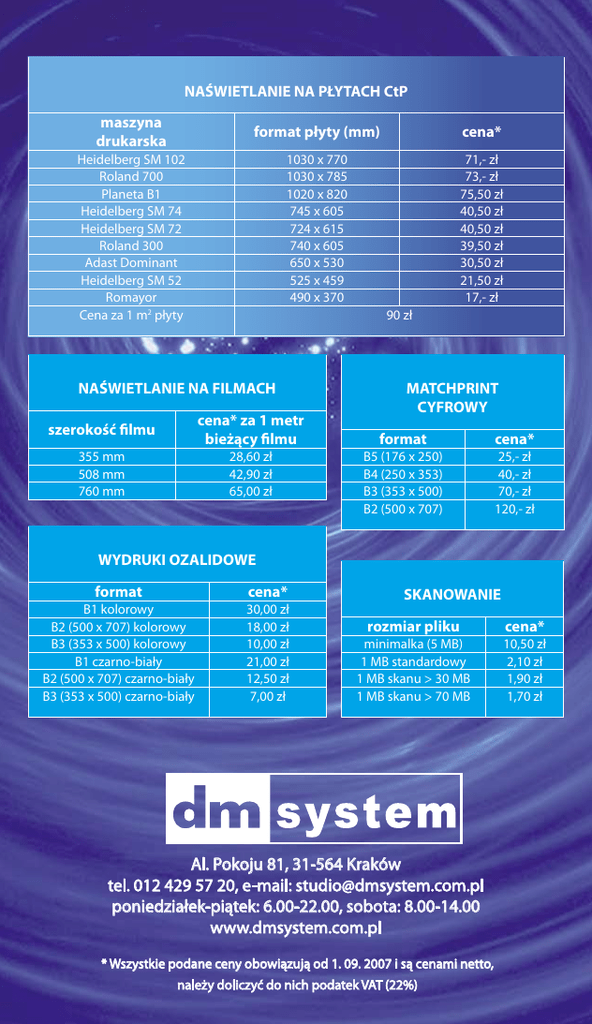 NAŚWIETLANIE NA PŁYTACH CtP maszyna drukarska format płyty (mm) cena* 1030 x 770 1030 x 785 1020 x 820 745 x 605 724 x 615 740 x 605 650 x 530 525 x 459 490 x 370 71,- zł 73,- zł 75,50 zł 40,50 zł 40,50 zł 39,50 zł 30,50 zł 21,50 zł 17,- zł Heidelberg SM 102 Roland 700 Planeta B1 Heidelberg SM 74 Heidelberg SM 72 Roland 300 Adast Dominant Heidelberg SM 52 Romayor Cena za 1 m2 płyty 90 zł NAŚWIETLANIE NA FILMACH szerokość filmu cena* za 1 metr bieżący filmu 355 mm 508 mm 760 mm 28,60 zł 42,90 zł 65,00 zł MATCHPRINT CYFROWY format cena* B5 (176 x 250) B4 (250 x 353) B3 (353 x 500) B2 (500 x 707) 25,- zł 40,- zł 70,- zł 120,- zł WYDRUKI OZALIDOWE format cena* B1 kolorowy B2 (500 x 707) kolorowy B3 (353 x 500) kolorowy B1 czarno-biały B2 (500 x 707) czarno-biały B3 (353 x 500) czarno-biały 30,00 zł 18,00 zł 10,00 zł 21,00 zł 12,50 zł 7,00 zł SKANOWANIE rozmiar pliku cena* minimalka (5 MB) 1 MB standardowy 1 MB skanu > 30 MB 1 MB skanu > 70 MB 10,50 zł 2,10 zł 1,90 zł 1,70 zł Al. Pokoju 81, 31-564 Kraków tel. 012 429 57 20, e-mail: [email protected] poniedziałek-piątek: 6.00-22.00, sobota: 8.00-14.00 www.dmsystem.com.pl * Wszystkie podane ceny obowiązują od 1. 09. 2007 i są cenami netto, należy doliczyć do nich podatek VAT (22%)