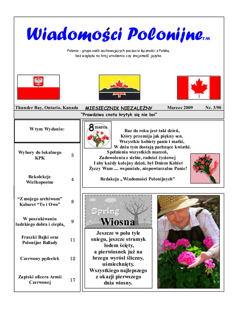 Wiadomosci Polonijne TM Polonia - grupa osób zachowujących poczucie łączności z Polską bez względu na kraj urodzenia czy znajomość języka Thunder Bay, Ontario, Kanada MIESIĘCZNIK NIEZALEŻNY Marzec 2009 “Prawdziwa cnota krytyk się nie boi” W tym Wydaniu: Wybory do lokalnego KPK 3 Rekolekcje Wielkopostne 4 “Z mojego archiwum” Kabaret “To i Owo” 8 W poszukiwaniu ludzkiego dobra i ciepła. 9 Fraszki Bajki oraz Polonijne Ballady 11 Czerwony pędzelek 12 Zapiski oficera Armii Czerwonej 17 Raz do roku jest taki dzień, Który przemija jak piękny sen. Wszystkie kobiety panie i matki, W dniu tym dostają pachnące kwiatki. S pełnienia wszystkich marzeń, Zadowolenia z siebie, radości życiowej I aby każdy kolejny dzień, był Dniem Kobiet Życzy Wam .... ws paniałe, niepowtarzalne Panie! Redakcja „Wiadomości Polonijnych” Wiosna Jeszcze w polu tyle sniegu, jeszcze strumyk lodem ścięty, a pierwiosnek już na brzegu wyrósł śliczny, uśmiechnięty. Wszystkiego najlepszego z okazji pierwszego dnia wiosny. Nr. 3/90 2 Redaguje Zespół: Lucy Michalak Tadeusz Michalak Agnieszka Reszkows ka-Kania Robert Kania Korespondenci: Joanna Adamik Jacek Balcewicz Agnieszka Buda-Rodriguez B. Ejbich A. Siwiak Waldi Opracowanie: Lucy Michalak Wy dawca: Wiadomości Polonijne 236 Masters Street. Thunder Bay , Ont. P7B 6L5 e-mail: [email protected] Wiadomości Polonijne WIADOMOŚCI Z POLSKI-Tadeusz Michalak Premier Zapowi edzi ał , że 4 cz er wc a dobitnie przypomnimy Europie o pols kim wkł adzi e w obal eni e kom uni zmu. J ednocześni e zadekl arował, że rząd nie wyda wielkich pieniędzy na obchody roczni c. Rząd zdecydował, że 4 czerwca odbędzi e się główna impreza upamiętniaj ąca odzyskanie wolności. Prezydent Podpisał ustawę pozbawiającą członków WRON oraz byłych funkcjonariuszy służb specjalnych PRL przywilejów emerytalnych. Będą mieli emerytury liczone tak, jakby okres służby był okresem nieskładkowym. SLD zapowiada skargę do TK. Redakcj a zastrzega sobie prawo skracani a i edycji nadesł anych tekst ów. Wyrażone w tekstach opinie należą do autorów i nie zawsze odzwierciedlają stanowisko redakcji. Za treść ogłoszeń i reklam Radosław S ikorski redakcja nie ponosi Zapowiada kary dyscyplinarne wobec odpowiedzialności. urzędników swego ministerstwa, którzy Wiadomości Polonijne są pismem dopuścili do publikacji artykułu polskiego całkowici e bezpłatnym. Wszelkie prezydent a w amerykański ej gazecie koszty związane z druki em są "Was hington Times". MSZ wydało pokrywane z dotacji. Każda pomoc wprawdzie negatywna opinie na temat gazety, ale nie przesłało jej do wiadomości finansowa jest mile widziana. Kancelarii Prezydenta (tak przynajmniej Wszelkiego rodzaju ogloszeni a i Kancelaria twierdzi). "Washington Times" ży c z eni a d o “ W i adom o ś ci to gazeta finansowana przez Sun Myung P ol oni j ych” przyj m uj e Lucy Moona, założyciela sekty Moon. Michalak tel. 767-4200 Wzory reklam zaprojektowanych przez Wiadomości Polonijne” są własnością wydawnictwa. Kopiowanie i ich publikowanie bez zgody redakcji jest nielegalne. Redakcja “ Wiadomości Polonijnych” zapras za wszystkich Czytelników do przysyłania własnej twórczoś ci. Mogą to być zarówno wiersze jak i proza. Termin nadsyłania materiałów do gazety upływa 15-go każdego miesiąca. Przysłowie miesiąca Gdy w marcu deszcz pada, wtedy rolnik biada, gdy Słońce jaśnieje, to rolnik się śmieje Marzec 2009 lepszych doradców od PR. Nie daje się prowokować dziennikarzom do ostrych wypowiedzi, powiedział tez w telewizji, że chciałby zapomnieć o koalicji z LPR i Samoobrona. Pijany kie rowca wje chał chodnik i zabił kobietę na 50-letnia kobieta zginęła, a jej 12-letnia córka została przewi eziona do szpitala po potrąceniu przez fiata punto, który wjechał na chodnik w Katowicach. Kierowca auta był pijany. Najpierw uciekł z miejsca wypadku, a później zgłosił się na policję. Badanie trzeźwości dało wynik prawie 2,5 promila. Grozi mu kara do 12 lat pozbawieni a wolności. Minister Finansów Jacek Rostowski, normalnie w mediach niewidoczny, udzielił długiego wywiadu "GW". Rzeczowo, powiedział, że nie wiadomo jak się sytuacja gospodarcza i finansowa rozwijać będzie, że może być i gorzej niż "czarny scenarius z" rządu, na który tych 17 miliardów oszczędności szukano. Ale uważa, że w Polsce kryzys będzie trwał krócej, niż. w krajach, które zdecydowały się na zwiększanie defi cytu. Powiedział też, że rząd prędzej zdecyduje się na podniesienie podatków, niż zadłużanie budżetu. Po tragedii w Pakistanie Rząd wciąż szuka rozwiązania Rząd ujawnia szczegóły starań o uwolnienie porwanego polskiego geodety. Grzegorz Schetyna powiedział, że krytycznym dniem był 6 luty, kiedy to nastąpiła ofensywa pakistańskiej armii rządowej. Do końca stycznia wydawało się, że uda się uwolnić pols ki ego zakł adni ka. Wi ceprem i er poinformował, że rząd nie zamierzał organizować akcji zbrojnej w celu odbicia porwanego, ale taka opcja tez była analizowana. Zapewnił tez, że rząd zrobi wszystko by ukarać winnych śmierci Polaka. Rząd jest atakowany przez PiS i SLD za nieudane próby uratowani a porwanego. SLD żąda nawet dymisji ministra Radosława Sikorskiego. Problemu opcji walutowych, co to wiele firm kupiło nie do zabezpieczenia się przed ryzykiem kursowym, a na spekulacje. Teraz płaczą, że padają i żeby rząd coś zrobił. Płaczą zres ztą też i banki, bo muszą tworzyć rezerwy na zadłużeni e przez opcje spowodowane. Rząd twardo zapowi ada, że nie będzie za to publicznymi pieniędzmi płacił. Proponuje ugody pomiędzy bankami a firmami, którym może ewentualnie patronować. Prezes PiS Jarosław Kaczyńnski mówił, po wyjściu od premiera, o bliskim końcu wojny. I nie krytykował rządu. W ogóle prezes się w ci ągu ostatnich kilku tygodni kompletnie zmienił