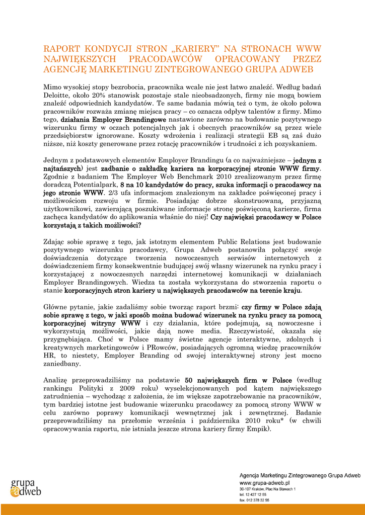 RAPORT KONDYCJI STRON „KARIERY” NA STRONACH WWW NAJWIĘKSZYCH PRACODAWCÓW OPRACOWANY PRZEZ AGENCJĘ MARKETINGU ZINTEGROWANEGO GRUPA ADWEB Mimo wysokiej stopy bezrobocia, pracownika wcale nie jest łatwo znaleźć. Według badań Deloitte, około 20% stanowisk pozostaje stale nieobsadzonych, firmy nie mogą bowiem znaleźć odpowiednich kandydatów. Te same badania mówią też o tym, że około połowa pracowników rozważa zmianę miejsca pracy – co oznacza odpływ talentów z firmy. Mimo tego, działania Employer Brandingowe nastawione zarówno na budowanie pozytywnego wizerunku firmy w oczach potencjalnych jak i obecnych pracowników są przez wiele przedsiębiorstw ignorowane. Koszty wdrożenia i realizacji strategii EB są zaś dużo niższe, niż koszty generowane przez rotację pracowników i trudności z ich pozyskaniem. Jednym z podstawowych elementów Employer Brandingu (a co najważniejsze – jednym z najtańszych) jest zadbanie o zakładkę kariera na korporacyjnej stronie WWW firmy. Zgodnie z badaniem The Employer Web Benchmark 2010 zrealizowanym przez firmę doradczą Potentialpark, 8 na 10 kandydatów do pracy, szuka informacji o pracodawcy na jego stronie WWW. 2/3 ufa informacjom znalezionym na zakładce poświęconej pracy i możliwościom rozwoju w firmie. Posiadając dobrze skonstruowaną, przyjazną użytkownikowi, zawierającą poszukiwane informacje stronę poświęconą karierze, firma zachęca kandydatów do aplikowania właśnie do niej! Czy najwięksi pracodawcy w Polsce korzystają z takich możliwości? Zdając sobie sprawę z tego, jak istotnym elementem Public Relations jest budowanie pozytywnego wizerunku pracodawcy, Grupa Adweb postanowiła połączyć swoje doświadczenia dotyczące tworzenia nowoczesnych serwisów internetowych z doświadczeniem firmy konsekwentnie budującej swój własny wizerunek na rynku pracy i korzystającej z nowoczesnych narzędzi internetowej komunikacji w działaniach Employer Brandingowych. Wiedza ta została wykorzystana do stworzenia raportu o stanie korporacyjnych stron kariery u największych pracodawców na terenie kraju. Główne pytanie, jakie zadaliśmy sobie tworząc raport brzmi: czy firmy w Polsce zdają sobie sprawę z tego, w jaki sposób można budować wizerunek na rynku pracy za pomocą korporacyjnej witryny WWW i czy działania, które podejmują, są nowoczesne i wykorzystują możliwości, jakie dają nowe media. Rzeczywistość, okazała się przygnębiająca. Choć w Polsce mamy świetne agencje interaktywne, zdolnych i kreatywnych marketingowców i PRowców, posiadających ogromną wiedzę pracowników HR, to niestety, Employer Branding od swojej interaktywnej strony jest mocno zaniedbany. Analizę przeprowadziliśmy na podstawie 50 największych firm w Polsce (według rankingu Polityki z 2009 roku) wyselekcjonowanych pod kątem największego zatrudnienia – wychodząc z założenia, że im większe zapotrzebowanie na pracowników, tym bardziej istotne jest budowanie wizerunku pracodawcy za pomocą strony WWW w celu zarówno poprawy komunikacji wewnętrznej jak i zewnętrznej. Badanie przeprowadziliśmy na przełomie września i października 2010 roku* (w chwili opracowywania raportu, nie istniała jeszcze strona kariery firmy Empik). KONDYCJA STRON KARIERY - RAPORT Raport szczegółowy, odpowiada na takie pytania jak: Ile firm w Polsce posiada strony lub zakładki poświęcone karierze? Czy są to martwe czy aktywne strony? Czy firmy dbają o aktualność ofert pracy oraz ile firm korzysta z formularzy rekrutacyjnych. Jak najwięksi pracodawcy w Polsce wykorzystują nowoczesne narzędzia komunikacji do kontaktu z potencjalnymi kandydatami? Czy social media pozostają w kręgu zainteresowań dużych firm? Czy firmy zachowują interakcję z potencjalnymi przyszłymi pracownikami? Czy firmy w jakikolwiek sposób zachęcają potencjalnych kandydatów, prezentując im wartości, jakim hołduje firma lub omawiając benefity i możliwości rozwoju w firmie? Świadomość budowania wizerunku pracodawcy za pomocą witryny WWW Rozpoczynając badania spodziewaliśmy się, że wszystkie firmy z TOP 50 będą na tyle świadome, by posiadać na swojej stronie lub osobnej domenie zakładkę poświęconą karierze w firmie. Okazało się jednak, że co piąta firma (22%) takiej zakładki (ani osobnej strony) nie posiada i nie dba tym samym o to, by umożliwić potencjalnym kandydatom do pracy zaznajomienie się z możliwościami, jakie daje. Obecnośd zakładki kariera NIE 22% TAK 78% Aby osoba zainteresowana pracą w danej firmie mogła zapoznać się z jej propozycjami i informacjami kierowanymi do potencjalnych pracowników, musi mieć łatwość znalezienia interesujących ją informacji. Skupiliśmy się, więc na sprawdzeniu tego, czy znalezienie informacji o możliwościach kariery i rekrutacji jest łatwe. Wśród firm posiadających zakładki kariery, większość zadbała o łatwość znalezienia ich przez kandydatów – 78% firm dostęp do interesującej pracowników i potencjalnych pracowników części witryny ma z poziomu strony głównej. Przy 5% witryn trzeba się jednak sporo namęczyć by odnaleźć interesujące informacje (przejście od strony głównej firmy do zakładki kariera wymaga przynajmniej 3 kliknięć). Jedna zaledwie firma pokusiła się o to, by informacje dotyczące pracy w firmie umieścić na osobnej stronie z własną domeną (Jeronimo Martins Dystrybucja SA - http://www.karierawjmd.pl/). KONDYCJA STRON KARIERY - RAPORT osobna strona 3 klikniecia 3% 5% Łatwośd dotarcia do zakładki kariera 2 kliknięcia 15% 1 kliknięcie 77% Ciekawie rozwiązała też kwestię zakładki o pracy Skanska, która nie tylko umieściła link do zakładki na stronie głównej, ale dodała również pop-up w najbardziej widocznym z punktu widzenia eye trackingu miejscu witryny. Analizując miejsce umieszczenia zakładki kariera na stronie głównej widać wyraźnie, że projektanci witryn nie z