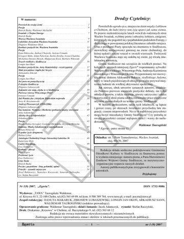 Drodzy Czytelnicy! W numerze: Powrócił do swojej ziemi . . . . . . . . . . . . . . . . . . . . . . . . . . . . . . . . . . . . Poezja . . . . . . . . . . . . . . . . . . . . . . . . . . . . . . . . . . . . . . . . . . . . . . . . . . Henryk Radej, Waldemar Michalski Iwaniuk z Chojna Starego . . . . . . . . . . . . . . . . . . . . . . . . . . . . . . . . . . . Henryk Radej Wiersze Wacława Iwaniuka . . . . . . . . . . . . . . . . . . . . . . . . . . . . . . . . . Lubelskie Jeruzalem Wacława Iwaniuka . . . . . . . . . . . . . . . . . . . . . . Zbigniew Waldemar Okoń Konkurs poetycki im. Wacława Iwaniuka . . . . . . . . . . . . . . . . . . . . . . Poezja . . . . . . . . . . . . . . . . . . . . . . . . . . . . . . . . . . . . . . . . . . . . . . . . . Irena Żukowska, Andrzej Chojecki, Justyna Czmuda Grzegorz Słaby, Adam Palestran, Emilia Ziemba, Iwona Chudoba, Michalina Deniusz-Rosiak, Małgorzata Koza, Barbara Wdowiak Trzech wielkich z Siedliszcza . . . . . . . . . . . . . . . . . . . . . . . . . . . . . . . . Longin Jan Okoń Konkurs poetycki im. Anny Kamieńskiej - rozstrzygniety . . . . . . . . . . Małe jest piękne: kapliczki i krzyże . . . . . . . . . . . . . . . . . . . . . . . . . . . Aleksandra Zińczuk Poezja . . . . . . . . . . . . . . . . . . . . . . . . . . . . . . . . . . . . . . . . . . . . . . . . . Longin Jan Okoń Już pora na poetycką ucztę . . . . . . . . . . . . . . . . . . . . . . . . . . . . . . . . . . Z dziejów Siedliszcza . . . . . . . . . . . . . . . . . . . . . . . . . . . . . . . . . . . . . . . Zbigniew Lubaszewski Judymów nie sieją, chyba że w Siedliszczu . . . . . . . . . . . . . . . . . . . Pierwsze wiersze Wincentego Pola? . . . . . . . . . . . . . . . . . . . . . . . . . . . Ireneusz Czmuda Jak Wandeczka z księdzem Zalewskim wojowała . . . . . . . . . . . . . . . . Jerzy R. Krzyżanowski Andrzej Piwowarczyk (1930-2006) . . . . . . . . . . . . . . . . . . . . . . . . . . . . Zbigniew Lubaszewski Sny kamieni. Niemena i Herberta spotkania między wierszami . . . . . Anna Łukomska Afryką chcę ci odpowiedzieć . . . . . . . . . . . . . . . . . . . . . . . . . . . . . . . . . Arkadiusz Sann Poezja . . . . . . . . . . . . . . . . . . . . . . . . . . . . . . . . . . . . . . . . . . . . . . . . . . Wanda Halina Szczygieł, Czesława Michańska, Krystyna Wiśnicka Kamena. Między lokalizmem a regionalizmem . . . . . . . . . . . . . . . . . . Renata Holaczuk O godne życie (fragment) . . . . . . . . . . . . . . . . . . . . . . . . . . . . . . . . . . . Halina Leśna Antologia Chełmskiej Grupy Literackiej Lubelska 36 . . . . . . . . . . . . Katarzyna Mróz Ludzie listy piszą... . . . . . . . . . . . . . . . . . . . . . . . . . . . . . . . . . . . . . . . . Ewa Turkiewicz Grabarz – filozof . . . . . . . . . . . . . . . . . . . . . . . . . . . . . . . . . . . . . . . . . . Piotr Gajew Przetrwać życie . . . . . . . . . . . . . . . . . . . . . . . . . . . . . . . . . . . . . . . . . . . Ewa Turkiewicz Listy Steda . . . . . . . . . . . . . . . . . . . . . . . . . . . . . . . . . . . . . . . . . . . . . . . Henryk Radej Poczta z pazurkiem - listy, polemiki, opinie . . . . . . . . . . . . . . . . . . . . . Fraszki – rysunki satyryczne . . . . . . . . . . . . . . . . . . . . . . . . . . . . . . . . Józef Bułatowicz, Stanisław Koszewski, Saturian Naliwajko, rys. Stefan Raczyński 2 6 Powrócił do ogrodu ojca, miejsca na ziemi między Lublinem a Chełmem, do ludzi którzy tam żyją uparci jak sama ziemia. Po prawie siedemdziesięciu latach wrócił do rodzinnych stron Wacław Iwaniuk, wybitny poeta i odważny żołnierz, emigrant, który nigdy nie pogodził się z pojałtańskim podziałem Europy, i dla którego w powojennej polskiej literaturze zabrakło miejsca. Urna z prochami Poety spoczęła na cmentarzu w Siedliszczu, niewielkiej miejscowości gminnej na ziemi chełmskiej, do której tęsknił i często wracał w swoich wierszach. Twórczość Wacława Iwaniuka staje się ozdobą tej ziemi, jej trwałą intelektualną wartością. Gmina Siedliszcze ma szczęście do wielkich postaci. Na kolejnych stronach niniejszej Egerii* wspominamy sylwetki: Wacława Rzewuskiego, Wincentego Pola, Andrzeja Kazimierza Jaworskiego i Wincentego Okonia. Przypominamy też niezwykłą postać doktora Aleksandra Bałasza, siedliskiego Judyma, który w latach pięćdziesiątych ubiegłego wieku porywał miejscową ludność do wielkiej aktywności społecznej. Jak zawsze, obok utworów uznanych autorów, znajdziecie Państwo pierwsze nieśmiałe poetyckie debiuty, nie tylko młodych poetów, a także recenzje, utwory satyryczne i szkice historyczne. Całość pisma zdobią różnorodne prace plastyczne artystów zamieszkałych na terenie gminy Siedliszcze. W historii społeczeństw, także tych lokalnych, są lepsze i gorsze czasy, po okresach świetności przychodzą lata stagnacji, czasem niepowodzeń. Na co w najbliższej przyszłości mogą liczyć mieszkańcy Gminy Siedliszcze? Czy potrafią ze swojej przeszłości czerpać najlepsze treści i wzory do naśladowania? Waldemar Taurogiński * Egeria - patrz strona 13 7 9 11 13 14 16 17 18 21 22 23 30 34 36 38 40 42 43 44 45 Okładka: str. 1 Piotr Tymochowicz, Wacław Iwaniuk, olej, 90x70, 2007 46 49 50 Redakcja składa serdeczne podziękowanie Gminnemu Ośrodkowi Kultury w Siedliszczu za finansową pomoc w wydaniu niniejszego numeru pisma, a Panu Hieronimowi Zonikowi Wójtowi Gminy Siedliszcze, za merytoryczno-organizacyjne wsparcie naszych działań. Autorzy publikowanych prac zrezygnowali z honorariów autorskich. Dziękujemy . 51 52 53 54 Nr 1(9) 2007, „Egeria”. ISSN 1732-9086.. Wydawca: „TAWA” Taurogiński Waldemar, ul. Krzywa 41/3, 22-100 Chełm, tel.(82) 565 69 09, tel.kom. 0 508 389 764, www.tawa.pl, e-mail: [email protected] Zespół redakcyjny: DANUTA MAKARUK, ZBIGNIEW LUBASZEWSKI, LONGIN JAN OKOŃ, ARKADIUSZ SANN, WALDEMAR TAUROGIŃSKI (redaktor prowadzący). Opracowanie graficzne: Waldemar T