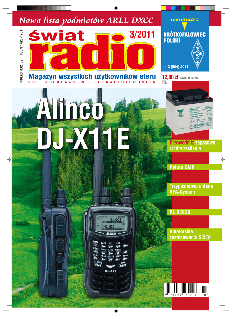 Nowa lista podmiotów ARLL DXCC INDEKS 332739 ISSN 1425-1701 3/2011 wewnątrz KRÓTKOFALOWIEC POLSKI nr 3 (554)/2011 Magazyn wszystkich u¿ytkowników eteru 12,00 z³ K R Ó T K O F A L A R S T W O C B R A D I O T E C H N I K A Alinco DJ-X11E nak³ad: 14 500 egz. w tym VAT 5% Przewodnik: zapasowe źródła zasilania Hytera DMR Trzypasmowa antena VPA-System RL-328CQ Amatorskie zastosowania Si570 ...Bieżące informacje W NUMERZEprzez 24 h na serwisie „Internetowy Świat Radiooperatora” Artykuł z okładki – str. 32 Alinco DJ-X11E Firma Alinco wprowadziła na rynek wysokiej klasy model odbiornika szerokozakresowego. DJ-X11E umożliwia odbiór zarówno emisji analogowych, jak i cyfrowych. Ten nowoczesny skaner częstotliwości zawiera podzakresy od 50 kHz do 1,3 GHz, detektory wielu emisji, począwszy od SSB, a skończywszy na szerokopasmowej FM, dużą liczbę pamięci i funkcji przeszukiwania. 3(184)/2011 S P Przed zakupem warto zapoznać się z konstrukcją i testem tego urządzenia. I S T R E Ś C AKTUALNOŚCI I 6 Wiadomości DX-owe dla krótkofalowców 13 Zawody 14 TEST Alinco DJ-X11E 32 ANTENY Trzypasmowa antena VPA-Systems 42 W numerze ŁĄCZNOŚĆ Propagacje jonosferyczne UKF 40 Diagram Smitha (2) 52 PREZENTACJA HYTERA DMR 29 Radiotelefon RL-328CQ 36 RADIOKOMUNIKACJA Zapasowe źródła zasilania w łączności radiowej RADIO RETRO Radiostacja RKA 38 WYWIAD Połączyła nas telegrafia 44 CB NET – 5 lat na rynku 50 HOBBY Si570 w zastosowaniach amatorskich 57 DYPLOMY Programy dyplomowe 49 DIGEST Nowości radiowe 60 FORUM CZYTELNIKÓW Porady 64 Listy 68 RYNEK I GIEŁDA 70 wewnątrz: KRÓTKOFALOWIEC POLSKI 3/2011 4 20 Wydawca miesięcznika „Świat Radio” (12 numerów w roku): AVT-Korporacja Sp. z o.o. ul. Leszczynowa 11, 03-197 Warszawa, tel. 22 257 84 99, faks 22 257 84 00, e-mail: [email protected], www.avt.pl Dyrektor Wydawnictwa: Wydawnictwo AVT należy Wiesław Marciniak do Izby Adres redakcji: 03-197 Warszawa, Wydawców Prasy ul. Leszczynowa 11, tel. 22 257 84 49, faks 22 257 84 67, www.swiatradio.pl e-mail: [email protected] Redaktor naczelny: Andrzej Janeczek, e-mail: [email protected], tel. 22 257 84 49 Stali współpracownicy: Marek Ambroziak SP5IYI, Roman Buja Zdzisław Bieńkowski SP6LB, Krzysztof Dąbrowski OE1KDA, Wojciech Nietyksza SP5FM, Miesięcznik wyróżniony Tadeusz Raczek SP7HT, Odznaką Andrzej Sadowski SP6ECA, Honorową Piotr Skrzypczak SP2JMR PZK Krzysztof Słomczyński SP5HS Opracowanie graficzne, redakcja techniczna i skład: Maria Drozdek, Adam Łowicki Internetowy Świat Radiooperatora: Przemysław Karwowski SP3FAR e-mail: [email protected] Dział Reklamy: Grzegorz Krzykawski, tel. 22 257 84 60, faks 22 257 84 67, e-mail: [email protected] Prenumerata: tel. 22 257 84 22-25, faks 22 257 84 00, e-mail: [email protected] Nakład: 14 500 egzemplarzy Świat Radio Marzec 2011 „Świat Radio” jest wyłącznym reprezentantem Polski w sieci czasopism organizacji członkowskich IARU. Artykułów niezamówionych nie zwracamy. Zastrzegamy sobie prawo do skracania i adiustacji nadesłanych artykułów. Za treść reklam i ogłoszeń nie ponosimy odpowiedzialności. Opisy urządzeń i układów elektronicznych oraz ich usprawnień zamieszczone w ŚR mogą być wykorzystane wyłącznie do własnych potrzeb. Wykorzystywanie ich do innych celów, zwłaszcza do działalności zarobkowej, wymaga zgody autora opisu. – www.swiatradio.pl... O D Str. 20 Zapasowe źródła zasilania W przypadku braku lub awarii sieć energetycznej konieczne jest wykorzystanie rezerwowych źródeł energii. Najczęściej używane są w tym celu akumulatory i agregaty prądotwórcze (rzadziej ogniwa słoneczne i elektrownie wiatrowe). W artykule przedstawiono przewodnik po wybranych dostępnych na rynku zapasowych źródłach zasilania w łączności radiowej. Str. 36 Radiotelefon RL-328CQ Radio Servcie ALFA, autoryzowany dealer Rexon Technology Corp., wprowadził na rynek radiotelefon przenośny RL-328CQ. Jest to 128-kanałowy radiotelefon przenośny VHF lub UHF (136–174 MHz lub UHF 400– 470 MHz), wyposażony m.in. w przycisk turbo podwyższający, w razie potrzeby, moc nadawczą do 6,5 W/VHF lub 5W/UHF oraz trzy tony do otwierania przemienników, wchodzący w skład rodziny modeli 328. Str. 42 Trzypasmowa antena VPA-Systems Prezentowana trzypasmowa antena Yagi, zaprojektowana przez DK7ZB, jest produkowana w kraju przez VPA-Systems. Jest to prosta antena multiband na pasma 6 m, 4 m i 2 m. Dzięki kompromisowym rozwiązaniom antena jest ekonomiczna i wygodna (zasilanie jednym kablem). Nadaje się do łączności lokalnych w pasmach 50/70/144 MHz i jest polecana początkującym radioamatorom. Str. 57 Si570 w zastosowaniach amatorskich Dostępny na rynku hybrydowy syntezer Si570 firmy Silicon Laboratories odznacza się dużą czystością widmową sygnału, znacznie większą aniżeli popularne syntezery cyfrowe DDS. Pomimo że nie był on pierwotnie przewidziany przez producenta do użycia w układach radiowych, a jedynie jako generator zegarowy dla systemów transmisji danych, znalazł on już wiele zastosowań w konstrukcjach krótkofalarskich. R E D A K C J I Dzisiaj, kiedy podstawowym źródłem zasilania urządzeń radiowych jest sieć energetyczna, nadal są wykorzystywane rezerwowe źródła energii (głównie akumulatory). Zapasowe źródła zasilania i nowości Zapasowe źródła zasilania to temat stary i uniwersalny, dotyczący nie tylko łączności radiowej. Już w czasach, kiedy radio raczkowało, a sieć energetyczna nie była powszechnie dostępna, produkowano baterie zapewniające między innymi zasilanie lamp radiowych, czyli przeznaczone do obwodu żarzenia oraz anodowego. Dzisiaj, kiedy podstawowym źródłem zasilania urządzeń radiowych jest sieć energetyczna, nadal są wykorzystywane rezerwowe źródła energii (głównie akumulatory). Muszą one być w pełnej sprawności wszędzie tam, gdzie wymagana jest bezawaryjna i ciągła praca urządzeń zasilanych