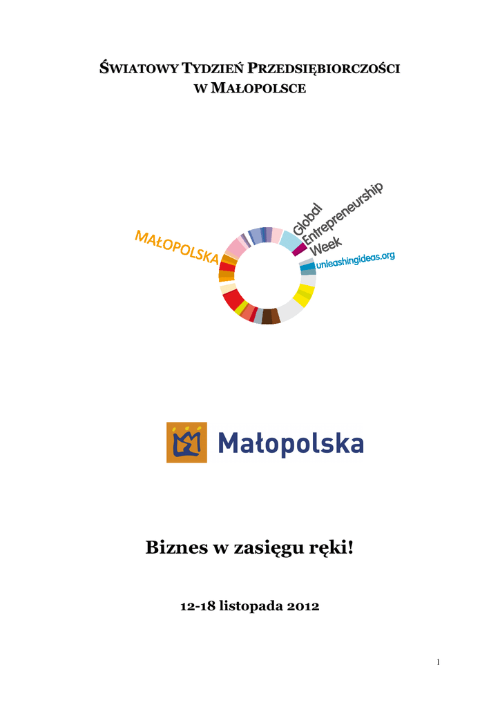 ŚWIATOWY TYDZIEŃ PRZEDSIĘBIORCZOŚCI W MAŁOPOLSCE Biznes w zasięgu ręki! 12-18 listopada 2012 1 I. Światowy Tydzień Przedsiębiorczości 1. Skąd pochodzi inicjatywa Światowego Tygodnia Przedsiębiorczości? Pomysłodawcami Światowego Tygodnia Przedsiębiorczości (ŚTP) są były premier Wielkiej Brytanii Gordon Brown i brytyjska rządowo-biznesowa organizacja Make Your Mark oraz prezes amerykańskiej Fundacji Kauffmana – Carl Schramm. Ten ruch społeczny o zasięgu globalnym, ma na celu utworzenie środowiska społecznego, które aktywnie wspiera przedsiębiorcze postawy i kreatywne inicjatywy młodych ludzi. Światowy Tydzień Przedsiębiorczości w 2012 roku obędzie się w dniach 12-18 listopada. Polska weźmie udział w wydarzeniach ŚTP już po raz piąty. Z każdą edycją współpracuje coraz więcej Partnerów. To przede wszystkim oni tworzą Tydzień Przedsiębiorczości, który wypełniony jest wydarzeniami o różnej formie i tematyce, a co za tym idzie, przyciąga coraz większe grono odbiorców. W klasyfikacji międzynarodowej nasz kraj plasuje się obecnie na czwartym miejscu pod względem liczby zorganizowanych w ramach ŚTP eventów. W tym roku, w Polsce, nad Światowym Tygodniem Przedsiębiorczości 2012 honorowy patronat objęli Ministerstwo Administracji i Cyfryzacji, Komisja Europejska, Polska Agencja Rozwoju Przedsiębiorczości oraz Proseed. 2. Kto stoi na czele przedsięwzięcia w Polsce? W skład ogólnopolskiego Komitetu Koordynacyjnego Przedsiębiorczości 2012 wchodzi: • Forum Młodych PKPP Lewiatan • Fundacja Młodzieżowej Przedsiębiorczości, • Fundacja Młodzieżowej Przedsiębiorczości, • Fundacja Polska Przedsiębiorcza, • Stowarzyszenie Freelancity.org. Światowego Tygodnia II. Światowy Tydzień Przedsiębiorczości w Małopolsce Od 2010 roku Województwo Małopolskie jest oficjalnym partnerem Światowego Tygodnia Przedsiębiorczości, a Urząd Marszałkowski Województwa Małopolskiego pełni funkcję koordynatora całości inicjatywy w Regionie. Szerokie partnerstwo, wielość i różnorodność wydarzeń, a także duże zainteresowanie (ok 2 500 uczestników) sprawiło, że Światowy Tydzień Przedsiębiorczości w Małopolsce 2010 odbywający się pod hasłem: Kreatywni na start! uznany został za najlepszą inicjatywę Global Entreprenurship Week w Polsce. W 2011 r. w przedsięwzięcie zaangażowało się 30 instytucji partnerskich oferując jeszcze bogatszy program. Dzięki zwiększeniu skali przedsięwzięcia aż 5 500 osób wzięło udział w wydarzeniach organizowanych w ramach ŚTP III. Światowy Tydzień Przedsiębiorczości w Małopolsce 2012 3. Co wyróżnia Światowy Tydzień Przedsiębiorczości spośród innych, prowadzonych w Małopolsce działań służących wsparciu przedsiębiorczości? Po pierwsze grupa odbiorców. To przede wszystkim uczniowie, studenci, absolwenci, osoby zainteresowane założeniem własnej działalności gospodarczej lub wzbogaceniem swojej 2 wiedzy, nabyciem umiejętności, które później mogą być wykorzystane na rynku pracy. W programie przedsięwzięcia znajdą się również wydarzenia dla przedsiębiorców, którzy chcą np. dowiedzieć się w jaki sposób zdobyć kapitał na rozwój firmy oraz poszerzyć wiedzę pomocną w prowadzeniu działalności gospodarczej. Po drugie jego globalny charakter. W ponad 120 krajach świata na sześciu kontynentach przez jeden tydzień (12-18 listopada 2012 r.) realizowane są równocześnie działania mające inspirować młodzież do rozwoju innowacji, wyobraźni i kreatywności, skłaniające do urzeczywistniania swoich pomysłów. w 2011 r. 10 milionów osób uczestniczyło w 37 tysiącach imprez, które zorganizowane zostały w ramach przedsięwzięcia na całym świecie. To młode, przedsiębiorcze osoby z całego świata, szukające swojej drogi zawodowej. Po trzecie atrakcyjny program oraz skala przedsięwzięcia. W przedsięwzięcie zaangażowało się 36 Partnerów oferując różnorodne działania mające na celu nie tylko pozyskanie nowej wiedzy, ale uświadomienie młodym ludziom korzyści płynących z bycia przedsiębiorczym. Od początku realizacji inicjatywy w Regionie jej koordynatorem jest Urząd Marszałkowski Województwa Małopolskiego. Wydarzenia w ramach Światowego Tygodnia Przedsiębiorczości w Małopolsce 2012 odbędą się w 9 miastach Małopolski tj. Krakowie, Tarnowie, Nowym Sączu, Bochni, Brzesku, Chrzanowie, Myślenicach, Suchej Beskidzkiej i Oświęcimiu, a także gminie Gorlice. 4. Biznes w zasięgu ręki! Pod takim hasłem w dniach 12-18 listopada 2012 roku odbywać się będzie Światowy Tydzień Przedsiębiorczości w Małopolsce w 2012 r. Chcesz: • obudzić w sobie ducha przedsiębiorczości? • dowiedzieć się jak założyć własną firmę, jak rozmawiać z inwestorem? • poznać przedsiębiorców (również Twoich rówieśników), którzy już osiągnęli sukces w biznesie? • zbadać swoje predyspozycje zawodowe? • wziąć udział w Gali Młodego Biznesu, warsztatach przedsiębiorczości czy biznes party? Podczas szkoleń, seminariów, warsztatów, wykładów, spotkań z przedsiębiorcami, konferencji, dyskusji i wielu innych wydarzeń organizowanych w ramach Światowego Tygodnia Przedsiębiorczości w Małopolsce przez uczelnie wyższe, instytucje wspierające przedsiębiorczość, urzędy pracy każdy będzie miał możliwość poznać odpowiedzi na te pytania. 5. Jakie instytucje zaangażowane są w realizację przedsięwzięcia? Po raz kolejny Województwo Małopolskie (Urząd Marszałkowski Województwa Małopolskiego) koordynuje całość przedsięwzięcia na poziomie Regionu. Inicjatywa realizowana będzie we współpracy m.in. ze szkołami wyższymi, instytucjami wspierającymi przedsiębiorczość, urzędami pracy – łącznie 36 Partnerami tj.: 1. Akademia Górniczo-Hutnicza im. St. Staszica w Krakowie 2. Uniwersytet Ekonomiczny w Krakowie 3 3. 4. 5. 6. 7. 8. Uniwersytet Jagiello