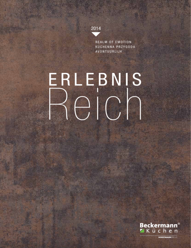 2014 REALM OF EMOTION KUCHENNA PRZYGODA AVONTUURLIJK ERLEBNIS Reich Title: WN Metallo braun This page: 37 Oak Greige Bernd Lampe, Geschäftsführer WILLKOMMEN WELCOME ZAPRASZAMY WELKOM Moderne Formen und Designs gepaart mit einer unnachahmlichen Haptik sind die Maximen, um den steigenden Ansprüchen unserer Kunden gerecht zu werden. Als einer der wenigen bietet Beckermann Küchen einen hohen Serienstandard sowie höchste Flexibilität in der Realisation individueller Kundenwünsche. Modern shapes and designs paired with an inimitable feel are the guiding principles we follow to meet the increasing demands of our customers. As one of the few, Beckermann Kitchens offers the highest standard in all its models and maximum flexibility in the realization of individual customer requirements. Nowoczesne wzornictwo idzie w ślad za rosnącymi oczekiwaniami naszych klientów. Jako jedna z nielicznych firma Beckermann oferuje wysoki standard seryjnej produkcji, jak również wysoką elastyczność w realizacji indywidualnych życzeń klientów. Moderne fronten en designs samen met een uniek gevoel zijn de principes om de groeiende wensen van onze klanten tegemoet te komen. Beckermann is één van de weinigen die een hoge standaard door het hele programma biedt, alsmede een hoge flexibiliteit in de realisatie van de wensen van iedere individuele klant. Trends wechseln – unsere Verantwortung für hohe Ansprüche bleibt. Nehmen Sie uns beim Wort! … Mehr als 117 Jahre Innovationsgeist und Erfahrung, modernste Technik und Freude an außergewöhnlich exklusiven Möbeln sind die Zutaten für eine Original Beckermann Küche. Mit maßgeschneiderten Lösungen schaffen wir die Grundlage für ein außergewöhnliches Küchenerlebnis. Trends may change but our responsibility to meet the highest demands never wavers. Take us at our word! ... More than 117 years of innovation and experience, cutting-edge technology and a spirit of enjoyment in working with an exceptionally exclusive product are the ingredients which make a Beckermann kitchen truly authentic. With our customized solutions we provide the basis for an exceptional kitchen experience. Trendy zmieniają się – nasza odpowiedzialność za wysokie wymogi pozostaje. Proszę trzymać nas za słowo. Ponad 117 lat doświadczenia i duch innowacji, najnowocześniejasza technika, radość z ekskluzywnych mebli są dodatkiem do oryginalnych kuchni Beckermann. Szyte na miarę rozwiązania tworzą podstawę do niezwykłej kuchennej przygody. Trends veranderen – maar onze verantwoordelijkheid hoge eisen blijft. Houdt u ons aan ons woord .... Meer dan 117 jaar innovatie en ervaring, de modernste techniek en liefde voor het werk met een exceptioneel exclusief product, zijn de ingrediënten, die een keuken tot een originele Beckermann maken. Met op maat gesneden oplossingen creëren wij de basis voor een buitengewone keukenbelevenis. 02 03 BECKERMANN: MEHR ALS 117 JAHRE ERFAHRUNG sche Revolution und ein Durchbruch für die innenarchitektonische Planung. Heute ist die Beckermann Küchen GmbH als Teil der international tätigen Horstmann Group ein solide am Markt positioniertes Unternehmen, das von seinen Partnern im Fachhandel hochgeschätzt wird. Seit über 117 Jahren beweist Beckermann ein Gespür für die stilgebenden Trends der Zeit. Es war im Jahr 1896, als Heinrich Beckermann das Unternehmen in Cappeln gründete. Wenig später wagte er mit eigens entwickelten Holzverarbeitungsmaschinen den Schritt zur industriellen Fabrikation. Die 1950er Jahre waren vom Wirtschaftswunder geprägt. Ein Jahrzehnt später feierte Beckermann im europäischen Ausland Erfolge und eroberte den Markt mit seinen exklusiven Einbauküchen. In den 1980er Jahren setzte das Unternehmen auf ein innovatives Rastersystem, das mehr Gestaltungsfreiheit garantiert. Eine ergonomi- MORE THAN 117 YEARS OF EXPERIENCE BECKERMANN: PONAD 117 LAT DOŚWIADCZENIA BECKERMANN MEER DAN 117 JAAR ERVARING For over 117 years, Beckermann has demonstrated a particular flair for setting styles and trends. It all began in 1896, when Heinrich Beckermann founded the company in Cappeln. Shortly afterwards, he ventured into kitchen technology and developed his own wood processing machine, taking the first step towards industrial kitchen production. The 1950s were dominated by the economic miracle. A decade later, the company celebrated success in Europe and with its exclusive fitted kitchen programme established a strong market presence. In the 1980s, the company introduced an innovative module system that guaranteed more design freedom. An ergonomic revolution and a breakthrough for interior design planning. Today as a part of the international Horstmann Group, Beckermann Kitchens GmbH enjoys a strong position in the international marketplace and is highly appreciated by its partners in the specialized trade. Od 117 lat Beckermann udowadnia dobre wyczucie obowiązujących trendów. Był rok 1896, kiedy Heinrich Beckermann założył przedsiębiorstwo w Cappeln. Krótko później, wykorzystując maszyny do obróbki drewna, rozpoczął produkcję przemysłową. Lata 50-te to okres cudu gospodarczego. Dziesięć lat później Beckermann święći triumf wchodząc z powodzeniem na inne rynki europejskie z ofertą ekskluzywnych kuchni do zabudowy. W latach osiemdziesiątych firma wprowadziła innowacyjny system rastrowy, gwarantujący więcej swobody w planowaniu przestrzeni. Następuje rewolucja w dziedzinie ergonomii i projektowania wnętrz. Dzisiaj Beckermann Küchen GmbH jest częścią międzynarodowej Horstmann Group, wysoko pozycjonowanej spółki na rynku międzynarodowym. Sinds meer dan 117 jaar bewijst Beckermann een fijne te hebben voor trendsetting. In 1896 stichtte Heinrich Beckermann de onderneming in Cappeln. Kort daarop nam hij de eerste stap met zelf ontwikkelde houtbewerkingmachines tot industriële fabricatie. De vijftiger jaren werden door het economisch wonder gedomineerd. Een decennium later behaa