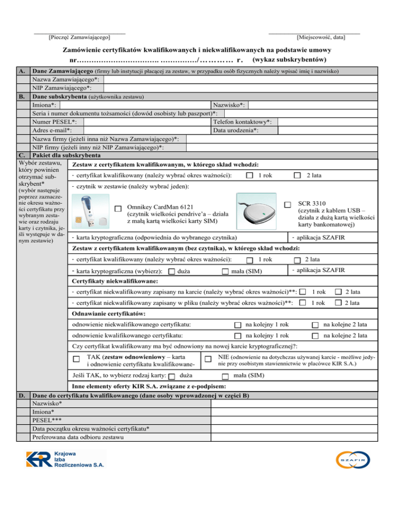 _______________________ _______________________ [Pieczęć Zamawiającego] [Miejscowość, data] Zamówienie certyfikatów kwalifikowanych i niekwalifikowanych na podstawie umowy nr……………………………. ……………/………… r. (wykaz subskrybentów) A. Dane Zamawiającego (firmy lub instytucji płacącej za zestaw, w przypadku osób fizycznych należy wpisać imię i nazwisko) Nazwa Zamawiającego*: NIP Zamawiającego*: B. Dane subskrybenta (użytkownika zestawu) Imiona*: Nazwisko*: Seria i numer dokumentu tożsamości (dowód osobisty lub paszport)*: Numer PESEL*: Telefon kontaktowy*: Adres e-mail*: Data urodzenia*: Nazwa firmy (jeżeli inna niż Nazwa Zamawiającego)*: NIP firmy (jeżeli inny niż NIP Zamawiającego)*: C. Pakiet dla subskrybenta Wybór zestawu, Zestaw z certyfikatem kwalifikowanym, w którego skład wchodzi: który powinien - certyfikat kwalifikowany (należy wybrać okres ważności): 1 rok 2 lata otrzymać subskrybent* - czytnik w zestawie (należy wybrać jeden): (wybór następuje poprzez zaznaczenie okresu ważności certyfikatu przy wybranym zestawie oraz rodzaju karty i czytnika, jeśli występuje w danym zestawie) SCR 3310 (czytnik z kablem USB – działa z dużą kartą wielkości karty bankomatowej) Omnikey CardMan 6121 (czytnik wielkości pendrive’a – działa z małą kartą wielkości karty SIM) - karta kryptograficzna (odpowiednia do wybranego czytnika) - aplikacja SZAFIR Zestaw z certyfikatem kwalifikowanym (bez czytnika), w którego skład wchodzi: - certyfikat kwalifikowany (należy wybrać okres ważności): - karta kryptograficzna (wybierz): duża 1 rok mała (SIM) 2 lata - aplikacja SZAFIR Certyfikaty niekwalifikowane: - certyfikat niekwalifikowany zapisany na karcie (należy wybrać okres ważności)**: 1 rok 2 lata - certyfikat niekwalifikowany zapisany w pliku (należy wybrać okres ważności)**: 1 rok 2 lata Odnawianie certyfikatów: odnowienie niekwalifikowanego certyfikatu: na kolejny 1 rok na kolejne 2 lata odnowienie kwalifikowanego certyfikatu: na kolejny 1 rok na kolejne 2 lata Czy certyfikat kwalifikowany ma być odnowiony na nowej karcie kryptograficznej?: TAK (zestaw odnowieniowy – karta i odnowienie certyfikatu kwalifikowanego) Jeśli TAK, to wybierz rodzaj karty: duża NIE (odnowienie na dotychczas używanej karcie - możliwe jedynie przy osobistym stawiennictwie w placówce KIR S.A.) mała (SIM) Inne elementy oferty KIR S.A. związane z e-podpisem: D. Dane do certyfikatu kwalifikowanego (dane osoby wprowadzonej w części B) Nazwisko* Imiona* PESEL*** Data początku okresu ważności certyfikatu* Preferowana data odbioru zestawu Adres e-mail Organizacja (nazwa firmy) Adres pocztowy organizacji (ulica nr, kod pocztowy, miejscowość, województwo) E. 10. 11. 12. 13. 14. 15. 16. 17. 18. Inne dane (np. stanowisko lub nazwa własna, czyli dowolna nazwa certyfikatu określona przez klienta – standardowo wpisywane jest: imiona i nazwisko) Dane do certyfikatu niekwalifikowanego (dane osoby wprowadzonej w części B) Nazwisko* Imiona* Nazwa własna* (dowolna nazwa certyfikatu określona przez klienta, np. imię i nazwisko) Adres e-mail * Data początku okresu ważności certyfikatu* Preferowana data odbioru zestawu (jeżeli nie została wskazana powyżej) Organizacja (nazwa firmy) Adres pocztowy organizacji (ulica nr, kod pocztowy, miejscowość, województwo) Inne dane (np. stanowisko lub szczególne zastosowania certyfikatu – w standardzie w certyfikacie niekwalifikowanym zaznacza się następujące zastosowania: podpis elektroniczny, szyfrowanie dokumentów, niezaprzeczalność, uwierzytelnianie klienta, ochrona poczty) * - pola obowiązkowe ** - opłata za certyfikat niekwalifikowany wydany razem z certyfikatem kwalifikowanym zgodnie z cennikiem ***- zamiast numeru PESEL można podać NIP subskrybenta (użytkownika zestawu) – pole obowiązkowe _______________________________________________________ podpisy osób, które zawarły w imieniu Zamawiającego umowę na świadczenie usług certyfikacyjnych lub osób upoważnionych do reprezentowania Zamawiającego