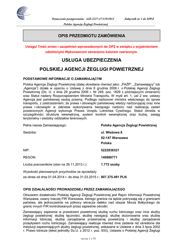 Oznaczenie postępowania: AJZ-2227-47/119/2013 Załącznik nr 1 do SIWZ Polska Agencja Żeglugi Powietrznej OPIS PRZEDMIOTU ZAMÓWIENIA Uwaga! Treść zmian i uzupełnień wprowadzonych do OPZ w związku z wyjaśnieniami udzielonymi Wykonawcom oznaczono kolorem czerwonym. USŁUGA UBEZPIECZENIA POLSKIEJ AGENCJI ŻEGLUGI POWIETRZNEJ PODSTAWOWE INFORMACJE O ZAMAWIAJĄCYM Polska Agencja Żeglugi Powietrznej (dalej określana również jako: „PAŻP”, „Zamawiający” lub „Agencja”) działa w oparciu o Ustawę z dnia 8 grudnia 2006 r. o Polskiej Agencji Żeglugi Powietrznej (Dz. U. z dnia 29 grudnia 2006 r. Nr 249, poz. 1829 z późniejszymi zmianami) oraz Statut nadany Rozporządzeniem Ministra Transportu. W myśl art. 1, ust 2 ww. ustawy Agencja jest państwową osobą prawną. Podlega nadzorowi ministra właściwego do spraw transportu, z zastrzeżeniem, że prawa i obowiązki państwowej władzy nadzorującej oraz inne prawa i obowiązki w zakresie wykonywania bieżącego nadzoru nad realizacją zadań powierzonych Agencji wykonuje Prezes Urzędu Lotnictwa Cywilnego. Statut określa w szczególności strukturę wewnętrzną, system kontroli wewnętrznej oraz liczbę, zasięg terytorialny i siedziby oddziałów terenowych. Pełna nazwa Zamawiającego: Polska Agencja Żeglugi Powietrznej Siedziba: ul. Wieżowa 8 02-147 Warszawa Polska NIP: 5222838321 REGON: 140886771 Liczba pracowników (stan na 26.11.2013 r.) 1.772 osoby Wysokość planowanych przychodów ze sprzedaży za okres od dnia 01.04.2014 r. do dnia 31.03.2015 r.: 807.375.491 PLN OPIS DZIAŁALNOŚCI PROWADZONEJ PRZEZ ZAMAWIAJĄCEGO Obszarem działalności Polskiej Agencji Żeglugi Powietrznej jest Rejon Informacji Powietrznej Warszawa, zwany inaczej FIR Warszawa, którego granice na lądzie pokrywają się z granicami państwa, ale jednocześnie na północy wkracza daleko nad obszar Morza Bałtyckiego do granic innych FIR kontrolowanych przez sąsiednie ośrodki. Zamawiający zapewnia w przestrzeni powietrznej służbę ruchu lotniczego oraz inne służby żeglugi powietrznej: służbę łączności, służbę nawigacji, służbę dozorowania oraz służbę informacji lotniczej, służbę zarządzania przestrzenią powietrzną i służbę zarządzania przepływem ruchu lotniczego. Zamawiający realizuje również inne zadania niż określone dla instytucji zapewniających służby żeglugi powietrznej, wskazane w Ustawie z dnia 3 lipca 2002 r. Prawo lotnicze (tekst jednolity Dz.U. z 2012 r. poz. 933), Ustawie o Polskiej Agencji Żeglugi strona 1 z 95 Oznaczenie postępowania: AJZ-2227-47/119/2013 Załącznik nr 1 do SIWZ Polska Agencja Żeglugi Powietrznej Powietrznej (Dz.U. z 2006 r. Nr 249, poz. 1829 z późn. zmianami) oraz w Statucie PAŻP (tj. Rozporządzenie Ministra Transportu w sprawie nadania statutu Polskiej Agencji Żeglugi Powietrznej - Dz.U. z 2007 r., Nr 56, poz. 378), a w szczególności: dostarcza uczestnikom przestrzeni powietrznej informacje meteorologiczne; dokonuje zakupu, utrzymuje oraz modernizuje urządzenia i systemy łączności lotniczej, nawigacji i dozorowania przestrzeni powietrznej; kontroluje z powietrza systemy łączności lotniczej, nawigacji i dozorowania przestrzeni powietrznej; prowadzi działalność badawczo-rozwojową w zakresie żeglugi powietrznej; zapewnia projektowanie procedur lotu. Agencja zapewnia koordynację działań poszukiwawczo-ratowniczych. Ponadto Agencja prowadzi monitorowanie zdrowia pracowników w obrębie zlokalizowanego w siedzibie Agencji Niepublicznego Zakładu Opieki Zdrowotnej Polskiej Agencji Żeglugi Powietrznej (NZOZ-PAŻP), funkcjonującego zgodnie z przepisami Ustawy o działalności leczniczej z dnia 15 kwietnia 2011 r. (Dz. U. Nr 112, poz. 654, z późn. zm.), a zgodnie treścią art. 17, ust. 4, lit. a) przywołanej Ustawy działalność ta kreuje obowiązek ubezpieczenia Agencji zgodnie z warunkami określonymi w Rozporządzeniu Ministra Finansów z dnia 22 grudnia 2011 r. (Dz U. Nr 293, poz. 1729) w sprawie obowiązkowego ubezpieczenia odpowiedzialności cywilnej podmiotu wykonującego działalność leczniczą. Zamawiający gospodaruje mieniem niezbędnym do wykonywania zadań wynikających z ustawy Prawo lotnicze oraz Statutu i Regulaminu organizacyjnego PAŻP. Główne składniki mienia stanowią grunty, budynki, budowle oraz urządzenia i systemy niezbędne do zarządzania ruchem lotniczym, a także urządzenia radionawigacyjne. Ze względu na zasięg działania PAŻP powyższy majątek rozmieszczony jest na terytorium całego kraju. Polska Agencja Żeglugi Powietrznej ma za zadanie zapewnienie warunków ciągłej, płynnej i efektywnej żeglugi powietrznej w polskiej przestrzeni powietrznej poprzez wykonywanie funkcji instytucji zapewniających służby żeglugi powietrznej, zarządzanie przestrzenią oraz zarządzanie przepływem ruchu lotniczego. Potwierdzeniem spełniania wymagań w ww. zakresie jest posiadany przez PAŻP Certyfikat Instytucji Zapewniającej Służby Żeglugi Powietrznej, wydany przez Prezesa Urzędu Lotnictwa Cywilnego. W celu utrzymania wysokiego poziomu jakości świadczonych usług wdrożony został zintegrowany system zarządzania jakością, środowiskowego i bhp, co zostało potwierdzone uzyskaniem certyfikatów zatwierdzenia jak niżej: Certyfikat Systemu Zarządzania Jakością na zgodność z normą ISO 9001:2008; Certyfikat Systemu Zarządzania Jakością w obszarze Służby Informacji Lotniczej (AIS) na zgodność z normą ISO 9001:2008; Certyfikat Systemu Zarządzania Środowiskowego na zgodność z normą ISO 14001:2004; Certyfikat Systemu Zarządzania Bezpieczeństwem i Ochroną Pracy na zgodność z normą PN-N -18001:2004. Na Polskiej Agencji Żeglugi Powietrznej spoczywa również obowiązek zapewnienia bezpieczeństwa operacji lotniczych. Zapewnienie bezpieczeństwa operacji ruchu lotniczego nad terytorium Polski, będące priorytetowym celem działania jednostki, wymaga dysponowania najwyższej klasy sprz