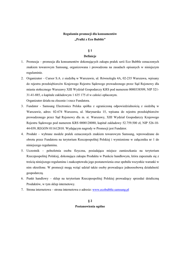 Regulamin promocji dla konsumentów „Pralki z Eco Bubble” §1 Definicje 1. Promocja – promocja dla konsumentów dokonujących zakupu pralek serii Eco Bubble oznaczonych znakiem towarowym Samsung, organizowana i prowadzona na zasadach opisanych w niniejszym regulaminie. 2. Organizator – Cursor S.A. z siedzibą w Warszawie, ul. Równoległa 4A, 02-235 Warszawa, wpisany do rejestru przedsiębiorców Krajowego Rejestru Sądowego prowadzonego przez Sąd Rejonowy dla miasta stołecznego Warszawy XIII Wydział Gospodarczy KRS pod numerem 0000338509, NIP 52131-41-885, o kapitale zakładowym 1 635 175 zł w całości opłaconym. Organizator działa na zlecenie i rzecz Fundatora. 3. Fundator - Samsung Electronics Polska spółka z ograniczoną odpowiedzialnością z siedzibą w Warszawie, adres: 02-674 Warszawa, ul. Marynarska 15, wpisana do rejestru przedsiębiorców prowadzonego przez Sąd Rejonowy dla m. st. Warszawy, XIII Wydział Gospodarczy Krajowego Rejestru Sądowego pod numerem KRS 0000128080, kapitał zakładowy 52.759.500 zł, NIP 526-1044-039, REGON 011612810. Wydającym nagrody w Promocji jest Fundator. 4. Produkt – wybrane modele pralek oznaczonych znakiem towarowym Samsung, wprowadzane do obrotu przez Fundatora na terytorium Rzeczpospolitej Polskiej i wymienione w załączniku nr 1 do niniejszego regulaminu. 5. Uczestnik – pełnoletnia osoba fizyczna, posiadająca miejsce zamieszkania na terytorium Rzeczpospolitej Polskiej, dokonująca zakupu Produktu w Punkcie handlowym, która zapoznała się z treścią niniejszego regulaminu i zaakceptowała jego postanowienia oraz spełniła wszystkie warunki w nim określone. W promocji mogą wziąć udział także osoby prowadzące jednoosobową działalność gospodarczą. 6. Punkt handlowy – sklep na terytorium Rzeczpospolitej Polskiej prowadzący sprzedaż detaliczną Produktów, w tym sklep internetowy. 7. Strona internetowa – strona internetowa o adresie: www.ecobubble.samsung.pl §2 Postanowienia ogólne 1. Niniejszy regulamin (dalej jako: „Regulamin Promocji”) określa: cel Promocji, warunki uczestnictwa w Promocji, czas trwania Promocji, sposób informowania o Promocji i jej warunkach, sposób składania skarg i wniosków związanych z Promocją. 2. Promocja prowadzona jest na terytorium Rzeczypospolitej Polskiej w sklepach stacjonarnych oraz sklepach internetowych prowadzących sprzedaż detaliczną Produktów Fundatora w okresie od dnia 2 października 2015 r. do dnia 30 listopada 2015 r. (termin zakupu Produktu w Promocji) i ma na celu zwiększenie sprzedaży Produktów Fundatora. 3. Promocja nie łączy się z innymi promocjami ogłaszanymi przez Organizatora i Fundatora. §3 Zasady uczestnictwa w Promocji 1. Warunkiem przystąpienia do Promocji jest zakup pralki z serii Eco Bubble oznaczonej znakiem towarowym Samsung. 2. Szczegółowe zestawienie pralek Samsung objętych Promocją, poprzez wskazanie ich modeli, zawiera Załącznik nr 1 do niniejszego Regulaminu. 3. Celem uzyskania nagrody Uczestnik powinien: a) dokonać zakupu Produktu w okresie trwania Promocji, b) przesłać za pośrednictwem Strony internetowej, prawidłowo wypełniony formularz zgłoszenia wraz z dołączonym skanem dowodu zakupu dokumentującego nabycie Produktu w Punkcie handlowym. Dowód zakupu powinien zawierać pełną nazwę Produktu (numer modelu), pod rygorem nieważności zgłoszenia. Zgłoszenie z dowodem zakupu, który nie zawiera pełnej nazwy Produktu zostanie odrzucone, jeśli Uczestnik nie potwierdzi Organizatorowi właściwego numeru modelu. 4. Przez prawidłowo wypełniony formularz zgłoszenia należy rozumieć w szczególności formularz wypełniony w sposób czytelny we wszystkich polach wskazanych jako obligatoryjne. Są to: - imię Uczestnika; - nazwisko Uczestnika; - ulica (adres zamieszkania Uczestnika); - nr domu (adres zamieszkania Uczestnika); - kod pocztowy (adres zamieszkania Uczestnika); - miasto (adres zamieszkania Uczestnika); - numer telefonu Uczestnika; - adres e-mail Uczestnika; - model zakupionej pralki; - numer seryjny zakupionej pralki; - data zakupu; - pełny adres sklepu, w którym dokonano zakupu. 5. Data i godzina zakupu Produktu, widniejąca na skanie dołączonego dowodu zakupu Produktu nie może być późniejsza niż data rejestracji formularza zgłoszeniowego za pośrednictwem Strony internetowej. 6. Za zakup Produktu w okresie trwania Promocji Uczestnikowi przysługiwać będzie nagroda w postaci Zestawu Eksperta do prania w zimnej wodzie, na który składają się: a) wygodny pojemnik na proszek do prania, b) dwa opakowania proszku Ariel: 3,5kg do prania białego i 3,5kg do prania kolorowego, c) płyn do płukania Lenor 1l, d) poradnik skutecznego prania o łącznej wartości 170,00 złotych brutto (słownie: sto siedemdziesiąt złotych brutto). 7. Liczba Nagród w promocji jest ograniczona i wynosi: 6000 nagród. W przypadku, gdy liczba zgłoszeń w Promocji przekroczy liczbę nagród, o uzyskaniu nagrody decydować będzie kolejność dokonania zgłoszenia w Promocji, zaś w przypadku takiej samej daty kolejność otrzymania zgłoszenia. 8. Wartość świadczenia jest zwolniona z podatku dochodowego od osób fizycznych na podstawie art. 21 ust. 1 pkt 68a ustawy z dnia 26 lipca 1991 r. o podatku dochodowym od osób fizycznych (t.j. Dz. U. z 2010 r., Nr 51, poz. 307). 9. Wszystkie zgłoszenia powinny być dokonane w terminie 30 dni od daty dokonania zakupu widniejącej na paragonie lub fakturze (o zachowaniu terminu decyduje data wpłynięcia zgłoszenia na serwer obsługujący ruch zgłoszeń dokonywanych za pośrednictwem Strony internetowej) nie później jak 30 grudnia 2015 r. do godziny 23:59:59. Zgłoszenia dokonane po tym terminie nie będą rozpatrywane. 10. Organizator dokona weryfikacji zgłoszeń nadsyłanych przez Uczestników w ciągu 10 dni roboczych od daty wpłynięcia zgłoszenia na serwer obsługujący ruch zgłoszeń dokonywanych za pośrednictwem Strony internetowej. Org
