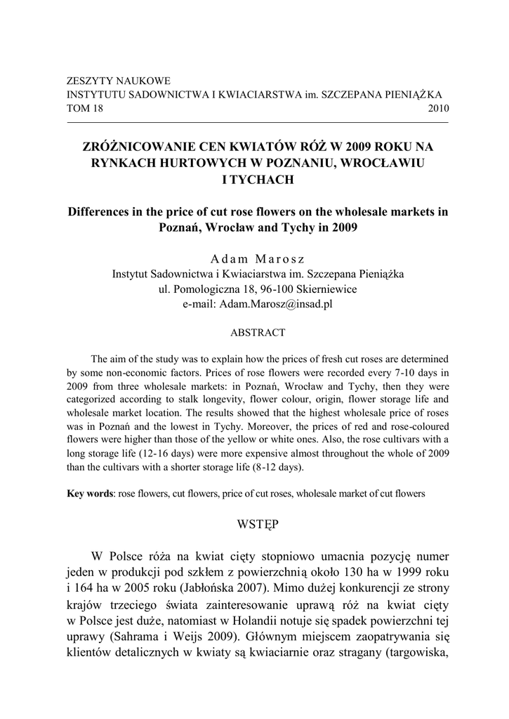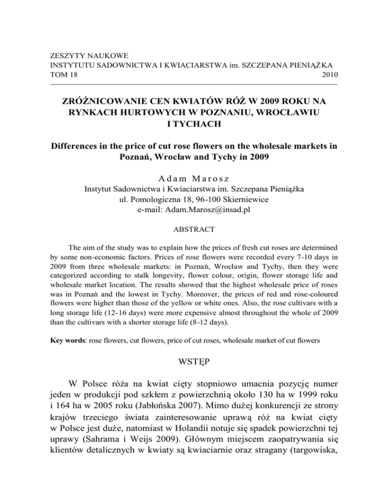 ZESZYTY NAUKOWE INSTYTUTU SADOWNICTWA I KWIACIARSTWA im. SZCZEPANA PIENIĄŻKA TOM 18 2010 ZRÓŻNICOWANIE CEN KWIATÓW RÓŻW 2009 ROKU NA RYNKACH HURTOWYCH W POZNANIU, WROCŁAWIU I TYCHACH Differences in the price of cut rose flowers on the wholesale markets in Poznań, Wrocł aw and Tychy in 2009 Adam Marosz Instytut Sadownictwa i Kwiaciarstwa im. Szczepana Pienią ż ka ul. Pomologiczna 18, 96-100 Skierniewice e-mail: [email protected] ABSTRACT The aim of the study was to explain how the prices of fresh cut roses are determined by some non-economic factors. Prices of rose flowers were recorded every 7-10 days in 2009 from three wholesale markets: in Poznań, Wrocł aw and Tychy, then they were categorized according to stalk longevity, flower colour, origin, flower storage life and wholesale market location. The results showed that the highest wholesale price of roses was in Poznańand the lowest in Tychy. Moreover, the prices of red and rose-coloured flowers were higher than those of the yellow or white ones. Also, the rose cultivars with a long storage life (12-16 days) were more expensive almost throughout the whole of 2009 than the cultivars with a shorter storage life (8-12 days). Key words: rose flowers, cut flowers, price of cut roses, wholesale market of cut flowers WSTĘP W Polsce róż a na kwiat cię ty stopniowo umacnia pozycjęnumer jeden w produkcji pod szkł em z powierzchniąokoł o 130 ha w 1999 roku i 164 ha w 2005 roku (Jabł ońska 2007). Mimo dużej konkurencji ze strony krajów trzeciego ś wiata zainteresowanie uprawąróżna kwiat cię ty w Polsce jest duże, natomiast w Holandii notuje sięspadek powierzchni tej uprawy (Sahrama i Weijs 2009). Gł ównym miejscem zaopatrywania się klientów detalicznych w kwiaty sąkwiaciarnie oraz stragany (targowiska, 234 Zeszyty Naukowe Instytutu Sadownictwa i Kwiaciarstwa im. Szczepana Pienią ż ka, tom 18 bazary, ulice). Od począ tku 2000 roku roś nie udziałsklepów wielkopowierzchniowych w handlu detalicznym kwiatami cię tymi oraz sieci dyskontowych oferujących duże iloś ci kwiatów cię tych i doniczkowych na ś wię ta, dzieńkobiet, dzieńmatki, popularne imieniny itp. (Marosz 2007). Zachodzą ce zmiany w handlu detalicznym wymagajązmian w obrocie hurtowym kwiatami. Jak podaje Jabł ońska (2005) w ostatnich latach na gieł dach w Polsce sprzedawano szacunkowo okoł o 90% kwiatów, a producenci osobiś cie sprzedajątam nawet 80% wł asnej produkcji. Najważniejszym elementem rynku umoż liwiają cym równoważenie podaż y i popytu na kwiaty jest cena. Stanowi ona istotny element podejmowania decyzji biznesowych po stronie producenta (podaż) i konsumenta (popyt) (Mruk 2003). Na cenękwiatów różna gieł dach wpł ywa wiele czynników, a najważ niejsze z nich to koszty produkcji kwiatów oraz poziom ich importu. Stąd zróż nicowanie cen mię dzy poszczególnymi rynkami hurtowymi w Polsce może byćznaczne. Celem przeprowadzonej analizy był o zgromadzenie aktualnych danych na temat cen kwiatów róż i poznanie pozaprodukcyjnych czynników determinują cych cenękwiatów na rynkach hurtowych. MATERIAŁI METODY Pierwotnym ź ródł em danych na temat cen kwiatów różw 2009 r. był y notowania cen na rynkach hurtowych. Analizowano ceny różw zależnoś ci od: dł ugoś ci pę du (od 40 cm do 100 cm; podziałna siedem grup wielkoś ciowych), barwy podstawowej (podział na 4 grupy: biał e i kremowe, żół te i pomarańczowe, róż owe, czerwone i bordowe), trwał oś ci kwiatu po ś cię ciu (dwie grupy: trwał oś ć8-12 dni i 12-16 dni). Porównują c ceny w zależ noś ci od dł ugoś ci pędu i barwy pominię to róż e o dł ugoś ci pędu 80 cm i dł uż sze oraz róż e dwubarwne z uwagi na niewiele danych. Informacje na temat trwał oś ci kwiatów poszczególnych odmian zebrano z dostę pnej literatury oraz katalogów handlowych firm hodowlanych. Dane dotyczą ce cen pozyskiwano co 7-10 dni, zwykle po aktualizacji cen z trzech dużych rynków hurtowych: Wielkopolskiej Gildii RolnoOgrodniczej (WGRO) w Poznaniu; Dolnoś lą skiego Centrum Hurtu Rolno Spożywczego we Wrocł awiu (DCHRS) oraz Śląskiej Gieł dy Kwiatowej w Tychach (ŚGK). Wybór miejsc hurtowej sprzedaży kwiatów był Zróż nicowanie cen kwiatów różw 2009 roku na rynkach hurtowych... 235 celowy, podyktowany na bieżą co prowadzonymi aktualizacjami cen kwiatów dostę pnymi on-line, na stronach internetowych wymienionych rynków hurtowych. Cenęś redniąarytmetycznąobliczano w zależnoś ci od dł ugoś ci pędu (ś rednia cena wszystkich odmian o okreś lonej dł ugoś ci ł odygi niezależ nie od barwy pąka); barwy kwiatu (ś rednia cena wszystkich odmian o okreś lonej barwie kwiatu niezależnie od dł ugoś ci pędu), ź ródł a pochodzenia (kwiaty importowane i krajowe niezależ nie od barwy i dł ugoś ci pę du) i pozbiorczej trwał oś ci kwiatu (odmiany o trwał oś ci od 8 do 12 dni i od 12 do 16 dni). Uzyskane wyniki opracowano metodami statystyki opisowej i przedstawiono w formie indeksów jednopodstawowych lub w wielkoś ciach absolutnych. WYNIKI I DYSKUSJA Spoś ród trzech analizowanych rynków hurtowych największy asortyment kwiatów różw 2009 r. odnotowano na ŚGK w Tychach, gdzie oferowano 48 odmian w kilku wyborach w zależ noś ci od dł ugoś ci pędu i pochodzenia (krajowe lub importowane), ł ą cznie asortyment wyniósł179 pozycji. Na rynku we Wrocł awiu (DCHRS) oferowano 40 odmian, a w Poznaniu (WGRO) tylko 35, wartoś ci te wyraźnie odstają od asortymentu podawanego przez Andrzejewskąi Bukalską(2003). Łą cznie na wszystkich gieł dach w 2009 roku można był o kupić56 róż nych odmian. Nie jest to duż a liczba, mimo iżpotencjałprodukcyjny krajowych ogrodników jest duż o wię kszy. Największądostę pnoś ćkwiatów róż w 2009 roku odnotowano w okresie od 5 lutego do końca marca oraz pod koniec roku. Na wymienionych rynkach dominuje asortyment róż importowanych, na przykł