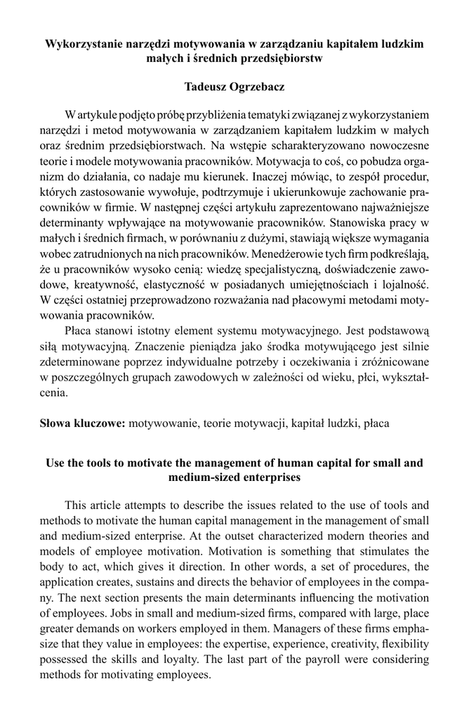 Wykorzystanie narzędzi motywowania w zarządzaniu kapitałem ludzkim małych i średnich przedsiębiorstw Tadeusz Ogrzebacz W artykule podjęto próbę przybliżenia tematyki związanej z wykorzystaniem narzędzi i metod motywowania w zarządzaniem kapitałem ludzkim w małych oraz średnim przedsiębiorstwach. Na wstępie scharakteryzowano nowoczesne teorie i modele motywowania pracowników. Motywacja to coś, co pobudza organizm do działania, co nadaje mu kierunek. Inaczej mówiąc, to zespół procedur, których zastosowanie wywołuje, podtrzymuje i ukierunkowuje zachowanie pracowników w firmie. W następnej części artykułu zaprezentowano najważniejsze determinanty wpływające na motywowanie pracowników. Stanowiska pracy w małych i średnich firmach, w porównaniu z dużymi, stawiają większe wymagania wobec zatrudnionych na nich pracowników. Menedżerowie tych firm podkreślają, że u pracowników wysoko cenią: wiedzę specjalistyczną, doświadczenie zawodowe, kreatywność, elastyczność w posiadanych umiejętnościach i lojalność. W części ostatniej przeprowadzono rozważania nad płacowymi metodami motywowania pracowników. Płaca stanowi istotny element systemu motywacyjnego. Jest podstawową siłą motywacyjną. Znaczenie pieniądza jako środka motywującego jest silnie zdeterminowane poprzez indywidualne potrzeby i oczekiwania i zróżnicowane w poszczególnych grupach zawodowych w zależności od wieku, płci, wykształcenia. Słowa kluczowe: motywowanie, teorie motywacji, kapitał ludzki, płaca Use the tools to motivate the management of human capital for small and medium-sized enterprises This article attempts to describe the issues related to the use of tools and methods to motivate the human capital management in the management of small and medium-sized enterprise. At the outset characterized modern theories and models of employee motivation. Motivation is something that stimulates the body to act, which gives it direction. In other words, a set of procedures, the application creates, sustains and directs the behavior of employees in the company. The next section presents the main determinants influencing the motivation of employees. Jobs in small and medium-sized firms, compared with large, place greater demands on workers employed in them. Managers of these firms emphasize that they value in employees: the expertise, experience, creativity, flexibility possessed the skills and loyalty. The last part of the payroll were considering methods for motivating employees. Wages are an important part of the incentive system. It is a basic motivational force. The importance of money as an incentive is strongly determined by individual needs and expectations, and is varied in the different occupational groups according to age, sex, education. Keywords: motivation, motivation theories, human capital, wage
