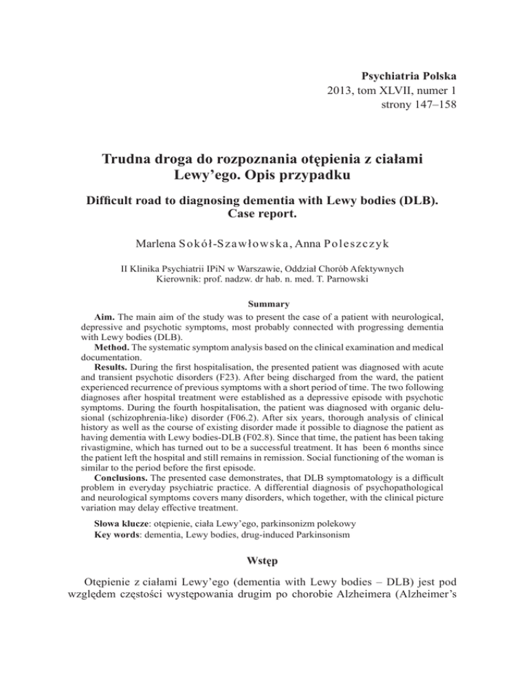 Psychiatria Polska 2013, tom XLVII, numer 1 strony 147–158 Trudna droga do rozpoznania otępienia z ciałami Lewy’ego. Opis przypadku Difficult road to diagnosing dementia with Lewy bodies (DLB). Case report. Marlena Sokół-Szawłowsk a , Anna P o l e s z c z y k II Klinika Psychiatrii IPiN w Warszawie, Oddział Chorób Afektywnych Kierownik: prof. nadzw. dr hab. n. med. T. Parnowski Summary Aim. The main aim of the study was to present the case of a patient with neurological, depressive and psychotic symptoms, most probably connected with progressing dementia with Lewy bodies (DLB). Method. The systematic symptom analysis based on the clinical examination and medical documentation. Results. During the first hospitalisation, the presented patient was diagnosed with acute and transient psychotic disorders (F23). After being discharged from the ward, the patient experienced recurrence of previous symptoms with a short period of time. The two following diagnoses after hospital treatment were established as a depressive episode with psychotic symptoms. During the fourth hospitalisation, the patient was diagnosed with organic delusional (schizophrenia-like) disorder (F06.2). After six years, thorough analysis of clinical history as well as the course of existing disorder made it possible to diagnose the patient as having dementia with Lewy bodies-DLB (F02.8). Since that time, the patient has been taking rivastigmine, which has turned out to be a successful treatment. It has been 6 months since the patient left the hospital and still remains in remission. Social functioning of the woman is similar to the period before the first episode. Conclusions. The presented case demonstrates, that DLB symptomatology is a difficult problem in everyday psychiatric practice. A differential diagnosis of psychopathological and neurological symptoms covers many disorders, which together, with the clinical picture variation may delay effective treatment. Słowa klucze: otępienie, ciała Lewy’ego, parkinsonizm polekowy Key words: dementia, Lewy bodies, drug-induced Parkinsonism Wstęp Otępienie z ciałami Lewy’ego (dementia with Lewy bodies – DLB) jest pod względem częstości występowania drugim po chorobie Alzheimera (Alzheimer’s 148 Marlena Sokół-Szawłowska, Anna Poleszczyk disease – AD) pierwotnie zwyrodnieniowym zespołem otępiennym. Lewy po raz pierwszy w 1912 r. opisał u chorych z chorobą Parkinsona (Parkinson’s disease – PD) równoczesną obecność zaburzeń psychicznych. Jednak dopiero na początku lat sześćdziesiątych Okazaki wykazał związek między występowaniem ciał Lewy’ego a otępieniem [1]. Chociaż zaburzenie to dotyczy 10–20% chorych z otępieniem, jest ono stosunkowo rzadko rozpoznawane. Być może ma na to wpływ bogata i stopniowo rozwijająca się symptomatologia. Obraz neuropatologiczny i jego związek z obrazem klinicznym Jak już wcześniej wspomniano, zmiany neuropatologiczne, z którymi mamy do czynienia w tym typie otępienia, to ciała Lewy’ego. Ich występowanie nie jest jednak patognomoniczne dla tej jednostki chorobowej. Bardziej istotna dla ustalenia tego rozpoznania jest ich lokalizacja – częstsza w korze limbicznej niż korze nowej i jądrach podkorowych. Przykładowo, większość ciał Lewy’ego u chorych na PD znajduje się w istocie czarnej. Głównym ich fibrylarnym składnikiem jest białko α-synukleina, która prawdopodobnie odgrywa rolę w tworzeniu pęcherzyków presynaptycznych [1, 2]. Drugą zmianą w omawianej jednostce nozologicznej są patologicznie zmienione neuryty – neuryty Lewy’ego występujące w warstwie CA2 i CA3 hipokampu, w korze limbicznej i jądrach podkorowych [1, 2]. Za pomocą metod immunohistochemicznych wykazano również obecność α-synukleiny. U chorych na DLB mogą występować także płytki β-amyloidowe, zwyrodnienie nerwowo-włókienkowe (zmiany typowo występujące w AD), zmiany gąbczaste i mikrowakuolizacja [3]. Nieznana jest w pełni rola zmian patologicznych typowych dla AD występujących w mózgach osób cierpiących na DLB. Wiadomo, że zespół objawów występujących u chorego zależy od udziału tych zmian, tj. bardziej typowy obraz DLB będzie występował u osoby z niewielkim udziałem zmian patologicznych charakterystycznych dla AD [4]. Zaburzenia neuroprzekaźnictwa obejmują drogi dopaminergiczne i cholinergiczne. Zmiany w postaci znacznego ubytku neuronów dopaminergicznych w istocie czarnej i regulacji „w górę” (zwiększenia liczby) receptorów D2 w prążkowiu znajdują swoje odzwieciedlenie w obrazie klinicznym [1]. U chorych pojawiają się ruchowe objawy pozapiramidowe. Zmiany w zakresie receptorów D2 odpowiadają prawdopodobnie za występujące u 50% chorych na DLB silne reakcje nadwrażliwości na neuroleptyki I generacji, obejmujące ciężkie objawy pozapiramidowe i zwiększoną śmiertelność [1, 4, 5]. Zmniejszona aktywność acetylotransferazy cholinowej w korze nowej wiąże się ze zmniejszeniem presynaptycznej aktywności cholinergicznej i zwiększeniem wiązania acetylocholiny w postsynaptycznych receptorach muskarynowych [1]. Aktywność acetylotransferazy cholinowej ma być mniejsza niż u chorych na AD, a receptory muskarynowe mają funkcjonować lepiej. Wynika z tego odpowiedź na leczenie inhibitorami acetylocholinesterazy u chorych na DLB. Występowanie omamów wzrokowych w obrazie chorobowym jest natomiast związane z zaburzeniami równowagi dopaminergiczno-cholinergicznej oraz gęstością ciał Lewy’ego w płacie skroniowym [6]. Trudna droga do rozpoznania otępienia z ciałami Lewy’ego 149 Warto w tym miejscu zaznaczyć, iż wykazano wyraźny związek pomiędzy nasileniem zmian neuropatologicznych, ich lokalizacją a rodzajem i ciężkością przebiegu choroby [4]. Na obraz kliniczny DLB składają się głównie trzy grupy objawów: psychopatologiczne, neurologiczne i zaburzenia funkcji poznawczych. Jeśli chodzi o pierwszą z nich, 