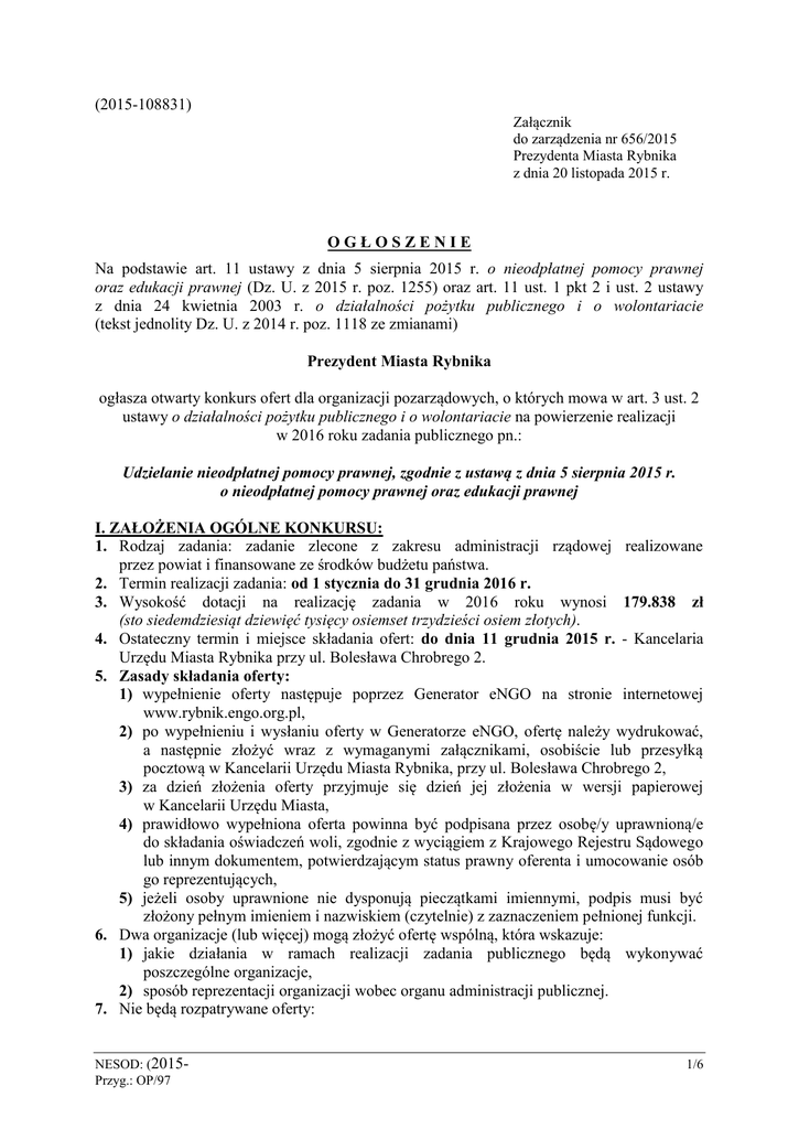 (2015-108831) Załącznik do zarządzenia nr 656/2015 Prezydenta Miasta Rybnika z dnia 20 listopada 2015 r. OGŁOSZENIE Na podstawie art. 11 ustawy z dnia 5 sierpnia 2015 r. o nieodpłatnej pomocy prawnej oraz edukacji prawnej (Dz. U. z 2015 r. poz. 1255) oraz art. 11 ust. 1 pkt 2 i ust. 2 ustawy z dnia 24 kwietnia 2003 r. o działalności pożytku publicznego i o wolontariacie (tekst jednolity Dz. U. z 2014 r. poz. 1118 ze zmianami) Prezydent Miasta Rybnika ogłasza otwarty konkurs ofert dla organizacji pozarządowych, o których mowa w art. 3 ust. 2 ustawy o działalności pożytku publicznego i o wolontariacie na powierzenie realizacji w 2016 roku zadania publicznego pn.: Udzielanie nieodpłatnej pomocy prawnej, zgodnie z ustawą z dnia 5 sierpnia 2015 r. o nieodpłatnej pomocy prawnej oraz edukacji prawnej I. ZAŁOŻENIA OGÓLNE KONKURSU: 1. Rodzaj zadania: zadanie zlecone z zakresu administracji rządowej realizowane przez powiat i finansowane ze środków budżetu państwa. 2. Termin realizacji zadania: od 1 stycznia do 31 grudnia 2016 r. 3. Wysokość dotacji na realizację zadania w 2016 roku wynosi 179.838 zł (sto siedemdziesiąt dziewięć tysięcy osiemset trzydzieści osiem złotych). 4. Ostateczny termin i miejsce składania ofert: do dnia 11 grudnia 2015 r. - Kancelaria Urzędu Miasta Rybnika przy ul. Bolesława Chrobrego 2. 5. Zasady składania oferty: 1) wypełnienie oferty następuje poprzez Generator eNGO na stronie internetowej www.rybnik.engo.org.pl, 2) po wypełnieniu i wysłaniu oferty w Generatorze eNGO, ofertę należy wydrukować, a następnie złożyć wraz z wymaganymi załącznikami, osobiście lub przesyłką pocztową w Kancelarii Urzędu Miasta Rybnika, przy ul. Bolesława Chrobrego 2, 3) za dzień złożenia oferty przyjmuje się dzień jej złożenia w wersji papierowej w Kancelarii Urzędu Miasta, 4) prawidłowo wypełniona oferta powinna być podpisana przez osobę/y uprawnioną/e do składania oświadczeń woli, zgodnie z wyciągiem z Krajowego Rejestru Sądowego lub innym dokumentem, potwierdzającym status prawny oferenta i umocowanie osób go reprezentujących, 5) jeżeli osoby uprawnione nie dysponują pieczątkami imiennymi, podpis musi być złożony pełnym imieniem i nazwiskiem (czytelnie) z zaznaczeniem pełnionej funkcji. 6. Dwa organizacje (lub więcej) mogą złożyć ofertę wspólną, która wskazuje: 1) jakie działania w ramach realizacji zadania publicznego będą wykonywać poszczególne organizacje, 2) sposób reprezentacji organizacji wobec organu administracji publicznej. 7. Nie będą rozpatrywane oferty: NESOD: (2015Przyg.: OP/97 1/6 1) wypełnione wyłącznie poprzez Generator eNGO lub złożone wyłącznie w wersji papierowej, 2) złożone po terminie wskazanym w ogłoszeniu o konkursie, 3) złożone przez nieuprawniony podmiot. 8. Oferty nie będą zwracane oferentom. 9. Rozstrzygnięcie konkursu: 1) nastąpi do dnia 15 grudnia 2015 r., 2) informacja o wynikach konkursu zostanie opublikowana w Biuletynie Informacji Publicznej Urzędu Miasta Rybnika bip.um.rybnik.eu, zakładka Organizacje pozarządowe/Realizacja zadań publicznych, na tablicy ogłoszeń Urzędu Miasta Rybnika (obok pokoju 005) oraz na stronie internetowej Miasta Rybnika www.rybnik.eu. 10. Wysokość środków finansowych na realizację zadania: 1) przekazanych w 2015 r. – 0 zł, w tym organizacje pozarządowe 0 zł, 2) zrealizowanych w 2014 r. – 0 zł, w tym organizacje pozarządowe 0 zł. 11. Złożenie oferty nie jest równoznaczne z przyznaniem dotacji. 12. Prezydent Miasta zastrzega sobie prawo do: 1) odwołania konkursu bez podania przyczyny, 2) przełożenia terminu rozstrzygnięcia konkursu, 3) ostatecznej interpretacji treści ogłoszenia. II. SZCZEGÓŁOWE ZAŁOŻENIA KONKURSU: 1. Zakres przedmiotowy zadania publicznego obejmuje prowadzenie trzech punktów nieodpłatnej pomocy prawnej w okresie od 1 stycznia do 31 grudnia 2016 r., w wymiarze 5 dni w tygodniu (tj. od poniedziałku do piątku), przez 4 godziny dziennie. 2. Punkty, o których mowa w ust. 1, usytuowane będą w: 1) budynku Zakładu Gospodarki Mieszkaniowej przy ul. 1 Maja 59, 2) budynku Administracji Domów Mieszkalnych Nr 2 przy ul. Patriotów 32, 3) budynku Ogniska Pracy Pozaszkolnej Zespołu „Przygoda” przy ul. Świerklańskiej 42a. 3. Punkty wyposażone są w niezbędne meble biurowe, tj. krzesła i biurko oraz posiadają dostęp do bezpłatnych baz danych aktów prawnych, tj. sejmowej bazy aktów prawnych dostępnej pod adresem http://isap.sejm.gov.pl, strony Rządowego Centrum Legislacji dostępnej pod adresem http://www.dziennikiurzedowe.gov.pl/ oraz portalu orzeczeń sądów powszechnych, dostępnego pod adresem: http://orzeczenia.ms.gov.pl. Wyposażenie punków zapewnia bezpieczne przechowywanie dokumentów, zawierających dane osobowe, uniemożliwiające dostęp do nich osobom nieupoważnionym. 4. W punktach zapewniony jest bezpłatny dostęp do sieci energetycznej oraz teleinformatycznej (podmiot wybrany w konkursie zostanie wyposażony na koszt Miasta w telefon komórkowy). Koszty mediów ponosić będzie Miasto Rybnik. 5. Określa się następujący harmonogram udzielania nieodpłatnej pomocy prawnej w punktach, o których mowa w ust. 2: 1) budynek Zakładu Gospodarki Mieszkaniowej przy ul. 1 Maja 59: a) poniedziałek, środa w godzinach od 13.00 do 17.00, b) wtorek, czwartek, piątek w godzinach od 9.00 do 13.00, 2) budynek Administracji Domów Mieszkalnych Nr 2 przy ul. Patriotów 32: a) poniedziałek, wtorek, środa w godzinach od 9.00 do 13.00, b) czwartek w godzinach od 12.00 do 16.00, c) piątek w godzinach od 8.00 do 12.00, NESOD: (2015Przyg.: OP/97 2/6 3) budynek Ogniska Pracy Pozaszkolnej Zespołu „Przygoda” przy ul. Świerklańskiej 42a: a) poniedziałek, środa, piątek w godzinach od 8.30 do 12.30, b) wtorek, czwartek w godzinach od 11.00 do 15.00. 6. Nieodpłatna pomoc prawna obejmuje sprawy z zakresu wskazanego w art. 3 ust. 1 ustawy z dnia 5 sierpni