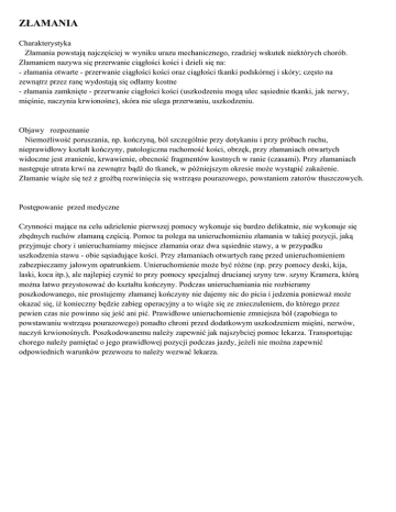 ZŁAMANIA Charakterystyka Złamania powstają najczęściej w wyniku urazu mechanicznego, rzadziej wskutek niektórych chorób. Złamaniem nazywa się przerwanie ciągłości kości i dzieli się na: - złamania otwarte - przerwanie ciągłości kości oraz ciągłości tkanki podskórnej i skóry; często na zewnątrz przez ranę wydostają się odłamy kostne - złamania zamknięte - przerwanie ciągłości kości (uszkodzeniu mogą ulec sąsiednie tkanki, jak nerwy, mięśnie, naczynia krwionośne), skóra nie ulega przerwaniu, uszkodzeniu. Objawy rozpoznanie NiemoŜliwość poruszania, np. kończyną, ból szczególnie przy dotykaniu i przy próbach ruchu, nieprawidłowy kształt kończyny, patologiczna ruchomość kości, obrzęk, przy złamaniach otwartych widoczne jest zranienie, krwawienie, obecność fragmentów kostnych w ranie (czasami). Przy złamaniach następuje utrata krwi na zewnątrz bądź do tkanek, w późniejszym okresie moŜe wystąpić zakaŜenie. Złamanie wiąŜe się teŜ z groźbą rozwinięcia się wstrząsu pourazowego, powstaniem zatorów tłuszczowych. Postępowanie przed medyczne Czynności mające na celu udzielenie pierwszej pomocy wykonuje się bardzo delikatnie, nie wykonuje się zbędnych ruchów złamaną częścią. Pomoc ta polega na unieruchomieniu złamania w takiej pozycji, jaką przyjmuje chory i unieruchamiamy miejsce złamania oraz dwa sąsiednie stawy, a w przypadku uszkodzenia stawu - obie sąsiadujące kości. Przy złamaniach otwartych ranę przed unieruchomieniem zabezpieczamy jałowym opatrunkiem. Unieruchomienie moŜe być róŜne (np. przy pomocy deski, kija, laski, koca itp.), ale najlepiej czynić to przy pomocy specjalnej drucianej szyny tzw. szyny Kramera, którą moŜna łatwo przystosować do kształtu kończyny. Podczas unieruchamiania nie rozbieramy poszkodowanego, nie prostujemy złamanej kończyny nie dajemy nic do picia i jedzenia poniewaŜ moŜe okazać się, iŜ konieczny będzie zabieg operacyjny a to wiąŜe się ze znieczuleniem, do którego przez pewien czas nie powinno się jeść ani pić. Prawidłowe unieruchomienie zmniejsza ból (zapobiega to powstawaniu wstrząsu pourazowego) ponadto chroni przed dodatkowym uszkodzeniem mięśni, nerwów, naczyń krwionośnych. Poszkodowanemu naleŜy zapewnić jak najszybciej pomoc lekarza. Transportując chorego naleŜy pamiętać o jego prawidłowej pozycji podczas jazdy, jeŜeli nie moŜna zapewnić odpowiednich warunków przewozu to naleŜy wezwać lekarza. ZWICHNIĘCIA, SKRĘCENIA I STŁUCZENIA Charakterystyka Zwichnięciem nazywamy przemieszczenie powierzchni stawowych kości, uszkodzenie torebki stawowej i więzadeł. Do zwichnięcia moŜe dojść wskutek upadku, urazu mechanicznego itp. Skręceniem nazywamy uszkodzenie tkanek miękkich okalających staw. Dochodzi do niego wskutek nieprawidłowych i gwałtownych ruchów, chodzenia po nie równym terenie itp. Stłuczenia to uszkodzenia tkanek, które powstają wskutek upadku na twarde podłoŜe i urazów tępymi przedmiotami. Uszkodzeniu ulegają drobne naczynia krwionośne, okostna, tkanka podskórna i mięśniowa, natomiast skóra jest nienaruszona. Objawy rozpoznanie Objawy w tych trzech wypadkach są podobne: Ostry ból, zniekształcenie stawu, ograniczenie lub całkowite upośledzenie ruchu w stawie, obrzęk, krwawe podbiegnięcia. Postępowanie przed medyczne Wskazane jest unieruchomienie stawu wraz z kośćmi za pomocą szyny i bandaŜa elastycznego lub chusty trójkątnej w takiej pozycji, jaką przybiera poszkodowany. Na uszkodzone miejsca przykłada się równieŜ zimne okłady. Po udzieleniu choremu pierwszej pomocy niezbędna jest konsultacja lekarska.