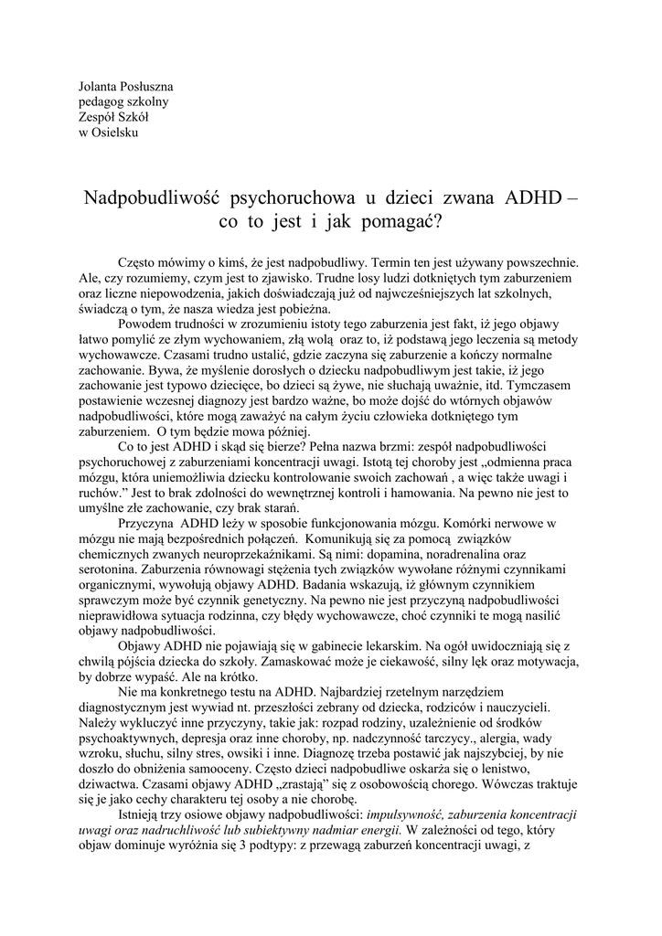 Jolanta Posłuszna pedagog szkolny Zespół Szkół w Osielsku Nadpobudliwość psychoruchowa u dzieci zwana ADHD – co to jest i jak pomagać? Często mówimy o kimś, Ŝe jest nadpobudliwy. Termin ten jest uŜywany powszechnie. Ale, czy rozumiemy, czym jest to zjawisko. Trudne losy ludzi dotkniętych tym zaburzeniem oraz liczne niepowodzenia, jakich doświadczają juŜ od najwcześniejszych lat szkolnych, świadczą o tym, Ŝe nasza wiedza jest pobieŜna. Powodem trudności w zrozumieniu istoty tego zaburzenia jest fakt, iŜ jego objawy łatwo pomylić ze złym wychowaniem, złą wolą oraz to, iŜ podstawą jego leczenia są metody wychowawcze. Czasami trudno ustalić, gdzie zaczyna się zaburzenie a kończy normalne zachowanie. Bywa, Ŝe myślenie dorosłych o dziecku nadpobudliwym jest takie, iŜ jego zachowanie jest typowo dziecięce, bo dzieci są Ŝywe, nie słuchają uwaŜnie, itd. Tymczasem postawienie wczesnej diagnozy jest bardzo waŜne, bo moŜe dojść do wtórnych objawów nadpobudliwości, które mogą zawaŜyć na całym Ŝyciu człowieka dotkniętego tym zaburzeniem. O tym będzie mowa później. Co to jest ADHD i skąd się bierze? Pełna nazwa brzmi: zespół nadpobudliwości psychoruchowej z zaburzeniami koncentracji uwagi. Istotą tej choroby jest „odmienna praca mózgu, która uniemoŜliwia dziecku kontrolowanie swoich zachowań , a więc takŜe uwagi i ruchów.” Jest to brak zdolności do wewnętrznej kontroli i hamowania. Na pewno nie jest to umyślne złe zachowanie, czy brak starań. Przyczyna ADHD leŜy w sposobie funkcjonowania mózgu. Komórki nerwowe w mózgu nie mają bezpośrednich połączeń. Komunikują się za pomocą związków chemicznych zwanych neuroprzekaźnikami. Są nimi: dopamina, noradrenalina oraz serotonina. Zaburzenia równowagi stęŜenia tych związków wywołane róŜnymi czynnikami organicznymi, wywołują objawy ADHD. Badania wskazują, iŜ głównym czynnikiem sprawczym moŜe być czynnik genetyczny. Na pewno nie jest przyczyną nadpobudliwości nieprawidłowa sytuacja rodzinna, czy błędy wychowawcze, choć czynniki te mogą nasilić objawy nadpobudliwości. Objawy ADHD nie pojawiają się w gabinecie lekarskim. Na ogół uwidoczniają się z chwilą pójścia dziecka do szkoły. Zamaskować moŜe je ciekawość, silny lęk oraz motywacja, by dobrze wypaść. Ale na krótko. Nie ma konkretnego testu na ADHD. Najbardziej rzetelnym narzędziem diagnostycznym jest wywiad nt. przeszłości zebrany od dziecka, rodziców i nauczycieli. NaleŜy wykluczyć inne przyczyny, takie jak: rozpad rodziny, uzaleŜnienie od środków psychoaktywnych, depresja oraz inne choroby, np. nadczynność tarczycy., alergia, wady wzroku, słuchu, silny stres, owsiki i inne. Diagnozę trzeba postawić jak najszybciej, by nie doszło do obniŜenia samooceny. Często dzieci nadpobudliwe oskarŜa się o lenistwo, dziwactwa. Czasami objawy ADHD „zrastają” się z osobowością chorego. Wówczas traktuje się je jako cechy charakteru tej osoby a nie chorobę. Istnieją trzy osiowe objawy nadpobudliwości: impulsywność, zaburzenia koncentracji uwagi oraz nadruchliwość lub subiektywny nadmiar energii. W zaleŜności od tego, który objaw dominuje wyróŜnia się 3 podtypy: z przewagą zaburzeń koncentracji uwagi, z przewagą nadruchliwości oraz mieszany, czyli występują trzy objawy osiowe. Częściej na ADHD chorują chłopcy ( 3-krotnie częściej niŜ dziewczynki). U nich najczęściej występuje podtyp mieszany. U dziewczynek częściej występuje podtyp z zaburzeniami koncentracji uwagi. ADHD pojawia się przed 7 r.Ŝ. , zwykle przed 5 r.Ŝ. Jeśli zachowania typowe dla ADHD pojawią się w póŜniejszym wieku, naleŜy wykluczyć to zaburzenie. Gdzie zaczyna się zaburzenie a kończy się normalne zachowanie? Jeśli standardowe metody wychowawcze zawodzą, a dziecko nie znajduje się w szczególnie trudnej sytuacji Ŝyciowej, jeśli czujemy, Ŝe dla zachowania dziecka trudno jest znaleźć przyczynę, moŜna podejrzewać ADHD. Oto zestaw szczegółowych objawów: - łatwość rozpraszania się, dziecko potrafi skupić się pod warunkiem, Ŝe coś go bardzo zainteresuje, - niska tolerancja na nudę i stres, - większa skłonność do mówienia i robienia wszystkiego, co przychodzi do głowy, - doznawanie silnego i niekontrolowanego pobudzenia, - poczucie nadmiaru energii, - poszukiwanie wraŜeń, - skłonność do urazów, skaleczeń, itp., - odkładanie spraw na potem i często nie doprowadzanie ich do końca, - zmienność nastrojów niezaleŜna od sytuacji zewnętrznej, - luki w pamięci, - skłonność do marzeń i fantazjowania, - trudności w dopasowaniu się do „szablonu”, - duŜe zdolności innowacyjne, twórcze, - zakłopotanie, nierozumienie tego, co się wokół nich dzieje, - dezorganizacja, nieumiejętność planowania, - negatywne myślenie o sobie, - skłonność do zamartwiania się zamiast do działania, - subiektywne poczucie wewnętrznego chaosu, - wpływ pogody na zachowanie, - pod naporem wielu zadań moŜe obezwładnić paraliŜ, - współwystępują inne zaburzenia, najczęściej: dysleksja, depresja, niezgrabność ruchowa, - niezdolność do korzystania z przeszłych doświadczeń, nawet tych, za które poniosło się konsekwencje, - trudności w przestrzeganiu cudzych granic, stosowaniu reguł, - niekontrolowane wybuchy gniewu – równieŜ z błahego powodu, łatwo taka osoba moŜe stać się kozłem ofiarnym, - zwykłe codzienne czynności wykonują dłuŜej, - osiąganie znacznie gorszych wyników w nauce niŜ wskazują na to moŜliwości danej osoby, - zaburzenia koordynacji wzrokowo-ruchowej, tzn. zanim dziecko coś zauwaŜy wykona ruch nieadekwatny do sytuacji – moŜe coś nieumyślnie zniszczyć, potrącić, - pogorszenie objawów występuje wówczas, gdy Ŝąda się od dziecka dłuŜszego utrzymywania wysiłku lub dłuŜszej pracy umysłowej, - słaba obserwacja samego siebie, niska refleksyjność dotyczą