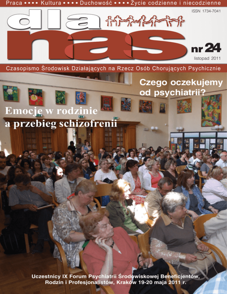 Praca Kultura Duchowość Życie codzienne i niecodzienne ISSN 1734-7041 nr 24 listopad 2011 Czasopismo Środowisk Działających na Rzecz Osób Chorujących Psychicznie Czego oczekujemy od psychiatrii? Emocje w rodzinie a przebieg schizofrenii Uczestnicy IX Forum Psychiatrii Środowiskowej Beneficjentów, Rodzin i Profesjonalistów, Kraków 19-20 maja 2011 r. Słowem wstępu Drodzy Czytelnicy! J uż od dziewięciu lat, zazwyczaj w maju, w Krakowie, beneficjenci, rodziny i profesjonaliści spotykają się na corocznym Forum. Wykłady przedstawicieli tych trzech grup, kończące się dyskusją z udziałem wszystkich słuchaczy, są świadectwem ewolucji psychiatrii. Zmiany są bardzo istotne. Na czym polegają? Głos osób chorujących psychicznie, który był przez lata zagłuszany przez mity i stereotypy, traktujące nas jako osoby trwale niepoczytalne i niewiarygodne jest coraz mocniejszy, a nasze organizacje pozarządowe coraz silniejsze. Nasze Czasopismo próbuje towarzyszyć i zapisywać te wydarzenia i dlatego opracowaliśmy numer prawie w całości poświęcony Forum. Istotne tematy: współpraca z rodziną, rola pracy, leczenie pomimo braku zgody, Narodowy Program Ochrony Zdrowia Psychicznego. F orum rozpoczynał wykład Anny Liberadzkiej „Czego oczekujemy od psychiatrii?”. To głos beneficjentki wyrażający nasze wspólne pragnienia i oczekiwania. W relacjach pacjent – terapeuta jesteśmy po prostu ludźmi, terapeuci nie powinni obawiać się okazywania emocji, pacjent potrzebuje normalnego, dobrego kontaktu, otwartości, pobudzania nadziei i towarzyszenia w procesie zdrowienia. Anna zarysowała fundament, na którym można budować udaną terapię często w swoich cytatach odwołując się do Antoniego Kępińskiego. J eszcze w przeddzień Forum odbyło się w Zielonym Dole „spotkanie z mistrzem”, czyli seminarium z Julianem Leffem. Mówił o „Współpracy z rodziną w praktyce środowiskowej”, popartej wieloletnimi badaniami. Ten wybitny angielski psychiatra poświęcił się pracy z rodzinami. Wysoki, szczupły starszy pan, o szlachetnych rysach twarzy, z mądrym, wnikliwym spojrzeniem, spokojny i zdecydowany, otwarty na ludzi, wzbudzał zaufanie. Barbara z redakcji „Dla Nas” odtworzyła wiernie jego seminarium i wykład na Forum. Julian Leff uczył „wyrażać uczucia”, uczył rozmowy, poprawy komunikacji, sztuki słuchania i... łagodności, ciepła. Jak bardzo tego potrzebujemy w rodzinach...Dołączyliśmy się z naszymi doświadczeniami z „Seminarium dla rodzin”. Pierwszy raz beneficjenci brali udział jako prelegenci w seminarium dla rodzin z regionu podkarpackiego. To obserwacje „z drugiej strony lustra”. Próbowałam na tej sesji opowiedzieć o spotkaniach, podczas których osoby chorujące opowiadają o swoich zmaganiach, a rodzice słuchają, przeżywają i dołączają własne historie. Słuchając innych, można lepiej zrozumieć swoje dziecko, z którym czasem trudno jest nawiązać kontakt. O tym jak olbrzymią rolę odgrywa praca piszemy prawie w każdym kolejnym wydaniu DLA NAS. Tym razem wykłady o pracy prawie w całości omawia w ostatnim numerze nasze zaprzyjaźnione czasopismo RODZINY. Korzystając z okazji nasza Redakcja składa gratulacje z powodu powstania Ogólnopolskiej Federacji Rodzin Osób Chorujących Psychicznie „Rodziny”. Liczymy na bliskie i codzienne współdziałanie z Przewodniczącą Federacji Agnieszką Lewonowską-Banach. Połączyły się Stowarzyszenia Rodzin, które prawdziwie z nami od lat współdziałają, współorganizują Forum, w odróżnieniu od nieobecnej i pozorującej współpracę POL FAMILII. Uzupełniamy sesję opisem programu „Trener pracy” w Małopolsce. O takiej formie pomocy pisze Karolina Probosz, podając budzące nadzieję wyniki badań statystycznych – prawie połowa osób uzyskała zatrudnienie. Trochę brakowało mi wypowiedzi uczestników Programu. Ciekawe, jakie były ich dalsze losy, czy udało się utrzymać pracę? A co z tymi, którym się nie udało? I dlaczego program został przerwany, dlaczego nie ma kontynuacji? Bo pracować można nawet na terenie szpitala psychiatrycznego, jak w sklepie „Ciuszek” w szpitalu im. Babińskiego. Tak powinno być w całej Polsce. S woisty komentarz do zagadnienia pracy pisze Konrad Wroński, informatyk i członek naszego Współwydawcy – Stowarzyszenia „Otwórzcie Drzwi”. Słowa nieco gorzkie, z lekka ironiczne, wyrażające wątpliwości – „Udaję zdrowego, czy udaję chorego?” Niepokój Konrada wzbudził test osobowości, a takie testy chodzą czasem zawiłymi psychologicznymi ścieżkami. Jak postrzegają mnie ludzie? Jaka jest prawda? Jedni mówią, że pracuję, więc jestem zdrowy. Korzystam z renty – „naciągam”, udaję chorego. Czy widzą mnie prawdziwie? W pracy może zdarzyć się kryzys... Potrzebuję pomocy, nie udaję... To wołanie o prawdę wpisuje się w fundamentalne tematy Forum. „L eczenie bez zgody”, wykład Przewodniczącej Mazowieckiej Filii Sekcji Psychiatrii Środowiskowej i Rehabilitacji, Marii Załuskiej, wywołał wiele emocji. Aż dwa komentarze beneficjentów na ten temat. Czujemy się trochę nieswojo... „Na nie - swojej granicy”, jak pisze Mikołaj Golenia. A Barbara podkreśla wymiar etyczny i moralny, wielką wartość, jaką jest życie ludzkie, które trzeba chronić – czasem wtedy, kiedy człowiek zagraża sam sobie. Ten temat będzie z pewnością jeszcze powracał. J acek Wciórka zastanawiał się nad realizacją Narodowego Programu Ochrony Zdrowia Psychicznego: „Rozporządzenie i co dalej?” Musimy – ciągle dopominając się o nasze 5% w budżecie przeznaczonym na zdrowie – nieustająco dyskutować o praktycznych działaniach prowadzących do wdrożenia tego programu, I jeszcze wielogłos o „Akademii Rodzinnej” w Szczecinie, która pokazuje, jak można pomagać stwarzając bezinteresownie poradnię i ośrodek wsparcia. To reforma psychiatrii realiz