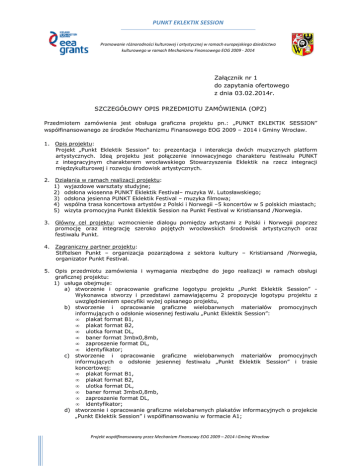 PUNKT EKLEKTIK SESSION Promowanie różnorodności kulturowej i artystycznej w ramach europejskiego dziedzictwa kulturowego w ramach Mechanizmu Finansowego EOG 2009 - 2014 Załącznik nr 1 do zapytania ofertowego z dnia 03.02.2014r. SZCZEGÓŁOWY OPIS PRZEDMIOTU ZAMÓWIENIA (OPZ) Przedmiotem zamówienia jest obsługa graficzna projektu pn.: „PUNKT EKLEKTIK SESSION” współfinansowanego ze środków Mechanizmu Finansowego EOG 2009 – 2014 i Gminy Wrocław. 1. Opis projektu: Projekt „Punkt Eklektik Session” to: prezentacja i interakcja dwóch muzycznych platform artystycznych. Ideą projektu jest połączenie innowacyjnego charakteru festiwalu PUNKT z integracyjnym charakterem wrocławskiego Stowarzyszenia Eklektik na rzecz integracji międzykulturowej i rozwoju środowisk artystycznych. 2. Działania w ramach realizacji projektu: 1) wyjazdowe warsztaty studyjne; 2) odsłona wiosenna PUNKT Eklektik Festival– muzyka W. Lutosławskiego; 3) odsłona jesienna PUNKT Eklektik Festival – muzyka filmowa; 4) wspólna trasa koncertowa artystów z Polski i Norwegii –5 koncertów w 5 polskich miastach; 5) wizyta promocyjna Punkt Eklektik Session na Punkt Festival w Kristiansand /Norwegia. 3. Główny cel projektu: wzmocnienie dialogu pomiędzy artystami z Polski i Norwegii poprzez promocję oraz integrację szeroko pojętych wrocławskich środowisk artystycznych oraz festiwalu Punkt. 4. Zagraniczny partner projektu: Stiftelsen Punkt – organizacja pozarządowa z sektora kultury – Kristiansand /Norwegia, organizator Punkt Festival. 5. Opis przedmiotu zamówienia i wymagania niezbędne do jego realizacji w ramach obsługi graficznej projektu: 1) usługa obejmuje: a) stworzenie i opracowanie graficzne logotypu projektu „Punkt Eklektik Session” Wykonawca stworzy i przedstawi zamawiającemu 2 propozycje logotypu projektu z uwzględnieniem specyfiki wyżej opisanego projektu, b) stworzenie i opracowanie graficzne wielobarwnych materiałów promocyjnych informujących o odsłonie wiosennej festiwalu „Punkt Eklektik Session”: • plakat format B1, • plakat format B2, • ulotka format DL, • baner format 3mbx0,8mb, • zaproszenie format DL, • identyfikator; c) stworzenie i opracowanie graficzne wielobarwnych materiałów promocyjnych informujących o odsłonie jesiennej festiwalu „Punkt Eklektik Session” i trasie koncertowej: • plakat format B1, • plakat format B2, • ulotka format DL, • baner format 3mbx0,8mb, • zaproszenie format DL, • identyfikator; d) stworzenie i opracowanie graficzne wielobarwnych plakatów informacyjnych o projekcie „Punkt Eklektik Session” i współfinansowaniu w formacie A1; Projekt współfinansowany przez Mechanizm Finansowy EOG 2009 – 2014 i Gminę Wrocław PUNKT EKLEKTIK SESSION Promowanie różnorodności kulturowej i artystycznej w ramach europejskiego dziedzictwa kulturowego w ramach Mechanizmu Finansowego EOG 2009 - 2014 e) stworzenie i opracowanie graficzne strony internetowej projektu „Punkt Eklektik Session” oraz współpraca z wskazaną przez Zamawiającego agencją PR w zakresie produkcji strony internetowej, f) stworzenie i opracowanie graficzne banerów na strony internetowe i media społecznościowe, g) stworzenie i opracowanie wzoru papieru firmowego projektu „Punkt Eklektik Session”, • Wykonawca przygotuje opracowanie graficzne papieru firmowego w programie Word, w wersji kolorowej i monochromatycznej, h) W odniesieniu do wszystkich w/w materiałów przeznaczonych do druku, przygotowanie materiałów do druku (proces DTP); 2) wymagania i doświadczenie: a) posiadanie doświadczenia w zakresie projektowania graficznego w zakresie opisanym w ust 1 niniejszego OPZ - wymaganie uważa się za spełnione, w przypadku gdy wykonawca przedłoży oświadczenie, z którego treści wynikać będzie, że posiada co najmniej 4 letnie doświadczenie w zakresie projektowania graficznego, 3) Wykonawca przedstawi Zamawiającemu materiały graficzne do akceptacji w następujących terminach: a) stworzenie i opracowanie graficzne logotypu projektu „Punkt Eklektik Session” – nie później jak na 2 dni od daty podpisania umowy, b) po zaakceptowaniu przez Zamawiającego ostatecznej wersji logotypu, wykonawca stworzy i opracuje: • w terminie maksymalnie 3 dni, opracowanie graficzne wielobarwnych materiałów promocyjnych informujących o odsłonie wiosennej festiwalu „Punkt Eklektik Session”; • w terminie maksymalnie 6 dni, przedstawi opracowanie graficzne strony internetowej projektu „Punkt Eklektik Session”, opracowanie graficzne banerów na stronę internetową i media społecznościowe oraz opracowanie graficzne papieru firmowego; • w terminie maksymalnie 7 dni, opracowanie graficzne wielobarwnych plakatów informacyjnych o projekcie „Punkt Eklektik Session” i współfinansowaniu w formacie A1; c) stworzenie i opracowanie graficzne wielobarwnych materiałów promocyjnych informujących o odsłonie jesiennej festiwalu „Punkt Eklektik Session” i trasie koncertowej – do dnia 15.09.2014r. 6. Wykonawca dokona wyceny w przeliczeniu na całą wartość usługi 1) System płatności: a) 70% ceny oferty po dostarczeniu Zamawiającemu: • opracowania graficznego logotypu projektu „Punkt Eklektik Session”, • opracowania graficznego wielobarwnych materiałów promocyjnych informujących o odsłonie wiosennej festiwalu „Punkt Eklektik Session”, • opracowania graficznego wielobarwnych plakatów informacyjnych o projekcie „Punkt Eklektik Session” i współfinansowaniu w formacie A1, • opracowania graficznego strony internetowej projektu „Punkt Eklektik Session”, • opracowania graficznego banerów na strony internetowe i media społecznościowe, • opracowania graficznego materiałów prasowych, • opracowania graficznego papieru firmowego, b) 30% ceny oferty po dostarczeniu Zamawiającemu: • opracowania graficznego wielobarwnych materiałów promocyjnych informujących o odsłoni