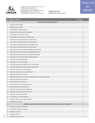 UNIQA Towarzystwo Ubezpieczeñ na ¯ycie S.A. 90-520 £ódŸ, ul. Gdañska 132 tel. 42 63 44 700, fax 42 63 77 430 S¹d Rejonowy dla £odzi - Œródmieœcia w £odzi KRS 0000005751, NIP 554-100-15-22 Kapita³ zak³adowy i wp³acony: 42 774 700 PLN Lp. Tabela Operacji UNIQA TU na Życie S.A. Rodzaj Operacji Załącznik do OWUD Grupa OPERACJE UKŁADU NERWOWEGO 1 Usunięcie części mózgu 1 2 Usunięcie guza mózgu 1 3 Stereotaktyczna ablacja mózgu 1 4 Drenaż okolicy zmiany tkanki mózgowej 2 5 Wszczepienie stymulatora mózgu 2 6 Wszczepienie stymulatora nerwu błędnego 2 7 Endoskopowa wentrykulostomia trzeciej komory 2 8 Wszczepienie zastawki komorowo-otrzewnowej 2 9 Wszczepienie zastawki komorowo-przedsionkowej 2 10 Wszczepienie zastawki lędźwiowo-otrzewnowej 2 11 Operacyjne leczenie krwawienia podpajęczynówkowego 2 12 Operacyjne leczenie krwawienia nadtwardówkowego 2 13 Operacyjne leczenie krwawienia podtwardówkowego 2 14 Operacyjne leczenie krwawienia śródmózgowego 2 15 Przecięcie ciała modzelowatego 1 16 Przeszczep nerwu czaszkowego 1 17 Wewnątrzczaszkowe przecięcie nerwu czaszkowego 1 18 Zewnątrzczaszkowe usunięcie nerwu czaszkowego 2 19 Usunięcie zmiany nerwu czaszkowego 1 20 Operacja naprawcza nerwu czaszkowego 1 21 Biopsja stereotaktyczna mózgu 3 22 Wewnątrzczaszkowa stereotaktyczna dekompresja nerwu czaszkowego 1 23 Usunięcie zmiany opony mózgu 1 24 Rekonstrukcja opony twardej 1 25 Drenaż przestrzeni zewnątrzoponowej 2 26 Drenaż przestrzeni podoponowej 2 27 Częściowe usunięcie rdzenia kręgowego 1 28 Operacja korzenia nerwu rdzeniowego 1 29 Usunięcie nerwu obwodowego 3 30 Zniszczenie nerwu obwodowego 3 31 Usunięcie zmiany nerwu obwodowego 3 32 Sympatektomia szyjna 2 OPR-TB2 OPERACJE UKŁADU ENDOKRYNOLOGICZNEGO ORAZ GRUCZOŁU SUTKOWEGO 33 Usunięcie przysadki mózgowej 1 34 Zniszczenie przysadki mózgowej 1 35 Operacja szyszynki 1 36 Usunięcie tarczycy 1 37 Usunięcie części tarczycy 1 1 Lp. Rodzaj Operacji Grupa 38 Usunięcie tarczycy ektopowej 1 39 Usunięcie przytarczyc 1 40 Usunięcie grasicy 1 41 Usunięcie nadnercza 1 42 Operacja nadnercza ektopowego 1 43 Usunięcie sutka 1 44 Rekonstrukcja sutka 1 45 Nacięcie sutka 2 46 Operacja brodawki sutka 2 OPERACJE OKA 2 47 Wyłuszczenie gałki ocznej 1 48 Wypatroszenie oczodołu 1 49 Usunięcie zmiany oczodołu 1 50 Protezowanie gałki ocznej 3 51 Rewizja protezy gałki ocznej 3 52 Plastyka oczodołu po urazie albo procesie chorobowym 2 53 Rewizja oczodołu 3 54 Rozcięcie kąta szpary powiekowej 3 55 Usunięcie zmiany powieki 3 56 Usunięcie nadmiaru powieki 3 57 Rekonstrukcja powieki 3 58 Korekcja deformacji powieki po urazie albo procesie chorobowym 3 59 Korekcja opadania powieki 2 60 Nacięcie powieki 3 61 Ochronne zeszycie szpary powiekowej 3 62 Operacja gruczołu łzowego 3 63 Zespolenie dróg łzowych z jamą nosową 3 64 Operacja kanału łzowego 3 65 Złożona operacja na mięśniach okoruchowych 3 66 Repozycja mięśnia okoruchowego 2 67 Usunięcie mięśnia okoruchowego 2 68 Częściowe rozdzielenie ścięgna mięśnia okoruchowego 2 69 Usunięcie zmiany spojówki 3 70 Operacja naprawcza spojówki 3 71 Nacięcie spojówki 3 72 Usunięcie zmiany rogówki 3 73 Plastyka rogówki po urazie albo procesie chorobowym 2 74 Operacja naprawcza rogówki 3 75 Nacięcie rogówki 3 76 Usunięcie zmiany twardówki 3 77 Zabieg naprawczy odklejenia siatkówki 3 78 Nacięcie twardówki 3 79 Usunięcie tęczówki 3 80 Nacięcie tęczówki 3 Lp. Rodzaj Operacji Grupa 81 Usunięcie ciała rzęskowego 2 82 Usunięcie soczewki 2 83 Nacięcie torebki soczewki oka 3 84 Wprowadzenie sztucznej soczewki 2 85 Operacja ciała szklistego 2 86 Zniszczenie zmiany siatkówki 3 OPERACJE UCHA 87 Usunięcie ucha zewnętrznego 3 88 Usunięcie zmiany ucha zewnętrznego 3 89 Plastyka ucha zewnętrznego po urazie albo procesie chorobowym 3 90 Drenaż ucha zewnętrznego 3 91 Otwarcie wyrostka sutkowatego 2 92 Operacja naprawcza błony bębenkowej 3 93 Drenaż ucha środkowego 3 94 Rekonstrukcja kosteczek słuchowych 1 95 Usunięcie zmiany ucha środkowego 3 96 Operacja trąbki Eustachiusza 3 97 Operacja ślimaka 3 98 Operacja aparatu przedsionkowego 3 OPERACJE UKŁADU ODDECHOWEGO 99 Usunięcie nosa 1 100 Plastyka nosa po urazie albo procesie chorobowym 2 101 Operacja przegrody nosa 3 102 Operacja małżowiny wewnętrznej nosa 3 103 Operacyjna tamponada krwawienia z wewnętrznego 3 104 Operacja nosa zewnętrznego nosa 3 105 Operacyjne otwarcie zatoki szczękowej z dostępu podwargowego 3 106 Operacja zatoki czołowej 3 107 Operacja zatoki klinowej 3 108 Operacja zatoki nosa 3 109 Usunięcie gardła 1 110 Operacja naprawcza gardła 2 111 Endoskopowa operacja gardła (z wyłączeniem usunięcia ciała obcego) 2 112 Usunięcie krtani 1 113 Usunięcie zmiany krtani metodą otwartą 1 114 Rekonstrukcja krtani 1 115 Endoskopowa operacja krtani 3 116 Usunięcie części tchawicy 1 117 Plastyka tchawicy 1 118 Protezowanie tchawicy metodą otwartą 1 119 Tracheostomia (z wyłączeniem tracheostomii czasowej) 3 120 Otwarta operacja ostrogi tchawicy 2 121 Usunięcie części oskrzela 2 122 Endoskopowa operacja dolnego odcinka układu oddechowego (z wyłączeniem usunięcia ciała obcego) 2 3 Lp. Rodzaj Operacji Grupa 123 Przeszczep płuca 1 124 Usunięcie płuca 1 125 Usunięcie części płuca 2 126 Usunięcie zmiany tkanki płucnej metodą otwartą 1 127 Operacja śródpiersia metodą otwartą (z wyłączeniem biopsji diagnostycznych) 2 128 Endoskopowa operacja śródpiersia 2 OPERACJE JAMY USTNEJ 129 Usunięcie części wargi 3 130 Usunięcie zmiany wargi 3 131 Korekcja deformacji wargi po urazie albo procesie chorobowym 3 132 Usunięcie języka 2 133 Usunięcie zmiany języka 3 134 Nacięcie języka 3 135 Usunięcie zmiany podniebienia 3 136 Korekcja deformacji podniebienia 2 137 Usunięcie migdałków 3 138 Usunięcie zmiany z innej struktury jamy ustnej (z wyłączeniem zębów) 3 139 Rekonstrukcja innej struktury jamy ustnej (z wyłą