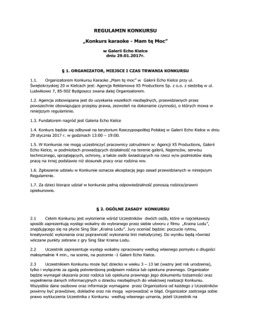 REGULAMIN KONKURSU „Konkurs karaoke - Mam tę Moc” w Galerii Echo Kielce dniu 29.01.2017r. § 1. ORGANIZATOR, MIEJSCE I CZAS TRWANIA KONKURSU 1.1. Organizatorem Konkursu Karaoke „Mam tę moc” w Galerii Echo Kielce przy ul. Świętokrzyskiej 20 w Kielcach jest: Agencja Reklamowa X5 Productions Sp. z o.o. z siedzibą w ul. Ludwikowo 7, 85-502 Bydgoszcz zwana dalej Organizatorem. 1.2. Agencja zobowiązana jest do uzyskania wszelkich niezbędnych, przewidzianych przez powszechnie obowiązujące przepisy prawa, zezwoleń na dokonanie czynności, o których mowa w niniejszym regulaminie. 1.3. Fundatorem nagród jest Galeria Echo Kielce 1.4. Konkurs będzie się odbywał na terytorium Rzeczypospolitej Polskiej w Galerii Echo Kielce w dniu 29 stycznia 2017 r. w godzinach 13:00 – 19:00. 1.5. W Konkursie nie mogą uczestniczyć pracownicy zatrudnieni w: Agencji X5 Productions, Galerii Echo Kielce, w podmiotach prowadzących działalność na terenie galerii, Najemców, serwisu technicznego, sprzątających, ochrony, a także osób świadczących na rzecz w/w podmiotów stałą pracę na innej podstawie niż stosunek pracy oraz rodzina ww. 1.6. Zgłoszenie udziału w Konkursie oznacza akceptację jego zasad przewidzianych w niniejszym Regulaminie. 1.7. Za dzieci biorące udział w konkursie pełną odpowiedzialność ponoszą rodzice/prawni opiekunowie. § 2. OGÓLNE ZASADY KONKURSU 2.1 Celem Konkursu jest wyłonienie wśród Uczestników dwóch osób, które w najciekawszy sposób zaprezentują występ wokalny do wybranego przez siebie utworu z filmu „Kraina Lodu”, znajdującego się na płycie Sing Star „Kraina Lodu”. Jury oceniać będzie: poczucie rytmu, kreatywność wykonania oraz poprawność wykonania linii melodycznej. Do wyniku będą również wliczane punkty zebrane z gry Sing Star Kraina Lodu. 2.2 Uczestnik zaprezentuje występ wokalny opracowany według własnego pomysłu o długości maksymalnie 4 min., na scenie, na poziomie -1 Galerii Echo Kielce. 2.3 Uczestnikiem Konkursu może być dziecko w wieku 3 – 13 lat (ważny jest rok urodzenia), tylko i wyłącznie za zgodą potwierdzoną podpisem rodzica lub opiekuna prawnego. Organizator będzie wymagał okazania przez rodzica lub opiekuna prawnego jego dokumentu tożsamości oraz wypełnienia danych informacyjnych o dziecku niezbędnych do właściwej realizacji Konkursu. Wszystkie dane osobowe oraz informacje wymagane przez Organizatora od każdego z Uczestników powinny być prawdziwe, dokładne oraz nie mogą wprowadzać w błąd. Organizator zastrzega sobie prawo wykluczenia Uczestnika z Konkursu według własnego uznania, jeżeli Uczestnik na jakimkolwiek etapie Konkursu dostarczy dane lub informacje nieprawdziwe, niedokładne lub wprowadzające w błąd. 2.4 Selekcja Uczestników Konkursu przebiega w następujących sposób: zgłoszenia mailowe oraz zgłoszenia osobiste. a) Zgłoszenia mailowe należy przesyłać od 16 do 25 stycznia 2017 roku włącznie mailem na adres: [email protected] – w temacie należy podać tytuł: Konkurs Karaoke Kraina Lodu Echo Kielce. W zgłoszeniu mailowym należy podać: - imię i nazwisko oraz wiek Uczestnika - numer telefonu kontaktowego - nazwę utworu (do wyboru z 10 utworów), który Uczestnika ma zamiar zaprezentować wokalnie. Elsa: Mam tę Moc Obsada filmu: Serca lód Anna: Ulepimy dziś bałwana? Anna & Elsa: Pierwszy raz jak sięga pamięć Anna & Hans: Miłość stanęła w drzwiach Elsa: Mam tę moc Kristoff: Człowiek zwierzęciu jest wilkiem Olaf: Lód w lecie Anna & Elsa: Pierwszy raz jak sięga pamięć (Repryza) Trolle: Nietentego I Etap Konkursu zakończy się wyłonieniem przez Organizatora maksymalnie 60 Uczestników Finału, którzy zostaną zaproszeni na prezentację Konkursową do Echo Kielce w dniu 29 stycznia 2017r. O zakwalifikowaniu się do Finału Konkursu decyduję kolejność zgłoszeń Uczestników. Informacja o zakwalifikowaniu się oraz szczegółów Konkursu zostanie przesłana mailem do 26 stycznia 2017 roku. Warunkiem udziału w Konkursie jest przesłanie przez Uczestnika Finału maila z akceptacją warunków otrzymanym drogą mailową od Organizatora oraz zgłoszenie się we wskazanych dnia na drodze mailowej do Obsługi Konkursu, która będzie znajdować się w pobliżu sceny (poziom -1) na pół godziny (30 minut) przed Występem. b) Zgłoszenia osobiste Organizator dopuszcza możliwość osobistego zgłoszenia Uczestników w dniu Finału Konkursu, w przypadku jeśli Uczestnicy Finału nie potwierdzą swojego udziału zgodnie z regulaminem. O zakwalifikowaniu się do Finału Konkursu decyduję kolejność zgłoszeń Uczestników do Punktu Obsługi Konkursu w dniu imprezy, tj. 29 stycznie od godziny 13:00. Organizator może dokonać zmian odnośnie godzin oraz czasu trwania rejestracji zgłoszeń. 2.5. W dniu Imprezy, tj. 29 stycznia prezentacja występów Uczestników Konkursu odbędzie się wg poniższego harmonogramu: I Tura 13:20-14:00 II Tura 14:20-15:00 III Tura 15:20-16:00 IV Tura 16:20-17:00 V Tura 17:20-18:00 VI Tura 18:10-18:45 2.6. W każdej turze wziąć może udział maksymalnie 10 Uczestników. 2.7. O możliwości wystąpienia w każdej turze konkursu decydować będzie kolejność zgłoszenia. Pierwszeństwo mają Uczestnicy zapisany na drodze mailowej. Kolejność Występów Uczestników w ramach jednej tury ustala Organizator. 2.8. Zwycięzców konkursu wyłoni Jury w składzie: Przedstawiciel Organizatora (Event Manager) oraz Animator Prowadzący wg zasad z paragrafu 2.1. 2.9. Jeden Uczestnik ma prawo tylko raz wziąć udział w konkursie. 2.10. Każdy z Rodziców/Prawnych opiekunów Uczestników Konkursu wyraża zgodę na opublikowanie imienia i nazwiska oraz zdjęcia zawierającego wizerunek swojego dziecka/podopiecznego na stronie internetowej www, na profilu Galerii Echo Kielce, na facebooku oraz we wszelkich relacjach publikowanych po evencie. § 3. NAGRODY 3.1. Nagrodami głównymi w konkursie są: 3x zestaw nagród