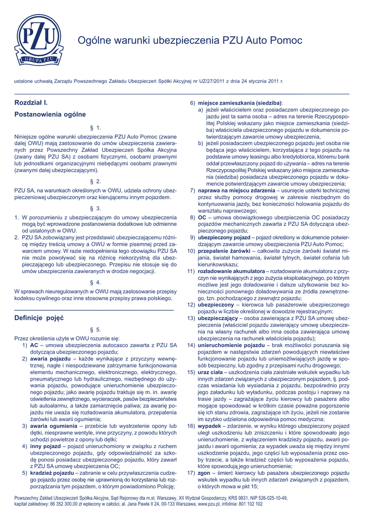 Ogólne warunki ubezpieczenia PZU Auto Pomoc ustalone uchwałą Zarządu Powszechnego Zakładu Ubezpieczeń Spółki Akcyjnej nr UZ/27/2011 z dnia 24 stycznia 2011 r. Rozdział I. Postanowienia ogólne § 1. Niniejsze ogólne warunki ubezpieczenia PZU Auto Pomoc (zwane dalej OWU) mają zastosowanie do umów ubezpieczenia zawieranych przez Powszechny Zakład Ubezpieczeń Spółka Akcyjna (zwany dalej PZU SA) z osobami fizycznymi, osobami prawnymi lub jednostkami organizacyjnymi niebędącymi osobami prawnymi (zwanymi dalej ubezpieczającymi). § 2. PZU SA, na warunkach określonych w OWU, udziela ochrony ubezpieczeniowej ubezpieczonym oraz kierującemu innym pojazdem. § 3. 1. W porozumieniu z ubezpieczającym do umowy ubezpieczenia mogą być wprowadzone postanowienia dodatkowe lub odmienne od ustalonych w OWU. 2. PZU SA zobowiązany jest przedstawić ubezpieczającemu różnicę między treścią umowy a OWU w formie pisemnej przed zawarciem umowy. W razie niedopełnienia tego obowiązku PZU SA nie może powoływać się na różnicę niekorzystną dla ubezpieczającego lub ubezpieczonego. Przepisu nie stosuje się do umów ubezpieczenia zawieranych w drodze negocjacji. § 4. W sprawach nieuregulowanych w OWU mają zastosowanie przepisy kodeksu cywilnego oraz inne stosowne przepisy prawa polskiego. ____________________________________________________ Definicje pojęć § 5. Przez określenia użyte w OWU rozumie się: 1) AC – umowa ubezpieczenia autocasco zawarta z PZU SA dotycząca ubezpieczonego pojazdu; 2) awaria pojazdu – każde wynikające z przyczyny wewnętrznej, nagłe i niespodziewane zatrzymanie funkcjonowania elementu mechanicznego, elektronicznego, elektrycznego, pneumatycznego lub hydraulicznego, niezbędnego do używania pojazdu, powodujące unieruchomienie ubezpieczonego pojazdu; jako awarię pojazdu traktuje się m. in. awarię oświetlenia zewnętrznego, wycieraczek, pasów bezpieczeństwa lub autoalarmu, a także zamarznięcie paliwa; za awarię pojazdu nie uważa się rozładowania akumulatora, przepalenia żarówki lub awarii ogumienia; 3) awaria ogumienia – przebicie lub wystrzelenie opony lub dętki, niesprawne wentyle, inne przyczyny, z powodu których uchodzi powietrze z opony lub dętki; 4) inny pojazd – pojazd unieruchomiony w związku z ruchem ubezpieczonego pojazdu, gdy odpowiedzialność za szkodę ponosi posiadacz ubezpieczonego pojazdu, który zawarł z PZU SA umowę ubezpieczenia OC; 5) kradzież pojazdu – zabranie w celu przywłaszczenia cudzego pojazdu przez osobę nie uprawnioną do korzystania lub rozporządzania tym pojazdem, o którym powiadomiono Policję; 6) miejsce zamieszkania (siedziba): a) jeżeli właścicielem oraz posiadaczem ubezpieczonego pojazdu jest ta sama osoba – adres na terenie Rzeczypospolitej Polskiej wskazany jako miejsce zamieszkania (siedziba) właściciela ubezpieczonego pojazdu w dokumencie potwierdzającym zawarcie umowy ubezpieczenia, b) jeżeli posiadaczem ubezpieczonego pojazdu jest osoba nie będąca jego właścicielem, korzystająca z tego pojazdu na podstawie umowy leasingu albo kredytobiorca, któremu bank oddał przewłaszczony pojazd do używania – adres na terenie Rzeczypospolitej Polskiej wskazany jako miejsce zamieszkania (siedziba) posiadacza ubezpieczonego pojazdu w dokumencie potwierdzającym zawarcie umowy ubezpieczenia; 7) naprawa na miejscu zdarzenia – usunięcie usterki technicznej przez służby pomocy drogowej w zakresie niezbędnym do kontynuowania jazdy, bez konieczności holowania pojazdu do warsztatu naprawczego; 8) OC – umowa obowiązkowego ubezpieczenia OC posiadaczy pojazdów mechanicznych zawarta z PZU SA dotycząca ubezpieczonego pojazdu; 9) ubezpieczony pojazd – pojazd określony w dokumencie potwierdzającym zawarcie umowy ubezpieczenia PZU Auto Pomoc; 10) przepalenie żarówki – całkowite zużycie żarówki świateł mijania, świateł hamowania, świateł tylnych, świateł cofania lub kierunkowskazu; 11) rozładowanie akumulatora – rozładowanie akumulatora z przyczyn nie wynikających z jego zużycia eksploatacyjnego, po którym możliwe jest jego doładowanie i dalsze użytkowanie bez konieczności ponownego doładowywania ze źródła zewnętrznego, tzn. pochodzącego z zewnątrz pojazdu; 12) ubezpieczony – kierowca lub pasażerowie ubezpieczonego pojazdu w liczbie określonej w dowodzie rejestracyjnym; 13) ubezpieczający – osoba zawierająca z PZU SA umowę ubezpieczenia (właściciel pojazdu zawierający umowę ubezpieczenia na własny rachunek albo inna osoba zawierająca umowę ubezpieczenia na rachunek właściciela pojazdu); 14) unieruchomienie pojazdu – brak możliwości poruszania się pojazdem w następstwie zdarzeń powodujących niewłaściwe funkcjonowanie pojazdu lub uniemożliwiających jazdę w sposób bezpieczny, lub zgodny z przepisami ruchu drogowego; 15) uraz ciała – uszkodzenia ciała zaistniałe wskutek wypadku lub innych zdarzeń związanych z ubezpieczonym pojazdem, tj. podczas wsiadania lub wysiadania z pojazdu, bezpośrednio przy jego załadunku lub wyładunku, podczas postoju i naprawy na trasie jazdy – zagrażające życiu kierowcy lub pasażera albo mogące spowodować w krótkim czasie poważne pogorszenie się ich stanu zdrowia, zagrażające ich życiu, jeżeli nie zostanie im szybko udzielona odpowiednia pomoc medyczna; 16) wypadek – zdarzenie, w wyniku którego ubezpieczony pojazd uległ uszkodzeniu lub zniszczeniu i które spowodowało jego unieruchomienie, z wyłączeniem kradzieży pojazdu, awarii pojazdu i awarii ogumienia; za wypadek uważa się między innymi uszkodzenie pojazdu, jego części lub wyposażenia przez osoby trzecie, a także kradzież części lub wyposażenia pojazdu, które spowodują jego unieruchomienie; 17) zgon – śmierć kierowcy lub pasażera ubezpieczonego pojazdu wskutek wypadku lub innych zdarzeń związanych z pojazdem, o których mowa w pkt 15; Powszechny Zakład Ubezpieczeń Spó
