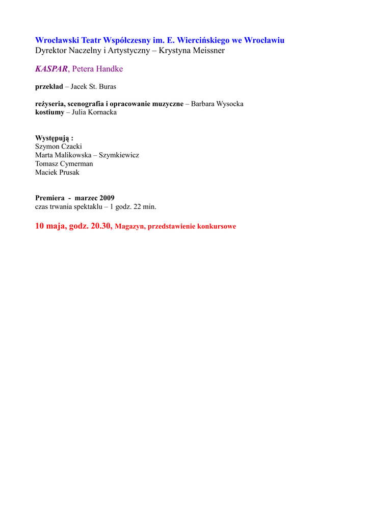 Wrocławski Teatr Współczesny im. E. Wiercińskiego we Wrocławiu Dyrektor Naczelny i Artystyczny – Krystyna Meissner KASPAR, Petera Handke przekład – Jacek St. Buras reżyseria, scenografia i opracowanie muzyczne – Barbara Wysocka kostiumy – Julia Kornacka Występują : Szymon Czacki Marta Malikowska – Szymkiewicz Tomasz Cymerman Maciek Prusak Premiera - marzec 2009 czas trwania spektaklu – 1 godz. 22 min. 10 maja, godz. 20.30, Magazyn, przedstawienie konkursowe Teatr Rozmaitości w Warszawie Dyrektor Naczelny i Artystyczny – Grzegorz Jarzyna MIĘDZY NAMI DOBRZE JEST, Doroty Masłowskiej reżyseria – Grzegorz Jarzyna scenografia – Magdalena Maciejewska opracowanie muzyczne – Piotr Domiński, Grzegorz Jarzyna kostiumy – Magdalena Musiał reżyseria światła - Jacqueline Sobiszewski wideo: Cukierek&Pani K. Występują : Osowiała Staruszka na Wózku Inwalidzkim – Danuta Szaflarska Edyta – Roma Gąsiorowska Bożena – Maria Maj Halina – Magdalena Kuta Prezenterka – Agnieszka Podsiadlik Mała Metalowa Dziewczynka – Aleksandra Popławska Monika – Katarzyna Warnke Aktor – Rafał Maćkowiak Mężczyzna – Adam Woronowicz (głos z radia) – Lech Łotocki Premiera - 26 marzec 2009, Berlin Premiera polska 5 kwietnia 2009 TR Warszawa czas trwania spektaklu – 1h 40 min ( bez przerwy) 8 maja, godz. 19.00 Duża Scena, przedstawienie konkursowe Teatr im. Stefana Jaracza w Łodzi Dyrektor Naczelny – Wojciech Nowicki Dyrektor Artystyczny – Waldemar Zawodziński WEDŁUG AGAFII, na podstawie „Ożenku” Mikołaja Gogola adaptacja, reżyseria i scenografia – Agata Duda – Gracz muzyka – Jakub Ostaszewski reżyseria światła – Katarzyna Łuszczyk, Dariusz Adamski ruch sceniczny – Kamila Jankowska i Witold Jurewicz asystent reżysera – Katarzyna Brewińska asystent scenografa – Grzegorz Nowak Występują : Agafia – Milena Lisiecka Podkolesin – Sambor Czarnota Poradnica – Marek Kałużyński Anuczkin – Robert Latusek Jajeczanica – Tomasz Schuchardt Koczkariow – Michał Staszczak Zewakin – Mariusz Witkowski Statystka – Katarzyna Brewińska Premiera – grudzień 2009 czas trwania spektaklu – 120 min. 14 maja, godz. 18.00, Duża Scena, przedstawienie konkursowe Państwowy Teatr Wybrzeże w Gdańsku Dyrektor Naczelny i Artystyczny - Adam Orzechowski ZWODNICA , Thomasa Middleton'a, Williama Rowley'a przekład– Krystyna Berwińska reżyseria – Kuba Kowalski scenografia – Katarzyna Stochalska opracowanie tekstu – Jakub Roszkowski, Kuba Kowalski reżyseria światła – Damian Pawella ruch sceniczny – Filip Szatarski dramaturg – Jakub Roszkowski Występują: Vermandero – ojciec Beatrice – Krzysztof Matuszewski Alonzo de Piracquo – narzeczony Beatrice – Piotr Chys Alsemero – szlachcic, przyszły mąż Beatrice – Marek Tynda De Flores – zaufany Vermandera – Michał Kowalski Beatrice – córka Vermandera – Karolina Piechota Diafanta – jej powiernica – Wanda Skorny Lolio – wariat, alfons, stylista – Krystian Wieczorek Izabela – wariatka, kurwa, stylistka – Marzena Nieczuja-Urbańska Premiera – marzec 2009 czas trwania spektaklu – 90 min. 15 maja, godz. 18.00, Scena Kameralna, przedst. konkursowe Teatr Polski we Wrocławiu Dyrektor Naczelny i Artystyczny – Krzysztof Mieszkowski SMYCZ, Bartosz Porczyk reżyseria – Natalia Korczakowska scenografia – Natalia Korczakowska, Anna Met muzyka i aranżacje – Łukasz Damrych reżyseria światła – Olaf Tryzna Występują : Bartosz Porczyk jako Włamywacz, Pan Maksimum, Klient supermarketu, Januszek, Jasio, Człowiek – małpa, Ksiądz Henryk, Margaret Zespół muzyczny: Łukasz Damrych/Piotr Świętoniowski – instrumenty klawiszowe Tomasz Pierzchniak/Piotr Sypień – kontrabas Łukasz Sobolak/Bartosz Niebielecki – perkusja Piotr Kaluta/Wojciech Orszewski – gitara Olga Kwiatek/Zuzanna Dudzic-Karkulowska – skrzypce Robert Kamalski/Sławomir Dudar – saksofon Premiera – listopad 2006 czas trwania spektaklu – 100 min 15 maja, godz. 20.30, Duża Scena, spektakl poza konkursem Licencjodawca: ZAIKS Wrocław, Teatr Polski we Wrocławiu Teatr Polski we Wrocławiu Dyrektor Naczelny i Artystyczny – Krzysztof Mieszkowski SZAJBA, Małgorzata Sikorska-Miszczuk reżyseria i opracowanie muzyczne – Jan Klata scenografia- Mirek Kaczmarek kostiumy – Mirek Kaczmarek, Małgorzata Matera reżyseria światła – Justyna Łagowska ruch sceniczny – Maćko Prusak Występują : Wiktoria – Kinga Preis Mister Ble – Wojciech Ziemiański 99 Groszy – Marcin Czarnik Zachar – Michał Majnicz Teofil Guma – Mirosław Haniszewski Profesor Bralczyk – Edwin Petrykat Hans – Marian Czerski Charlie – Bartosz Porczyk John – Rafał Kronenberger Dziwka – Anna Ilczuk/Paulina Chapko Polska – Czesława Dąbrowska / Maria Stupak / Regina Bulisz Premiera – maj 2009 czas trwania spektaklu - 90 min 14 maja, godz. 19.00, Magazyn, przedstawienie konkursowe o 21.30 licencjodawcy: autorkę reprezentuje Agencja Dramatu (www.agencjadramatu.pl); prawa autorskie pozostałych twórców reprezentuje Stowarzyszenie Autorów ZaiKS – Warszawa oraz Teatr Polski we Wrocławiu Teatr Stu Sp. z o.o. Prezes – Krzysztof Jasiński ROZMOWY Z DIABŁEM.WIELKIE KAZANIE KSIĘDZA BERNARDA Leszka Kołakowskiego reżyseria – Krzysztof Jasiński scenografia – Jan Polewka muzyka – Jan Kanty Pawluśkiewicz Występują : Jerzy Trela Premiera – luty 2006 czas trwania spektaklu – 65 min 10 maja, godz. 18.00, Scena Kameralna, spektakl poza konkursem Teatr Muzyczny Capitol Dyrektor Naczelny i Artystyczny – Konrad Imiela RZECZE BUDDA CHINASKI teksty Charlesa Bukowskiego scenariusz i reżyseria – Cezary Studniak scenografia i kostiumy – Mateusz Stępniak muzyka – Krzysztof Nowikow, Zbigniew Łowżył Występują: Justyna Szafran – Frances oraz Zbigniew Łowżył,Krzysztof Nowikow,Marcin Ożóg i Cezary Studniak jako męski chór instrumentalno- wokalny premiera 