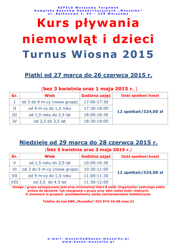 SZPZLO Warszawa Targówek Kompleks Basenów Rehabilitacyjnych „Muszelka” ul. Balkonowa 2, 03 – 329 Warszawa Kurs pływania niemowląt i dzieci Turnus Wiosna 2015 Piątki od 27 marca do 26 czerwca 2015 r. (bez 3 kwietnia oraz 1 maja 2015 r. ) Gr. Wiek Godzina zajęć I od 3 do 9 m-cy (nowa grupa) 17:00-17:30 II od 9 m-cy do 1,5 roku 17:30-18:00 III od 1,5 roku do 2,5 lat 18:00-18:30 IV od 2,5 do 3,5 lat 18:30-19:00 Ilość spotkań/koszt 12 spotkań/324,00 zł Niedziele od 29 marca do 28 czerwca 2015 r. (bez 5 kwietnia oraz 3 maja 2015 r.) Gr. Wiek Godzina zajęć V od 1,5 roku do 2,5 lat 10:00-10:30 VI od 3 do 9 m-cy (nowa grupa) 10:30-11:00 VII od 9 m-cy do 1,5 roku 11:00-11:30 VIII od 3,5 do 4.5 lat 11:30-12:00 Ilość spotkań/koszt 12 spotkań/324,00 zł Uwaga : grupa zawiązywana jest przy minimalnej ilości 8 osób. Organizator zastrzega sobie prawo do łączenia lub rezygnacji z grupy przy zbyt małej ilości chętnych. O zmianach w grupach powiadamiamy osoby zainteresowane telefonicznie. Telefon do kas KBR „Muszelka” 022 674-10-68 wew.21 e-mail: [email protected] www.basen-muszelka.pl SZPZLO Warszawa Targówek Kompleks Basenów Rehabilitacyjnych „Muszelka” ul. Balkonowa 2, 03 – 329 Warszawa Regulamin zajęć pływanie niemowląt i małych dzieci . 1. Korzystanie z zajęć odbywa się na podstawie zapisu na konkretną grupę opłacanego gotówką w kasie pływalni, zgodnie z regulaminem zajęć i regulaminem pływalni. 2. Miejsca na zajęciach nie wolno odstępować osobom trzecim. 3. Zajęcia wykupuje się w cyklu trzy miesięcznym zajęcia odbywają się 1 x w tygodniu. 4. Zajęcia trwają 30 minut, odbywają się w grupach dostosowanych liczebnością do wieku i poziomu zaawansowania ćwiczących, prowadzone są przez wykwalifikowanych instruktorów. 5. Minimalna ilość osób przy której zawiązywana jest grupa wynosi 8. 6. Zajęcia prowadzone są zgodnie z programem nauczania określającym stopniowanie zadań i umiejętności w poszczególnych grupach. 7. O kwalifikacji/przeniesieniu do konkretnej grupy może decydować instruktor prowadzący zajęcia. 8. Wejście na pływalnię jest ograniczone czasowo do 85 minut przebywania w strefie mokrej. Po przekroczeniu tego czasu doliczana jest dopłata 0,30 zł/min. 9. W ramach opłaty prawo wejścia do przebieralni i na płytę pływalni ma jeden ćwiczący z dzieckiem (opiekun i jedno dziecko). Jeżeli potrzebna jest pomoc drugiego opiekuna w przygotowaniu dziecka do zajęć należy zgłosić to w kasie obiektu. Przekroczenie ww. ustaleń oraz nie przestrzeganie przepisów prawa, zasad bezpieczeństwa, naruszenia obowiązujących regulaminów lub interesów organizatora skutkować będzie automatycznym skreśleniem uczestnika zajęć z listy bez prawa zwrotu/rekompensaty za zajęcia do końca trwania turnusu. 10. Drugi opiekun ma prawo wejścia na płytę pływalni oraz korzystania z atrakcji obiektu jedynie w przypadku wykupienia usługi zgodnie z cennikiem. 11. Opiekuna przebywającego na płycie pływalni robiącego zdjęcia i nagrywającego filmy bezwzględnie obowiązuje strój sportowy: klapki, spodenki, koszulka oraz wypełnienie postanowień pkt. 10. 12. Opiekunowie przyjmują do wiadomości i wyrażają zgodę na fotografowanie oraz filmowanie dzieci podczas zajęć. Zdjęcia i materiały filmowe organizator ma prawo wykorzystywać do celów marketingowych. 13. Za bezpieczeństwo dzieci w szatniach oraz na pływalni poza zajęciami odpowiadają opiekunowie. 14. Opiekunowie zobowiązani są do posiadania i używania jednorazowych podkładów higienicznych, które należy rozkładać na matach przewijaków podczas przebierania dzieci. 15. Podczas pobytu na pływalni dzieci muszą mieć założone dobrze dopasowane pieluchy kąpielowe. 16. Uczestników zajęć obowiązuje noszenie czepka kąpielowego. 17. Wycofanie gotówki ma miejsce pod warunkiem, że nastąpi w ciągu 7 dni od dnia zakupu i nie wykorzystano żadnych zajęć*. 18. Rekompensaty związane z niewykorzystanymi wejściami (choroba, wyjazd, brak aklimatyzacji dziecka na zajęciach, itp.) stosowane są na pisemny wniosek opiekuna prawnego, a niewykorzystane zajęcia można odebrać w formie wejść jednorazowych na pływanie rekreacyjne do 2 miesięcy po zakończeniu turnusu, lub w trakcie jego trwania. 19. Wykupienie zajęć jest równoznaczne ze złożeniem pisemnego oświadczenia o stanie zdrowia dziecka oraz opiekuna zezwalającym na czynne uczestnictwo w zajęciach. 20. Organizatorzy zastrzegają sobie prawo do zmiany regulaminu w czasie trwania turnusu. *do zwrotu niezbędny jest paragon fiskalny Kierownik KBR „Muszelka” e-mail: [email protected] www.basen-muszelka.pl