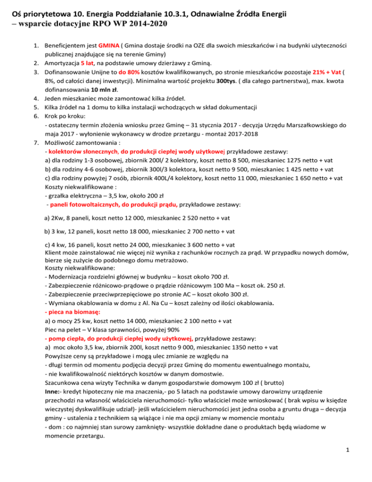 Oś priorytetowa 10. Energia Poddziałanie 10.3.1, Odnawialne Źródła Energii – wsparcie dotacyjne RPO WP 2014-2020 1. Beneficjentem jest GMINA ( Gmina dostaje środki na OZE dla swoich mieszkańców i na budynki użyteczności publicznej znajdujące się na terenie Gminy) 2. Amortyzacja 5 lat, na podstawie umowy dzierżawy z Gminą. 3. Dofinansowanie Unijne to do 80% kosztów kwalifikowanych, po stronie mieszkańców pozostaje 21% + Vat ( 8%, od całości danej inwestycji). Minimalna wartość projektu 300tys. ( dla całego partnerstwa), max. kwota dofinansowania 10 mln zł. 4. Jeden mieszkaniec może zamontować kilka źródeł. 5. Kilka źródeł na 1 domu to kilka instalacji wchodzących w skład dokumentacji 6. Krok po kroku: - ostateczny termin złożenia wniosku przez Gminę – 31 stycznia 2017 - decyzja Urzędu Marszałkowskiego do maja 2017 - wyłonienie wykonawcy w drodze przetargu - montaż 2017-2018 7. Możliwość zamontowania : - kolektorów słonecznych, do produkcji ciepłej wody użytkowej przykładowe zestawy: a) dla rodziny 1-3 osobowej, zbiornik 200l/ 2 kolektory, koszt netto 8 500, mieszkaniec 1275 netto + vat b) dla rodziny 4-6 osobowej, zbiornik 300l/3 kolektora, koszt netto 9 500, mieszkaniec 1 425 netto + vat c) dla rodziny powyżej 7 osób, zbiornik 400L/4 kolektory, koszt netto 11 000, mieszkaniec 1 650 netto + vat Koszty niekwalifikowane : - grzałka elektryczna – 3,5 kw, około 200 zł - paneli fotowoltaicznych, do produkcji prądu, przykładowe zestawy: a) 2Kw, 8 paneli, koszt netto 12 000, mieszkaniec 2 520 netto + vat b) 3 kw, 12 paneli, koszt netto 18 000, mieszkaniec 2 700 netto + vat c) 4 kw, 16 paneli, koszt netto 24 000, mieszkaniec 3 600 netto + vat Klient może zainstalować nie więcej niż wynika z rachunków rocznych za prąd. W przypadku nowych domów, bierze się zużycie do podobnego domu metrażowo. Koszty niekwalifikowane: - Modernizacja rozdzielni głównej w budynku – koszt około 700 zł. - Zabezpieczenie różnicowo-prądowe o prądzie różnicowym 100 Ma – koszt ok. 250 zł. - Zabezpieczenie przeciwprzepięciowe po stronie AC – koszt około 300 zł. - Wymiana okablowania w domu z Al. Na Cu – koszt zależny od ilości okablowania. - pieca na biomasę: a) o mocy 25 kw, koszt netto 14 000, mieszkaniec 2 100 netto + vat Piec na pelet – V klasa sprawności, powyżej 90% - pomp ciepła, do produkcji ciepłej wody użytkowej, przykładowe zestawy: a) moc około 3,5 kw, zbiornik 200l, koszt netto 9 000, mieszkaniec 1350 netto + vat Powyższe ceny są przykładowe i mogą ulec zmianie ze względu na - długi termin od momentu podjęcia decyzji przez Gminę do momentu ewentualnego montażu, - nie kwalifikowalność niektórych kosztów w danym domostwie. Szacunkowa cena wizyty Technika w danym gospodarstwie domowym 100 zł ( brutto) Inne:- kredyt hipoteczny nie ma znaczenia,- po 5 latach na podstawie umowy darowizny urządzenie przechodzi na własność właściciela nieruchomości- tylko właściciel może wnioskować ( brak wpisu w księdze wieczystej dyskwalifikuje udział)- jeśli właścicielem nieruchomości jest jedna osoba a gruntu druga – decyzja gminy - ustalenia z technikiem są wiążące i nie ma opcji zmiany w momencie montażu - dom : co najmniej stan surowy zamknięty- wszystkie dokładne dane o produktach będą wiadome w momencie przetargu. 1