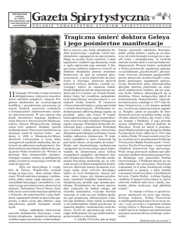 MIESIĘCZNIK czerwiec nr 1/2014 www.spirytyzm.com www.spirytyzm.pl www.rivail.pl Tragiczna śmierć doktora Geleya i jego pośmiertne manifestacje listopada 1918 roku I wojna światowa dobiegła końca, zebrawszy straszliwe żniwo milionów poległych i rannych. Pragnienie duchowości po wyniszczającym konflikcie i poszukiwanie pocieszenia po stracie bliskich, ponownie rozbudziły u Europejczyków zainteresowanie seansami spirytystycznymi. W tym samym roku dzięki mecenatowi bogatego handlowca Jeana Meyera w Paryżu powstał Międzynarodowy Instytut Metapsychiczny, którego celem było naukowe zbadanie zjawisk mediumicznych. Pierwszym dyrektorem tej instytucji został dr Gustave Geley - urodzony w 1868 w Montceau-les-Mines, absolwent Uniwersytetu w Lyon, który zrezygnował z praktyki medycznej, aby poświęcić się całkowicie mediumizmowi. Studiom nad tymi zjawiskami oddawał się z pasją przez blisko trzydzieści lat. Wierzył, że pewnego dnia metapsychika (parapsychologia) zostanie uznana za pełnoprawną naukę i uważał za swoją misję wytrwałe dążenie do tego celu. Było coś niezwykłego w wyglądzie dr. Geleya. Współcześni zwracali uwagę na jego oczy - duże, ponure, błyszczące. Wzrok miał nieco posępny i zachmurzony, jakby osnuty mgłą tajemnicy, zarazem jednak fascynujący i przenikliwy. Czasami na jego poważnej twarzy ukazywał się uśmiech. Dziennikarz Paweł Heuze, który kilka lat po utworzeniu Instytutu spotkał się z Geleyem, aby porozmawiać o jego badaniach, zapamiętał właśnie to niezwykłe spojrzenie, a także czysty głos doktora i jego zdecydowany sposób wyrażania swoich myśli. Geleya najbardziej interesowały zjawiska mediumizmu fizycznego, a konkretnie ektoplazma - tajemnicza substancja wydobywająca się niekiedy z ciała medium. Był to jeszcze czas, kiedy ektoplazma budziła kontrowersje i podziały wśród intelektualistów zajmujących się spirytyzmem. Mając na uwadze liczne oszustwa, a także kapryśność i rzadkość tego fenomenu, wielu w ogóle zaprzeczało jego istnieniu. Z drugiej strony niektórzy naukowcy wierzyli, że zbadanie ektoplazmy pomoże zrozumieć formowanie się zjaw na seansach spirytystycznych, a nawet doprowadzi do przewrotu w fizjologii, ponieważ pozwoli uchwycić twórczy, duchowy czynnik wywierający wpływ na organizm ludzki. Dzięki badaniom nad tak znamienitymi mediami jak Eva Carriere czy Franek Kluski, doktor Geley był świadkiem spektakularnych materializacji otrzymywanych w warunkach ścisłej kontroli. W rozmowie z Heuze francuski badacz z pasją opowiadał o swoich obserwacjach: „Wielokrotnie widziałem postać całkowitą danego organu, na przykład – palca, ręki, twarzy. W wypadkach najdoskonalszych, organ zmaterializowany miał wszystkie własności biologiczne organu żyjącego. Widziałem doskonale sformowane palce z paznokciami. Widziałem ręce z kośćmi i żyłami, głowę, której kości dotykałem pod rodzajem owłosienia, twarze ludzkie całkowicie sformowane. W większości wypadków te zjawy formowały się pod moim okiem, od początku do końca”. Studia nad fenomenologią mediumiczną i pragnienie jej teoretycznego ujęcia doprowadziły do sformowania przez Geleya oryginalnych poglądów, określanych mianem dynamo-psychizmu. Zjawiska mediumizmu fizycznego przekonały go, że człowiek nie jest zwykłym kompleksem komórkowym, albowiem istnieje dynamizm wyższego rzędu, który wywiera decydujący wpływ na życie biologiczne. Inaczej mówiąc: istota żyjąca jest dynamo-psychizmem, natomiast kompleks komórkowy to ideoplastyczny produkt tego dynamo-psychizmu. Świadomości nie można sprowadzać wyłącznie do funkcji mózgu, jak chcieliby materialiści, wszystko bowiem wskazuje, że ciało nie jest źródłem ducha, ale jego przejawem, uformowanym wskutek jego działania. Geley sądził, że działają w nas podświadome władze psychiczne, że stanowią odrębny i nieskończony świat duchowy. Żywił też optymistyczną wiarę w ciągłe doskonalenie się tego podświadomego pierwiastka w człowieku. U schyłku 1918 roku, gdy na mapę Europy powróciła odrodzona Rzeczpospolita, polska kultura i nauka po raz pierwszy od wielu lat mogły rozwijać się w sposób wolny i nieskrępowany. Ta swoboda znalazła wymiar także w rozwoju badań mediumicznych. Wzorem krajów zachodnich w Polsce powstawały organizacje zajmujące się badaniami „psychicznymi”, jak nazywano wówczas dociekania parapsychologiczne; ukazywały się także książki i czasopisma poruszające zagadnienia spirytystyczne. Rozkwitowi pracy doświadczalnej sprzyjało zarówno pojawienie się rodzimych uzdolnionych mediów, jak też większej liczby badaczy interesujących się tą dziedziną. Polscy metapsychicy dążyli do kontynuowania eksperymentów zapoczątkowanych przez zmarłego w 1917 roku Juliana Ochorowicza, a ich starania spotkały się z życzliwym zainteresowaniem zagranicy. Rozgłos, jakim na początku lat dwudziestych cieszyły się polskie media, zachęcił także doktora Geleya, aby wejść w bliższy kontakt z Polakami. Z tego powodu uczony kilkakrotnie odbywał podróże do Warszawy. Wziął też udział w posiedzeniach Międzynarodowego Kongresu Badań Psychicznych, który odbył się w 1923 roku w stolicy Polski. W czasie swoich wizyt Geley uczestniczył w posiedzeniach Polskiego Towarzystwa Badań Psychicznych i Towarzystwa Psycho-Fizycznego i został nawet członkiem honorowym tego pierwszego. Wiele uwagi poświęcał studiom nad zdolnościami medium materializacyjnego Franka Kluskiego oraz jasnowidza Stefana Ossowieckiego. Z Polakami łączyły go nie tylko badania, ale i przyjaźnie. Ossowiecki wspominał, że to jemu zawdzięczał wielką popularność za granicą, a także kontakt z uczonymi światowej sławy, wśród których był m.in. Charles Richet - wybitny fizjolog i noblista. O samym Geleyu pisał, że „był to człowiek wielkich zalet serca i ducha, znakomity dokt