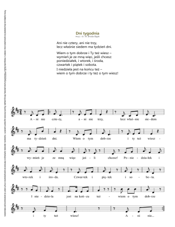Pomoc dydaktyczna dla przedszkoli do wykorzystania wraz z tekstem z miesięcznika BLIŻEJ PRZEDSZKOLA przez placówkę, która ją zakupiła. Rysunki chronione są prawami autorskimi – kopiowanie, odprzedaż, dystrybucja w internecie lub wykorzystywanie w innych celach niż przeznaczono jest niedozwolone. Dni tygodnia muz. i sł.: M. Broda-Bajak Ani nie cztery, ani nie trzy, lecz właśnie siedem ma tydzień dni. Wiem o tym dobrze i Ty też wiesz – wymień je ze mną więc, jeśli chcesz: poniedziałek, i wtorek, i środa, czwartek i piątek i sobota. I niedziela jest na końcu też – wiem o tym dobrze i ty też o tym wiesz!