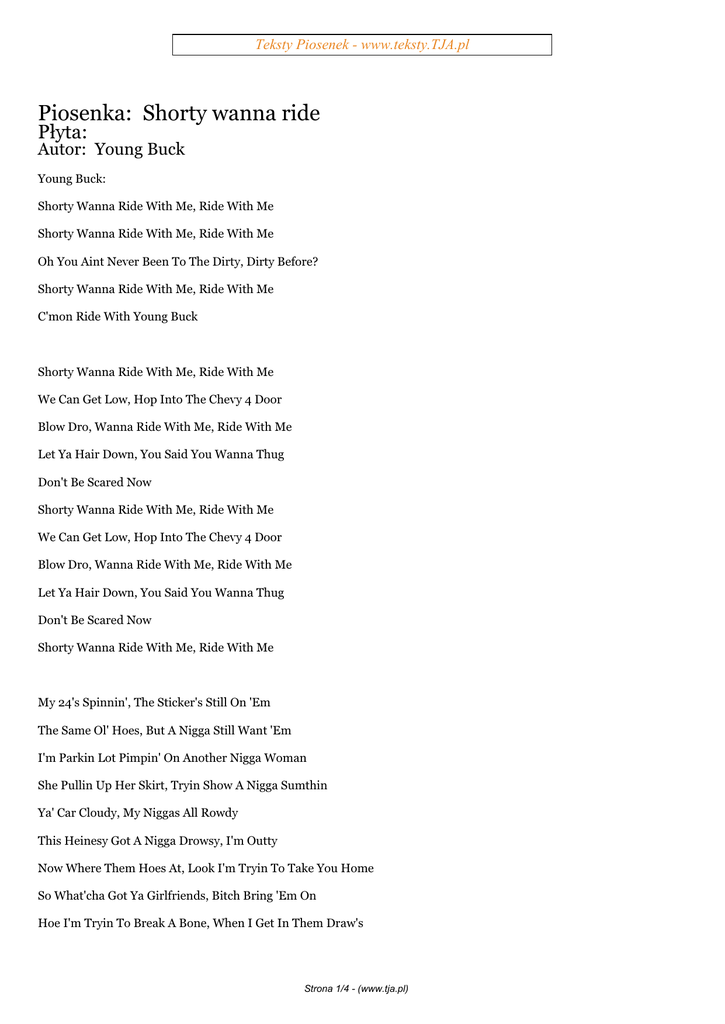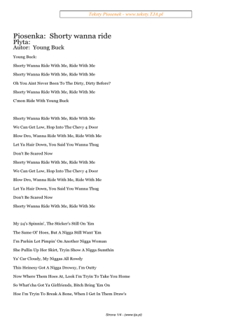 Teksty Piosenek - www.teksty.TJA.pl Piosenka: Shorty wanna ride Płyta: Autor: Young Buck Young Buck: Shorty Wanna Ride With Me, Ride With Me Shorty Wanna Ride With Me, Ride With Me Oh You Aint Never Been To The Dirty, Dirty Before? Shorty Wanna Ride With Me, Ride With Me C'mon Ride With Young Buck Shorty Wanna Ride With Me, Ride With Me We Can Get Low, Hop Into The Chevy 4 Door Blow Dro, Wanna Ride With Me, Ride With Me Let Ya Hair Down, You Said You Wanna Thug Don't Be Scared Now Shorty Wanna Ride With Me, Ride With Me We Can Get Low, Hop Into The Chevy 4 Door Blow Dro, Wanna Ride With Me, Ride With Me Let Ya Hair Down, You Said You Wanna Thug Don't Be Scared Now Shorty Wanna Ride With Me, Ride With Me My 24's Spinnin', The Sticker's Still On 'Em The Same Ol' Hoes, But A Nigga Still Want 'Em I'm Parkin Lot Pimpin' On Another Nigga Woman She Pullin Up Her Skirt, Tryin Show A Nigga Sumthin Ya' Car Cloudy, My Niggas All Rowdy This Heinesy Got A Nigga Drowsy, I'm Outty Now Where Them Hoes At, Look I'm Tryin To Take You Home So What'cha Got Ya Girlfriends, Bitch Bring 'Em On Hoe I'm Tryin To Break A Bone, When I Get In Them Draw's Strona 1/4 - (www.tja.pl) Teksty Piosenek - www.teksty.TJA.pl To The Window, To The Muthafuckin Walls What A Nigga Don't Know Wont Hurt Him' If Ya' Got A Old Man, Bitch I Ain't Worried And I Got Plenty Room If Ya Think You Wanna Roll See This Is What They Make Caddillac Trucks For Let's Go To A Place You Ain't Never Been, Down In The Country I Bet Ya, I Have Ya Sayin' Ya Love Me Shorty Wanna Ride With Me, Ride With Me We Can Get Low, Hop Into The Chevy 4 Door Blow Dro, Wanna Ride With Me, Ride With Me Let Ya Hair Down, You Said You Wanna Thug Don't Be Scared Now Shorty Wanna Ride With Me, Ride With Me We Can Get Low, Hop Into The Chevy 4 Door Blow Dro, Wanna Ride With Me, Ride With Me Let Ya Hair Down, You Said You Wanna Thug Don't Be Scared Now Shorty Wanna Ride With Me, Ride With Me She Ain't Got A Brain, The Liquor Got Right It's Aight, Cuz, You Can Be My Wife, But Only For Tonight Get Ya Ass On This Bike, I Can Show You Im'a Ryder The 600 Coupe, With The Old School Wires Geovanni Rims, With Perely's On The Tires They Said 22's Wouldn't Fit, But They Liers We Can Take A Trip To The Hood And Back Then Go And Get A Room, How Hood Is That? What'cha Waitin' On Shorty? This The Chance Of Your Life What I Mean What I See In Them Jeans, I Like You Don't Know What Your Missin', Just Quit Talkin And Listen See I'm Just Holdin Up Traffic, I'm Just Right Here Sittin' Strona 2/4 - (www.tja.pl) Teksty Piosenek - www.teksty.TJA.pl Think About It 'For I Bounce, And You Holla, I'm Wrong And Ya' See Your Best Friend, In This Impala, Ridin' On Chrome If Your Ballin In Your Money Long, You Can Relate But All Them Broke Ass Niggas Gon' Hate Shorty Wanna Ride With Me, Ride With Me We Can Get Low, Hop Into The Chevy 4 Door Blow Dro, Wanna Ride With Me, Ride With Me Let Ya Hair Down, You Said You Wanna Thug Don't Be Scared Now Shorty Wanna Ride With Me, Ride With Me We Can Get Low, Hop Into The Chevy 4 Door Blow Dro, Wanna Ride With Me, Ride With Me Let Ya Hair Down, You Said You Wanna Thug Don't Be Scared Now Shorty Wanna Ride With Me, Ride With Me You Can Bounce If You Want To, Freak If You Want To G-Unit In This Bitch, Shortayyy What You Gon' Do? Buck If You 'Bout That, I Can Make 'Em Bounce Back G-Unit In This Bitch, Shortayyy Where The South At? Bounce If You Want To, Freak If You Want To G-Unit In This Bitch, Shortayyy What You Gon' Do? Buck If You 'Bout That, I Can Make 'Em Bounce Back G-Unit In This Bitch, Shortayyy Where The South At? Wanna Ride With Me, Ride With Me Strona 3/4 - (www.tja.pl) Teksty Piosenek - www.teksty.TJA.pl We Can Get Low, Hop Into The Chevy 4 Door Blow Dro, Wanna Ride With Me, Ride With Me Let Ya Hair Down, You Said You Wanna Thug Don't Be Scared Now Shorty Wanna Ride With Me, Ride With Me We Can Get Low, Hop Into The Chevy 4 Door Blow Dro, Wanna Ride With Me, Ride With Me Let Ya Hair Down, You Said You Wanna Thug Don't Be Scared Now Shorty Wanna Ride With Me, Ride With Me ***************************************** Polecamy Strony: www.opisy.tja.pl - Codzienie nowe opisy na GG www.rozmowki.tja.pl - Śmieszne Rozmówki www.tapeciarnia.pl - Mnustwo fajnych tapet na pulpit www.teledyski.tja.pl - Zawsze najnowsze teledyski www.lol2.pl - Śmieszne Filmiki, Kabarety www.wkinach.pl - Co jest grane w kinach ? Strona 4/4 - (www.tja.pl)