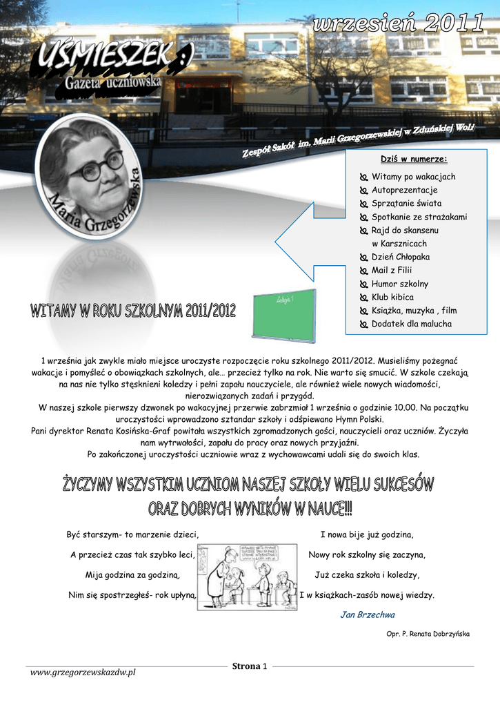 Dziś w numerze: Witamy po wakacjach Autoprezentacje Sprzątanie świata Spotkanie ze strażakami Rajd do skansenu w Karsznicach Dzień Chłopaka Mail z Filii Humor szkolny Klub kibica Książka, muzyka , film Dodatek dla malucha Kartka z kalendarza 1 września jak zwykle miało miejsce uroczyste rozpoczęcie roku szkolnego 2011/2012. Musieliśmy pożegnać wakacje i pomyśleć o obowiązkach szkolnych, ale… przecież tylko na rok. Nie warto się smucić. W szkole czekają na nas nie tylko stęsknieni koledzy i pełni zapału nauczyciele, ale również wiele nowych wiadomości, nierozwiązanych zadań i przygód. W naszej szkole pierwszy dzwonek po wakacyjnej przerwie zabrzmiał 1 września o godzinie 10.00. Na początku uroczystości wprowadzono sztandar szkoły i odśpiewano Hymn Polski. Pani dyrektor Renata Kosińska-Graf powitała wszystkich zgromadzonych gości, nauczycieli oraz uczniów. Życzyła nam wytrwałości, zapału do pracy oraz nowych przyjaźni. Po zakończonej uroczystości uczniowie wraz z wychowawcami udali się do swoich klas. Być starszym- to marzenie dzieci, I nowa bije już godzina, A przecież czas tak szybko leci, Nowy rok szkolny się zaczyna, Mija godzina za godziną, Już czeka szkoła i koledzy, Nim się spostrzegłeś- rok upłyną. I w książkach-zasób nowej wiedzy. Jan Brzechwa Opr. P. Renata Dobrzyńska www.grzegorzewskazdw.pl Strona 1 KLASA I U Z miłą chęcią przedstawić się chcemy. To my pierwszaki – najlepsi – my to wiemy! Chętni na nauki, chętni do zabawy, Chętni na wycieczki i do każdej sprawy. Trzy dziewczynki o porządek dbają Paula Budka Natalia Glinkowska I naszą salę pięknie sprzątają. Michał – rodzynek – w klasowym składzie, Dzielnie sobie radzi, nikomu nie wadzi. Wszyscy się tu lubimy i zgrany zespół tworzymy!!! Anna Krzymianowska Michał Czupryniak Wychowawca: P. Joanna Glinkowska, Pomoc nauczyciela: P. Anna Mikołajczyk DRODZY CZYTELNICY W kolejnych numerach naszej gazety chcemy prezentować wszystkie klasy. To, jak będzie wyglądała strona prezentująca Waszą klasę będzie zależało od Was. Czekamy na chętnych. www.grzegorzewskazdw.pl Strona 2 Sprzątanie Świata to międzynarodowa kampania odbywająca się na całym świcie w trzeci weekend września. Celem tej akcji jest nie tylko zbiórka i wywóz śmieci z miejsc nie przeznaczonych do składowania ich, czyli z lasów, parków, zarośli, łąk, okolic rzek, jezior, plaż, ale również podnoszenie świadomości ekologicznej nas wszystkich. W tym roku wydarzenie to przypadło na 16,17,18 września i przyświecało mu hasło Lasy to życiechrońmy je! Uczniowie naszej szkoły pod bacznym okiem wychowawców także włączyli się w akcję sprzątając teren szkoły oraz jej najbliższe otoczenie. Nasi wychowankowie zaprezentowali w ten sposób wzorową postawę i rozwinęli świadomość ekologiczną. Oby rozwijali ją przez cały rok. (Opr. P. Beata Krasowiak) W poniedziałek 19 września uczniowie naszej szkoły gościli w siedzibie Ochotniczej Straż Pożarnej. W tajniki trudnej pracy strażaków wprowadzali ich ogniomistrz Pan Sławomir Sienkiewicz i młodszy ratownik sekcyjny Pan Andrzej Różański. Uczniowie oglądali sprzęt strażacki, uczestniczyli w pokazie udzielania pierwszej pomocy, każde dziecko miało okazję usiąść za kierownicą wozu strażackiego. Panowie strażacy chętnie dzielili się z uczestnikami wycieczki własnym doświadczeniem i wspomnieniami z minionych akcji. Spotkanie to podobało się wszystkim, najbardziej chyba najmłodszym dzieciom, które nie kryjąc swojej radości szybko zaprzyjaźniły się ze strażakami i na pożegnanie uściskały ich serdecznie. (Opr. P. Ewelina Makówka) www.grzegorzewskazdw.pl Strona 3 W dniu 21 września 2011 roku odbył się pieszy rajd do Skansenu Taboru Kolejowego Zduńska Wola Karsznice. W rajdzie udział wzięli uczniowie klas I, II i III gimnazjum i klas I, II, i III szkoły zawodowej. Opiekunkami rajdu były panie: Izabela Szymczak, Katarzyna Karolczak i Ewa Sobocińska. Celem wycieczki było zwiedzanie Skansenu. Skansen urządzono na fragmencie wydzielonego torowiska. Dziś, po 14 latach istnienia, ekspozycja obejmuje 14 lokomotyw (parowych, spalinowych, elektrycznych), a także inne pojazdy i urządzenia wykorzystywane niegdyś przez PKP. Uczniowie mogli podziwiać w Karsznicach min. parowóz towarowy Ty246 produkcji amerykańskiej. To prawdziwy kolos ważący blisko 200 ton - największa lokomotywa eksploatowana przez PKP. Takie olbrzymy prowadziły głównie składy z węglem na magistrali. Duże zainteresowanie wśród uczniów wzbudziła pierwsza kolejka linowo-terenowa na Gubałówkę. (Opr. P. Katarzyna Karolczak) 30 września obchodzimy Dzień Chłopaka. Święto to powstało jako odpowiednik Dnia Kobiet. Dzień Chłopaka po raz pierwszy był obchodzony w 1999 roku na wyspach Trinidad i Tobago. Prawdopodobnie dlatego, iż jest to święto dość młode, obchodzone jest na całym świecie w różnych dniach, np. w Wielkiej Brytanii i Irlandii 5 kwietnia. Prawdopodobnie już za kilka lat będziemy obchodzić to święto jednego dnia we wszystkich krajach, póki co przyjmijmy, że obchodzone ono jest w Polsce w dniu 30 września. I w tym właśnie dniu życzmy naszym Panom, tym małym, i tym dużym wszystkiego najlepszego. (Opr. P. Renata Dobrzyńska) www.grzegorzewskazdw.pl Strona 4 Od: [email protected] Do: szkoł[email protected] Temat: U nas zmiany Witajcie! Wakacje tak szybko minęły… I znów nowy rok szkolny. U nas nastąpiły pewne zmiany. W naszej świetlicy pracują nowe osoby. Zamiast pani Kasi zajęcia dydaktyczne prowadzi pani Karolina. A pomaga jej, pani Małgosia, która zastąpiła panią Elę. Pozostały z nami pani Agnieszka, Gosia, Danusia i Jola. Odwiedzają nas również panie: Iza, Kamila i Ewelina. Jednym słowem nie ma czasu na nudę! Grupy rewalidacyjno- wychowawcze liczą ogółem 7 uczniów. Przyjaciół ze Świetlicy Środowiskowej powołanej