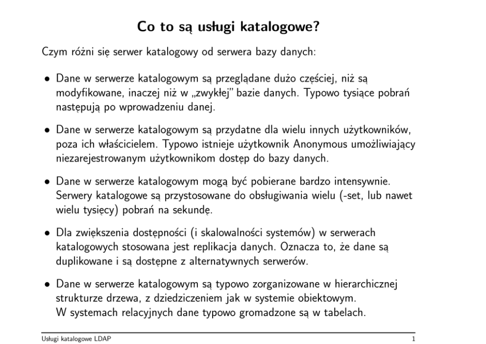 Co to sa֒ uslugi katalogowe? Czym różni sie֒ serwer katalogowy od serwera bazy danych: • Dane w serwerze katalogowym sa֒ przegla֒dane dużo cześ ֒ ciej, niż sa֒ modyfikowane, inaczej niż w zwyklej” bazie danych. Typowo tysia֒ce pobrań ” naste֒ puja֒ po wprowadzeniu danej. • Dane w serwerze katalogowym sa֒ przydatne dla wielu innych użytkowników, poza ich wlaścicielem. Typowo istnieje użytkownik Anonymous umożliwiaja֒cy niezarejestrowanym użytkownikom doste֒ p do bazy danych. • Dane w serwerze katalogowym moga֒ być pobierane bardzo intensywnie. Serwery katalogowe sa֒ przystosowane do obslugiwania wielu (-set, lub nawet wielu tysie֒ cy) pobrań na sekunde֒ . • Dla zwie֒ kszenia doste֒ pności (i skalowalności systemów) w serwerach katalogowych stosowana jest replikacja danych. Oznacza to, że dane sa֒ duplikowane i sa֒ doste֒ pne z alternatywnych serwerów. • Dane w serwerze katalogowym sa֒ typowo zorganizowane w hierarchicznej strukturze drzewa, z dziedziczeniem jak w systemie obiektowym. W systemach relacyjnych dane typowo gromadzone sa֒ w tabelach. Uslugi katalogowe LDAP 1 Struktura katalogów LDAP Katalog LDAP zawiera kolekcje֒ obiektów ulożonych hierarchicznie, w postaci struktury drzewiastej. Katalog glówny (root) jest punktem wyjściowym dla wszystkich danych przechowywanych w systemie. System nazewnictwa LDAP określa zarówno sposób identyfikacji tych obiektów jak i budowe֒ struktury drzewa. Podstawa֒ tego systemu nazewnictwa jest nazwa wyróżniona DN (distinguished name). DN jest nazwa֒ jednoznacznie określaja֒ca֒ obiekt, zbudowana֒ jako uporza֒dkowana sekwencja wzgle֒ dnych nazw wyróżnionych (RDN), odpowiadaja֒cych poszczególnym gale֒ ziom drzewa katalogu, pocza֒wszy od korzenia, np.: cn=tbarlen,o=ACMESupply,c=us. Uslugi katalogowe LDAP 2 Uslugi katalogowe LDAP 3 System nazw w katalogach LDAP Pierwotnie idea katalogu X.500 zakladala, że w korzeniu drzewa katalogu be֒ dzie kraj. W tym systemie nazwa֒ wyróżniona֒ przykladowej firmy zlokalizowanej w Polsce moglaby być: o=palnet, c=pl Rozwój Internetu spopularyzowal nazwy domenowe wraz z calym systemem ich nadawania. W zwia֒zku z tym pojawila sie֒ tendencja do wykorzystania domenowych nazw organizacji w tworzeniu nazw wyróżnionych katalogów LDAP. Wtedy nazwa powyższej przykladowej firmy mialaby postać: o=palnet.pl, c=pl Wada֒ tego systemu jest ... przywia֒zanie do nazwy kraju leża֒ce u podstaw idei nazewnictwa X.500 ponieważ po pierwsze nazwa (kod) kraju sie֒ powtarza w nazwie wyróżnionej obiektu, a poza tym wiele organizacji ma charakter ponadkrajowy, i konieczność wla֒czenia kraju do nazwy obiektu jest klopotliwa i może być myla֒ca. Na dodatek organizacje amerykańskie sa֒ uprzywilejowane w internetowym systemie domen (nie korzystaja֒ z kodu kraju), ale z kolei wiele organizacji nieamerykańskich korzysta z domen internetowych .com lub .org. W zwia֒zku z tym stosuje sie֒ również system nazw oparty ściśle na domenach internetowych, i tylko na nich, w postaci uporza֒dkowanego cia֒gu wzgle֒ dnych nazw wyróżnionych: dc=palnet, dc=pl Uslugi katalogowe LDAP 4 Model danych w katalogach LDAP Uslugi katalogowe LDAP 5 dn: o=palnet.pl, c=pl o: palnet.pl objectclass: top objectclass: organization dn: ou=People, o=palnet.pl, c=pl ou: People objectclass: top objectclass: organizationalunit dn: ou=Development, o=palnet.pl, c=pl ou: Development objectclass: top objectclass: organizationalunit dn: cn=Witold Paluszynski, ou=People, o=palnet.pl, c=pl cn: Witold Paluszynski sn: Paluszynski givenname: Witold uid: witold mail: [email protected] userpassword: lubudubu title: The Boss objectclass: top objectclass: person ou: Zarzad Spolki ou: People postalAddress:Plac Grunwaldzki 99, Wroclaw postalCode:50-123 telephoneNumber:48 71 123457 dn: ou=Software, ou=Development, o=palnet.pl, c=pl ou: Software objectclass: top objectclass: organizationalunit Uslugi katalogowe LDAP 6 Format zapisu danych LDIF Istnieje uniwersalnie przyje֒ ty format tekstowy zapisu obiektów katalogu LDAP. Format ten zwany jest LDIF (LDAP Data Interchange Format) i jest on przydatny do ladowania wie֒ kszej ilości danych, a także innych operacji wykonywanych np. automatycznie ze skryptów. Struktura pojedynczego wpisu w pliku LDIF jest naste֒ puja֒ca: dn: <distinguished name> <attrtype> : <attrvalue> <attrtype> : <attrvalue> ... Wiersz w pliku LDIF może być kontynuowany przez rozpocze֒ cie kolejnego wiersza spacja֒ lub tabem. Kolejne wpisy w pliku LDIF oddzielone sa֒ pojedynczym pustym wierszem (wie֒ cej niż jeden pusty wiersz traktowany jest jako logiczny koniec pliku). Uslugi katalogowe LDAP 7 Schematy danych w katalogach LDAP Schematem danych nazywamy zestaw regul określaja֒cych: • • • • atrybuty dozwolone dla obiektów danej klasy atrybuty wymagane sposób porównywania wartości atrybutów, np. case-independent ograniczenia na wartości atrybutów, np. przedzialy liczbowe Korzystanie ze schematów pozwala na: • utrzymanie jakości i spójności danych • ograniczenie duplikacji danych • atrybut klasy obiektu określa reguly schematu, do których obiekt musi sie stosować Uslugi katalogowe LDAP 8 Typy danych w katalogach LDAP Uslugi katalogowe LDAP 9 Przeszukiwanie w katalogach LDAP Operacja przeszukiwania katalogu LDAP wymaga określenia elementów: baza — obiekt w drzewie katalogu od którego należy rozpoczać ֒ przeszukiwanie zakres — cześć ֒ drzewa, które należy przeszukać: tylko obiekt bazowy, pojedynczy poziom pod obiektem, lub pelne poddrzewo pod obiektem filtr przeszukiwania — warunek, który musza֒ spelniać obiekty wyszukiwane, zadawany jako wyrażenie logiczne na wartościach atrybutów atrybuty zwracane — które wartości należy pokazać dla znalezionych obiektów; możliwe jest także zwrócenie samych nazw atrybutów, bez wartości rozwiazywanie aliasów — określa czy w czasie przeszukiwania obiektu, kt