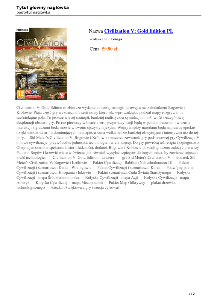 Tytuł główny nagłówka podtytuł nagłówka Nazwa Civilization V: Gold Edition PL wydawca PL: Cenega Cena: 59.90 zł Civilization V: Gold Edition to zbiorcze wydanie kultowej strategii turowej wraz z dodatkiem Bogowie i Królowie. Piąta część gry wyznacza dla serii nowy kierunek, wprowadzając podział mapy rozgrywki na sześciokątne pola. To jeszcze więcej strategii, bardziej realistyczna symulacja i możliwość szczegółowej eksploracji obszaru gry. Po raz pierwszy w historii serii przywódcy nacji będą w pełni animowani i w czasie interakcji z graczami będą mówić w swoim ojczystym języku. Wojny między narodami będą naprawdę epickie dzięki widokowi armii dominujących na mapie, a sama walka będzie bardziej ekscytująca i intensywna niż do tej pory. Sid Meier’s Civilization V: Bogowie i Królowie rozszerza zawartość gry podstawowej gry Cywilizacja V o nowe cywilizacje, przywódców, jednostki, technologie i wiele więcej. Do gry powrócą też religia i szpiegostwo. Obejmując szerokie spektrum historii ludzkości, dodatek Bogowie i Królowie pozwoli graczom założyć pierwszy Panteon Bogów i krzewić wiarę w świecie, jak również wysyłać szpiegów do innych miast, by zawierać sojusze i kraść technologie. Civilization V: Gold Edition - zawiera gra Sid Meier's Civilization V dodatek Sid Meier's Civilization V: Bogowie i Królowie Pakiet Cywilizacji: Babilon (Nabuchodonozor II) Pakiet Cywilizacji i scenariusza: Dania - Wikingowie Pakiet Cywilizacji i scenariusza: Korea Podwójny pakiet Cywilizacji i scenariusza: Hiszpania i Inkowie Pakiet scenariusza Cuda Świata Starożytnego Kołyska Cywilizacji - mapa Śródziemnomorska Kołyska Cywilizacji - mapa Azji Kołyska Cywilizacji - mapa Ameryk Kołyska Cywilizacji - mapa Mezopotamii Pakiet Map Odkrywcy plakat drzewka technologicznego ścieżka dźwiękowa z gry (wersja cyfrowa) 1/2 Tytuł główny nagłówka podtytuł nagłówka Nazwa Wartość Wydawca PL Cenega Poland Data premiery 1-go marca 2013 Producent Tryb gry Kategoria wiekowa Wersja językowa Wymagania sprzętowe Format Firaxis Games Single / Multiplayer 12+ PL / ENG Core 2 Duo, 2 GB RAM, karta grafiki 256 MB (GeForce 790 1xDVD 2/2