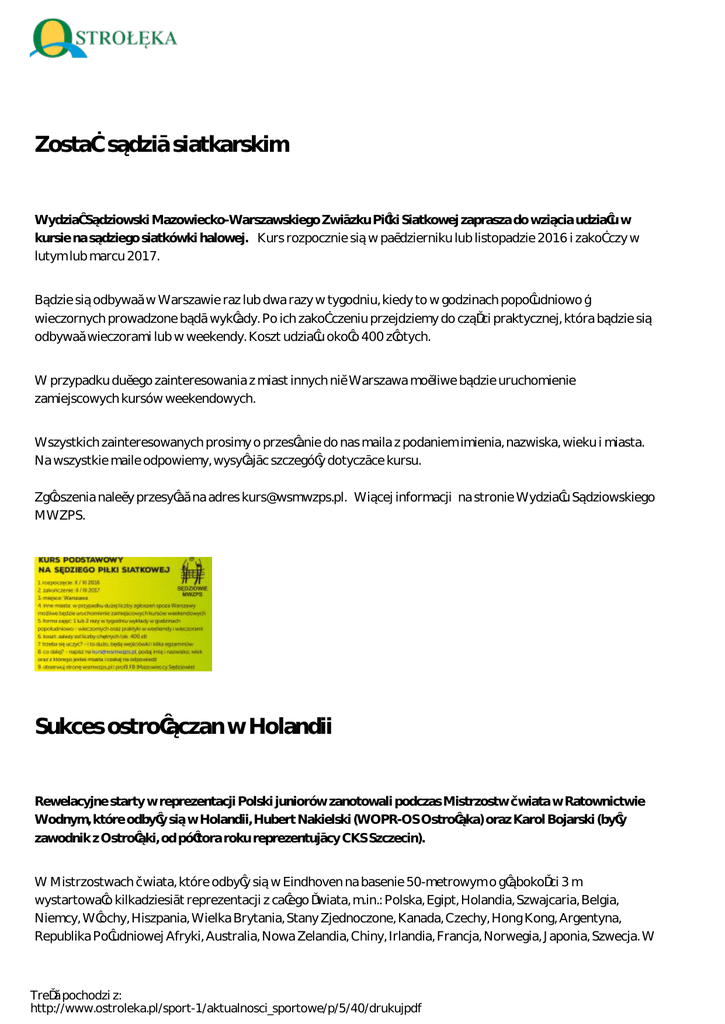 Zostań sędzią siatkarskim Wydział Sędziowski Mazowiecko-Warszawskiego Związku Piłki Siatkowej zaprasza do wzięcia udziału w kursie na sędziego siatkówki halowej. Kurs rozpocznie się w październiku lub listopadzie 2016 i zakończy w lutym lub marcu 2017. Będzie się odbywać w Warszawie raz lub dwa razy w tygodniu, kiedy to w godzinach popołudniowo – wieczornych prowadzone będą wykłady. Po ich zakończeniu przejdziemy do części praktycznej, która będzie się odbywać wieczorami lub w weekendy. Koszt udziału około 400 złotych. W przypadku dużego zainteresowania z miast innych niż Warszawa możliwe będzie uruchomienie zamiejscowych kursów weekendowych. Wszystkich zainteresowanych prosimy o przesłanie do nas maila z podaniem imienia, nazwiska, wieku i miasta. Na wszystkie maile odpowiemy, wysyłając szczegóły dotyczące kursu. Zgłoszenia należy przesyłać na adres [email protected]. Więcej informacji na stronie Wydziału Sędziowskiego MWZPS. Sukces ostrołęczan w Holandii Rewelacyjne starty w reprezentacji Polski juniorów zanotowali podczas Mistrzostw Świata w Ratownictwie Wodnym, które odbyły się w Holandii, Hubert Nakielski (WOPR-OS Ostrołęka) oraz Karol Bojarski (były zawodnik z Ostrołęki, od półtora roku reprezentujący CKS Szczecin). W Mistrzostwach Świata, które odbyły się w Eindhoven na basenie 50-metrowym o głębokości 3 m wystartowało kilkadziesiąt reprezentacji z całego świata, m.in.: Polska, Egipt, Holandia, Szwajcaria, Belgia, Niemcy, Włochy, Hiszpania, Wielka Brytania, Stany Zjednoczone, Kanada, Czechy, Hong Kong, Argentyna, Republika Południowej Afryki, Australia, Nowa Zelandia, Chiny, Irlandia, Francja, Norwegia, Japonia, Szwecja. W Treść pochodzi z: http://www.ostroleka.pl/sport-1/aktualnosci_sportowe/p/5/40/drukujpdf składzie naszej reprezentacji wystąpiło czterech najlepszych zawodników w Polsce: oprócz wcześniej wymienionych Huberta i Karola byli to także Klaudiusz Matura ze śląskiego WOPR oraz Paweł Borycki z dolnośląskiego WOPR. W tych prestiżowych zawodach reprezentant WOPR-OS Ostrołęka startował w trzech konkurencjach indywidualnych: 200 m z przeszkodami, 100 m ratownik, 100 m holowanie manekina w płetwach, a także w trzech sztafetach: 4x50 m z przeszkodami, 4x25 holowanie manekina oraz 4x50 m z pasem ratowniczym. Podopieczny Dariusza Małkowskiego, mimo że był najmłodszym zawodnikiem reprezentacji i jednym z najmłodszych zawodników biorących udział w mistrzostwach, w swoich startach pokazał, ze już teraz należy do najlepszych juniorów na świecie w sportowym ratownictwie wodnym. Również Karol Bojarski odnotował rewelacyjny start w mistrzostwach. Były zawodnik z Ostrołęki oprócz startu w konkurencjach sztafetowych wystąpił także w konkurencjach indywidualnych: 50 m holowanie manekina, 100 m kombinowane, 100 m ratownik. Najważniejsze i najbardziej godne uwagi jest zdobycie przez Huberta i Karola, wspólnie z kolegami z reprezentacji, tytułów mistrzów świata w konkurencji 4x25 m holowanie manekina, gdzie do rekordu świata zabrakło im zaledwie 0,37 s oraz tytułów wicemistrzów świata w konkurencji 4x50 m z przeszkodami. W sztafecie 4x50 m z pasem, pomimo że w kwalifikacjach reprezentacja Polski osiągnęła drugi czas, to podczas startu finałowego uplasowała się na 5. miejscu, co także jest dużym osiągnięciem. Również starty indywidualne Huberta były bardzo dobre. W konkurencji 200 m z przeszkodami podczas eliminacji Hubert uzyskał czas 2:06.62 s i ustanowił swój nowy rekord życiowy, poprawiając stary o prawie pięć sekund. Czas ten pozwolił mu zakwalifikować się do finału A, gdzie zajął 8. miejsce. W konkurencji 100 m ostrołęcki ratownik zajął czwarte miejsce w finale B i w sumie 12. miejsce. W konkurencji 100 m holowanie manekina w płetwach w eliminacjach ustanowił swój nowy rekord życiowy 0:54.43 s, który dał mu siedemnaste miejsce. Starty indywidualne Karola były również bardzo udane. Dotyczy to zwłaszcza jego startu na 50 m w konkurencji holowanie manekina, gdzie zajął 4. miejsce. W starcie na 100 m kombinowane Karol zajął 7. miejsce, a na 100 uplasował się na 15. miejscu. – Jestem bardzo dumny z postawy i wyników osiągniętych przez Huberta. Oczywiście najbardziej cieszą tytuły mistrza i wicemistrza świata, ale także pozostałe starty należy uznać za bardzo udane, tym bardziej, że poprawione zostały rekordy życiowe. Dla Huberta to był podwójny debiut: pierwszy start w reprezentacji Polski oraz pierwszy start na zawodach międzynarodowych, i to od razu na Mistrzostwach Świata Juniorów. Te znakomite wyniki świadczą, że poświęcenie czasu na trening przygotowujący do mistrzostw kosztem wakacji i urlopu bardzo się opłacało. Po ostatnim sukcesie reprezentantów WOPR-OS na Mistrzostwach Polski, sukces Huberta na Mistrzostwach Świata jest potwierdzeniem, że plan treningowy, który realizuję z zawodnikami idzie w dobrym kierunku – powiedział Dariusz Małkowski trener WOPR-OS Ostrołęka. Treść pochodzi z: http://www.ostroleka.pl/sport-1/aktualnosci_sportowe/p/5/40/drukujpdf Treść pochodzi z: http://www.ostroleka.pl/sport-1/aktualnosci_sportowe/p/5/40/drukujpdf Zmarł trener ostrołęckich sztangistów W miniony piątek pożegnaliśmy Stanisława Piaszczyńskiego, założyciela Sekcji Podnoszenia Ciężarów przy MZKS „Narew” w 1962 roku. Wieloletni trener i wychowawca wielu zawodników zmarł 7 września w wieku 74 lat. Spod ręki Stanisława Piaszczyńskiego wyszedł Jan Niedźwiecki – siedmiokrotny Mistrz Polski Juniorów i Seniorów w latach 1970-1985, także siedmiokrotny rekordzista Polski. Oprócz niego wychowankami zmarłego trenera byli tacy zawodnicy, jak Zbigniew Janczewski, Kazimierz Kubot, Andrzej Stolarczyk, Adam Pawłowski oraz bracia Zbigniew, Witold i Zenon Gromkowie. W okresie swojej sportowej aktywności Stanisław Piaszczyński był także wiceprezesem i sek
