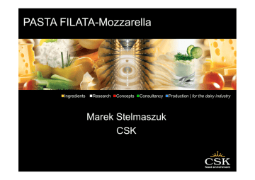 PASTA FILATA-Mozzarella Osada Karbówko Ingredients Research Concepts Consultancy Marek Stelmaszuk CSK Production | for the dairy industry PASTA FILATA-Mozzarella Termin „pasta filata” (ser uplastyczniany) obejmuje szeroką gamę serów bazujących na procesie produkcji oryginalnej włoskiej mozzarelli. Obecnie dotyczy on tradycyjnych produktów, jak również produkowanych przemysłowo. Do grupy tej należą między innymi takie produkty jak: MOZZARELLA, PROVOLONE i CACIOCAVALLO. Sery te produkowane są w oparciu o specyficzną technikę produkcji i dodatki. Najpopularniejszym spośród nich jest MOZZARELLA, której nazwa wywodzi się od włoskiego słowa „mozzare” co oznacza „do krojenia”. PASTA FILATA-Mozzarella • Pod względem wartości sprzedaży sery te w ostatnich latach stanowią jedną z najdynamiczniej rozwijających się grup produktów mleczarskich. • Trend ten przypisany jest głównie upowszechnionej kulturze fast food oraz rosnącej powszechności wykorzystania serów jako składników żywności. • Serwatka z produkcji mozzarelli jest pozbawiona barwnika, konserwantów (saletra, lizozym) PASTA FILATA-Mozzarella PASTA FILATA-Mozzarella Proces produkcji - PASTA FILATA - Mozarella PASTERYZACJA - 72-74°C / 15 sec. - Mozarella miękka –S Mozarella do pizzy – S+C49l Temperatura - 37 / 38°C - Ilość podpuszczki dobrać tak aby skrzep uzyskać po 30-35min Milaze 600ml/10tyś - Mozarella: do pizzy :30-min; miękka 40min - 15min - 10-15min - Na stole lub w wannie pod lustrem serwatki do momentu osiągnięcia pH 5,15-5,2 ⇓ ZASZCZEPIANIE ⇓ DODATEK PODPUSZCZKI ⇓ KOAGULACJA ⇓ KROJENIE SKRZEPU ⇓ OSUSZANIE ⇓ - Temp 41°C DOGRZEWANIE - Czas - ok. 5min ⇓ DOSUSZANIE DOKWASZANIE ⇓ - ok.. 10-15min czas zależy od stopnia osuszenia - Temp. Wody - max 85°C UPLASTYCZNIANIE ⇓ OCHŁADZANIE - pH gotowego produktu - 5,2 - 5,4 ⇓ SOLENIE - Solenie w solance PASTA FILATA-Mozzarella MOZZARELLA ŚWIEŻA MOZZARELLA DO PIZZY Szczepionka S 100; 200; 300; 1000 Szczepionka S 100; 200; 300; 1000; 811; 906 Lub w kombinacji z +C 49 lub L Czas uzyskania pH 5,2 wynosi około 4.5-5h Czas uzyskania pH 5,2 wynosi około 3.5-4h -kontrolowany rozkład cukrów PASTA FILATA-Mozzarella • Korzyści wynikające z użycia systemów (DVI) do bezpośredniego zaszczepiania mleka: -optymalny proces ukwaszania, pewność i powtarzalność; -wygoda w użyciu i ograniczenie ryzyka zakażenia fagami; -łatwość użycia i możliwość kontroli procesu produkcji; -możliwość zoptymalizowania kosztów.. PASTA FILATA-Mozzarella