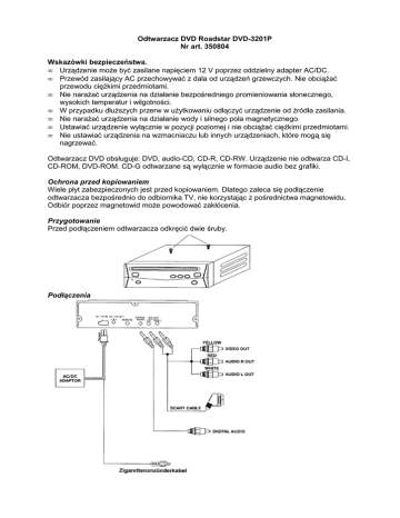 Odtwarzacz DVD Roadstar DVD-3201P Nr art. 350804 Wskazówki bezpieczeństwa. • Urządzenie może być zasilane napięciem 12 V poprzez oddzielny adapter AC/DC. • Przewód zasilający AC przechowywać z dala od urządzeń grzewczych. Nie obciążać przewodu ciężkimi przedmiotami. • Nie narażać urządzenia na działanie bezpośredniego promieniowania słonecznego, wysokich temperatur i wilgotności. • W przypadku dłuższych przerw w użytkowaniu odłączyć urządzenie od źródła zasilania. • Nie narażać urządzenia na działanie wody i silnego pola magnetycznego. • Ustawiać urządzenie wyłącznie w pozycji poziomej i nie obciążać ciężkimi przedmiotami. • Nie ustawiać urządzenia na wzmacniaczu lub innych urządzeniach, które mogą się nagrzewać. Odtwarzacz DVD obsługuje: DVD, audio-CD, CD-R, CD-RW. Urządzenie nie odtwarza CD-I, CD-ROM, DVD-ROM. CD-G odtwarzane są wyłącznie w formacie audio bez grafiki. Ochrona przed kopiowaniem Wiele płyt zabezpieczonych jest przed kopiowaniem. Dlatego zaleca się podłączenie odtwarzacza bezpośrednio do odbiornika TV, nie korzystając z pośrednictwa magnetowidu. Odbiór poprzez magnetowid może powodować zakłócenia. Przygotowanie Przed podłączeniem odtwarzacza odkręcić dwie śruby. Podłączenia Pilot zdalnego sterowania. 1. 2. 3. 4. 5. 6. POWER – przełącznik zał./wył. 0 –9 – wybór wskaźników menu. GOTO – przejście do pożądanego utworu lub sceny. ■ - zatrzymanie odtwarzania. (◄) (◄◄)/ (►) (►►) – przyśpieszone przewijanie do przodu i do tyłu. (▲) (►►I)/ (▼)(I◄◄) – przejście do kolejnej sceny lub utworu. W module menu przejście do wybranego punktu menu. 7. SUBTITLE – zmiana języka napisów na inny dostępny język lub wyłączenie funkcji napisów. 8. SETUP - wskazuje menu ustawienia. 9. TITLE – wskazuje tytuł odtwarzanej płyty. 10. DISPLAY – wskazuje informacje o tytule, scenie odtwarzanej płyty. 11. REPEAT – powtórzenie części lub całego utworu, tytułu ,sceny jednej płyty. 12. (►║) zatrzymanie aktualnego odtwarzania. Nacisnąć ponownie, aby powrócić do normalnego odtwarzania. 13. SLOW – odtwarzanie w zwolnionym tempie. 14. ENTER – wybór/ potwierdzenie opcji menu i rozpoczęcie odtwarzania. 15. AUDIO – zmiana języka audio na jeden z dostępnych języków 16. ANGLE – dostęp do nagrania z różnych punktów (jeżeli dysk wspomagany jest kamerą). 17. MENU –wskazuje menu odtwarzanej płyty. Włożenie baterii. 1. Otworzyć pojemnik baterii. 2. Włożyć 2 nowe baterie Micro LR03, zwracając uwagę na prawidłowe rozmieszczenie biegunów. 3. Zamknąć pojemnik baterii. Użytkowanie pilota. Zasięg działania pilota wynosi 6 m, przy kącie 60 st. od przedniej strony urządzenia. Proces odtwarzania bazowego. Włożenie płyty DVD/CD. 1. Nacisnąć POWER (1). 2. Wsunąć płytkę w kieszeń DVD/CD (2). 3. Urządzenie rozpocznie automatycznie odtwarzanie. Funkcja wyrzutu płyty. Nacisnąć przycisk EJECT (3). Wskazówki bezpieczeństwa dotyczące podłączeń DC IN/OUT. 1. Tryb działania stacjonarnego ( w domu). Przy podłączaniu odtwarzacza w domu poprzez oddzielny adapter, należy korzystać z gniazda ONLY DC IN (5). Przy jednoczesnym wykorzystaniu gniazd DC IN/OUT może dojść do przeciążenia i uszkodzenia odtwarzacza. 2. Tryb działania przenośnego Zasilanie poprzez gniazdo 12 V AC 3. Użytkowanie przewodu zasilającego AC. Podłączyć terminal czerwonego przewodu do gniazda 12 V, a terminal czarnego przewodu do uziemienia. 4. Podłączenie przewodu AC do gniazda samochodu. Przed dokonaniem połączeń skontaktować się z wykwalifikowaną osobą. Podłączenia. Podłączenie odtwarzacza DVD do odbiornika TV. 1. Podłączyć kabel audio między gniazdem AUDIO OUT L i R na tylniej stronie odtwarzacza DVD i gniazdem telewizora AUDIO –IN. 2. Podłączyć kabel video między gniazdem VIDEO OUT na tylniej stronie odtwarzacza i gniazdem telewizora VIDEO IN. Uwaga: odtwarzacz DVD należy podłączać bezpośrednio do telewizora. W przypadku podłączenia poprzez magnetowid mogą występować zakłócenia. Podłączenie do samochodowego systemu audio. 1. Podłączyć kabel audio między gniazdem AUDIO OUT L i R na tylniej stronie odtwarzacza i gniazdem AUDIO IN systemu audio. 2. Podłączyć przewód video między gniazdem VIDEO OUT na tylniej stronie odtwarzacza i gniazdem VIDEO IN odbiornika TV. Uwaga: Jeżeli odtwarzacz DVD podłączony jest do innych urządzeń, przed dokonaniem połączeń należy upewnić się, czy aparat jest wyłączony i wszystkie inne części odłączone są od sieci. Procesy odtwarzania bazowego DVD. Przygotowanie odtwarzania DVD. Upewnić się, czy odtwarzacz został prawidłowo podłączony do systemu TV i audio. Włączyć zasilanie urządzenia. Odtwarzanie płyt DVD. 1. Nacisnąć przycisk POWER. 2. Umieścić płytę w kieszeni odtwarzacza. 3. Nacisnąć przycisk PLAY. Urządzenie rozpocznie odtwarzanie w zależności od aktualnego modułu programu. 1. Płyta będzie automatycznie odtwarzana 2. Menu płyty zostanie wskazane na wyświetlaczu. Przyciskami strzałek lub przyciskami numerycznymi wybrać opcję menu i nacisnąć ENTER, odtwarzanie zostanie rozpoczęte. STOP: nacisnąć ten przycisk, aby odtwarzanie zostało zatrzymane. Nacisnąć ENTER, aby odtworzyć płytę DVD z pozycji STOP. Nacisnąć STOP dwa razy i ponownie ENTER, płyta będzie odtwarzana. PAUSE: Nacisnąć ten przycisk, aby odtwarzanie chwilowo zatrzymać. Nacisnąć przycisk PLAY/PAUSE ponownie, aby kontynuować odtwarzanie. Uwaga: po minucie od zatrzymania odtwarzania, urządzenie przejdzie do modułu wygaszacza ekranu. Podgląd modułu odtwarzania. Nacisnąć przycisk DISPLAY. • DVD –aktualny tytuł, scena i upływający czas zostaną wskazane na wyświetlaczu. Za każdym naciśnięciem przycisku DISPLAY, wskazane zostaną następujące informacje: pozostały czas tytułu, miniony czas sceny, pozostały czas 